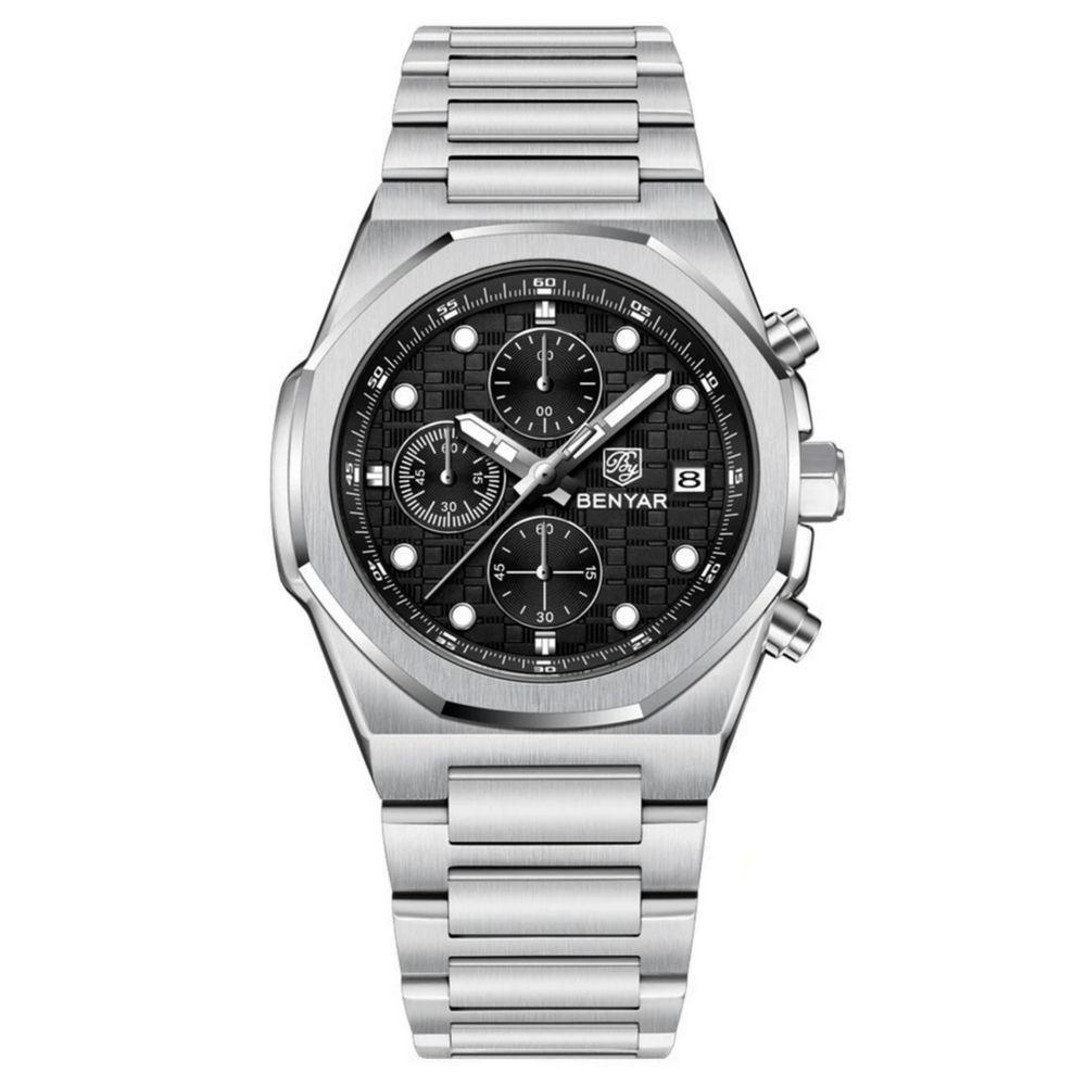 Relógio Masculino Quartzo Com Cronógrafo Aço Inoxidável A Prova D'agua PrataDescubra o encanto irresistível , onde a excelência em design encontra funcionalidade indiscutível. Este relógio de pulso cronógrafo é a escolha definitiva para o homem moderno que valoriza tanto a estética quanto o desempenho. Com um mostrador impressionante que exibe detalhes intricados, ele oferece não apenas o horário, mas também uma experiência visual inigualável que complementa qualquer ocasião.Fabricado com aço inoxidável , este relógio alia resistência e sofisticação. Seu mostrador de vidro Hardlex garante uma durabilidade excepcional, enquanto a resistência à água de até 3ATM o torna ideal para o uso diário, mesmo em ambientes desafiadores. A funcionalidade luminosa assegura visibilidade em condições de pouca luz, conferindo um toque de modernidade e praticidade que não passa despercebido.Especificações:[Alta Resiliência] O aço inoxidável usado tanto no material da pulseira quanto no estojo proporciona não apenas um visual robusto, mas também uma durabilidade inigualável, garantindo que este relógio seja um companheiro fiel por muitos anos.[Precisão Japonesa] Equipado com movimento quartzo de origem japonesa, ele assegura uma medição de tempo precisa, enquanto o cronógrafo sofisticado adiciona funcionalidade prática para o dia a dia de um homem ativo.[Multifuncionalidade] Com características como data automática, calendário completo e cronômetro, este relógio é mais do que um adorno estético; é uma ferramenta essencial para a gestão eficaz do seu tempo.[Conforto Luxuoso] A largura da banda varia de 25 a 29mm, proporcionando um ajuste confortável, enquanto o fechamento dobrável com segurança oferece facilidade de uso sem comprometer a elegância.[Estilo Luminoso] As mãos luminosas permitem leitura clara em qualquer ambiente, reforçando o perfil de um acessório sofisticado que se destaca pela funcionalidade tanto quanto pelo design.