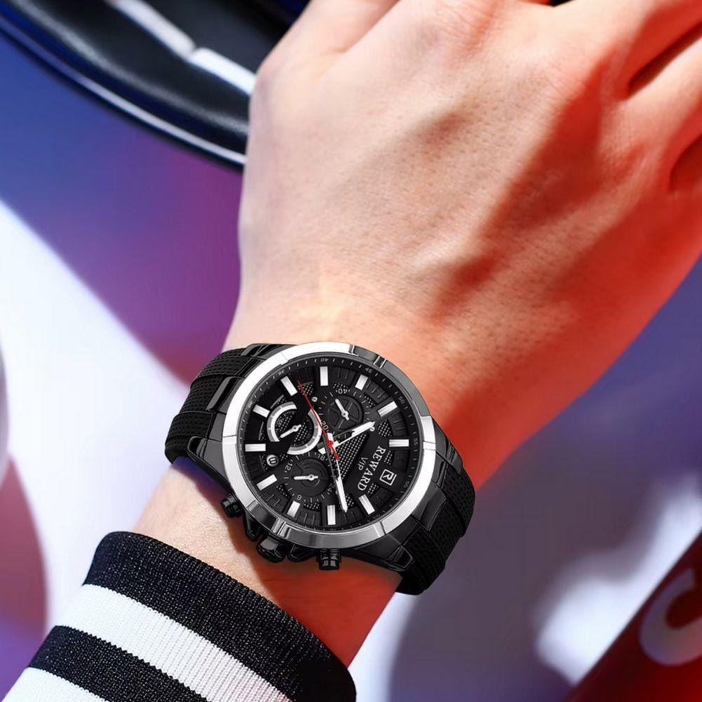 Relógio De Pulso Masculino Analógico Rà Prova D´agua Esportivo PretoDescubra a elegância e funcionalidade com este relógio de pulso masculino que combina estilo e praticidade de maneira impecável. Com um design analógico sofisticado, este relógio esportivo de luxo acomoda-se confortavelmente no pulso, destacando sua personalidade em qualquer ocasião. Perfeito para homens modernos que valorizam tanto a estética quanto a durabilidade, este acessório é um verdadeiro distintivo de gosto apurado e prestígio.Além de seu visual deslumbrante, o relógio oferece resistência à água de até 3 Bar, adaptando-se perfeitamente a um estilo de vida ativo. Equipado com um movimento de quartzo confiável e mãos luminosas, ele garante precisão em qualquer situação, seja em reuniões profissionais ou aventuras ao ar livre. Sua pulseira de silicone proporciona conforto e flexibilidade, enquanto o mostrador com proteção Hardlex assegura a durabilidade necessária no dia a dia. Especificações:[Elegância no design] Este relógio mistura materiais de alta qualidade e um visual analógico-digital que proporciona uma sensação de moda e casualidade, ideal para qualquer ocasião.[Precisão absoluta] Equipado com movimento de quartzo, este relógio garante uma medição precisa do tempo, essencial para homens que valorizam pontualidade.[Resistência confiável] Sua construção à prova d'água resiste a pressões de até 3 Bar, permitindo que você o use em condições úmidas com tranquilidade.[Conforto extremo] A pulseira de silicone oferece um toque suave, garantindo que você use o relógio por longos períodos sem incômodos, enquanto o fecho tipo gancho fivela mantém a segurança.[Funcionalidade adicional] Apresenta calendário completo e mãos luminosas para visualização clara em qualquer ambiente, dia ou noite.