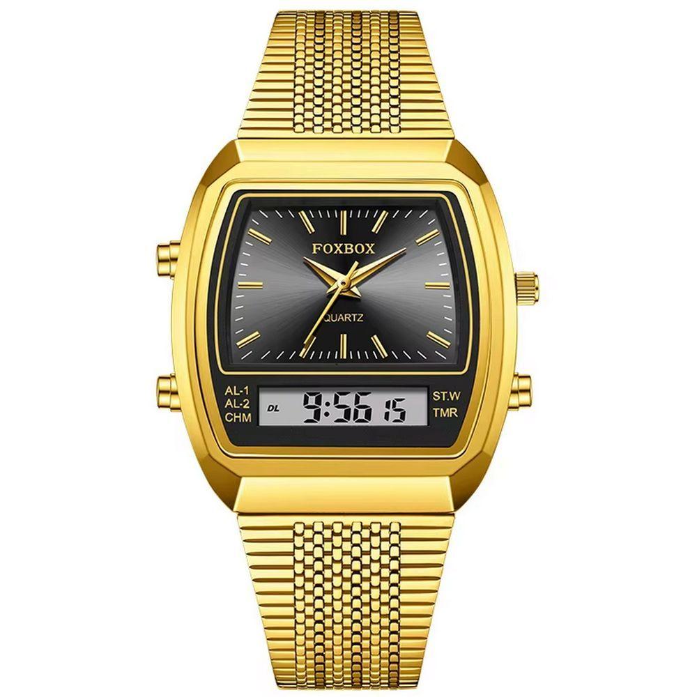 Relógio Esportivo Digital à Prova Dágua Em Aço Inoxidavel Masculino Preto DouradoDescubra a perfeita fusão entre tecnologia e estilo, um relógio de luxo que redefine o conceito de moda e funcionalidade para homens modernos. Este relógio digital é a sua melhor companhia em qualquer ocasião, combinando um design esportivo com a elegância necessária para se destacar em qualquer ambiente, seja no trabalho ou em aventuras ao ar livre. Com sua construção robusta e características inovadoras, este acessório é mais do que um simples marcador de tempo — é uma verdadeira declaração de estilo e eficiência.Cada detalhe foi cuidadosamente pensado para atender às suas necessidades. Equipado com uma tela de LED que oferece clareza incomparável, mesmo em condições de baixa luz, e um revestimento à prova d'água que garante proteção até 3 Bar de profundidade. A pulseira de aço inoxidável não só proporciona um ajuste confortável, mas também exala uma durabilidade excepcional. Este relógio de moda não é apenas um acessório, mas sim, um símbolo de sofisticação para o homem atual. Especificações[Resistência e Estilo] apresenta uma espessura de 11mm e um design tonneau, harmonizando durabilidade com um visual moderno.[Sofisticação Digital] Integrado com um mostrador digital de 40mm, ele oferece precisão com a suavidade de um toque futurista.[Praticidade Impecável] Equipado com um fecho dobrável com segurança, garante praticidade sem sacrificar o estilo, ideal para o homem em constante movimento.[Tecnologia Avançada] Seu movimento digital, combinado com funções como cronógrafo e exibição de semana, transforma-o em uma ferramenta imprescindível para otimizar o seu tempo.[Design à Prova] Com uma resistência à água de até 3 Bar e uma tela de hardlex, este relógio está preparado para acompanhar todas as suas aventuras diárias.