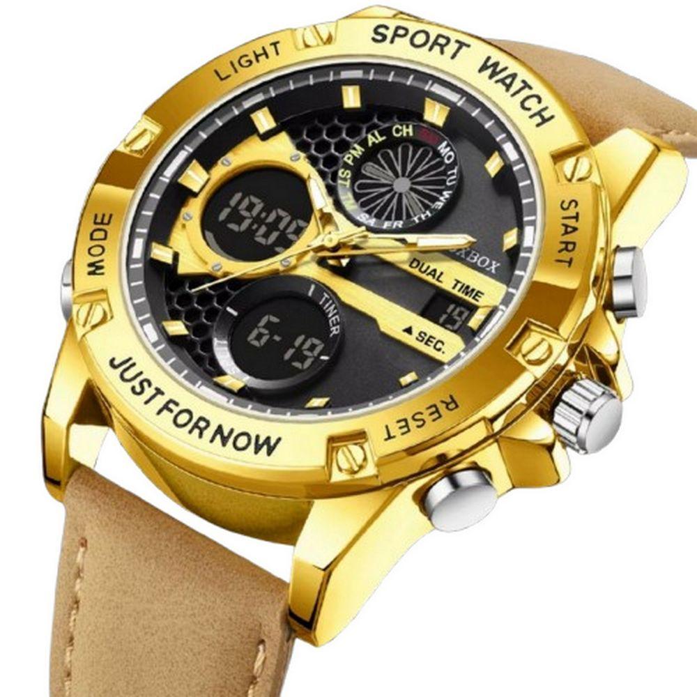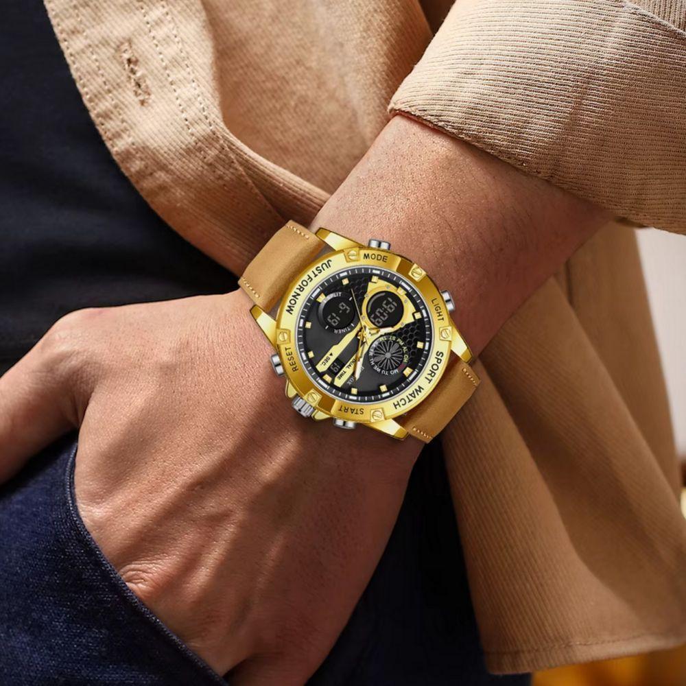 Relógio Digital Esportivo Quartzo Display Duplo á Prova D´agua Preto DouradoDescubra a combinação perfeita entre sofisticação e tecnologia com este relógio masculino de quartzo e display digital. Elegante e versátil, este acessório foi projetado para atender ao homem moderno que busca aliar estilo e funcionalidade no dia a dia. Com um design robusto e arrojado, o relógio apresenta um mostrador analógico-digital envolto por um resistente material em liga, garantindo não só uma estética ousada, mas também uma resistência excepcional.Concebido para o homem ativo, o relógio é à prova d'água até 3Bar, ideal para enfrentar as intempéries. A pulseira de couro complementa seu visual distinto, proporcionando conforto e durabilidade. Perfeito para qualquer ocasião, seja em momentos casuais ou ocasiões especiais, este relógio se adapta perfeitamente, destacando seu bom gosto e senso de moda. Especificações [Mostrador Dual]: Equipado com um mostrador analógico-digital, este relógio oferece a conveniência de uma leitura rápida e precisa, combinando o clássico e o moderno em um único item. [Funcionalidades Impressionantes]: Abrangendo desde alarme, cronógrafo e calendário completo a mãos luminosas e display LED, este relógio torna-se um parceiro indispensável em sua rotina diária. [Conforto Duradouro]: Com uma pulseira de 25cm feita de couro macio e robusto, garante um ajuste confortável e resistente, promovendo uso contínuo e agradável. [Resistência e Robustez]: A estrutura em liga proporciona a durabilidade necessária para resistir aos desafios do cotidiano, enquanto a resistência à água de 3Bar assegura proteção contra água e suor. [Estilo Versátil]: Projetado para ser usado tanto em ocasiões casuais quanto formais, este relógio complementa qualquer look, garantindo que você sempre esteja no auge da moda.