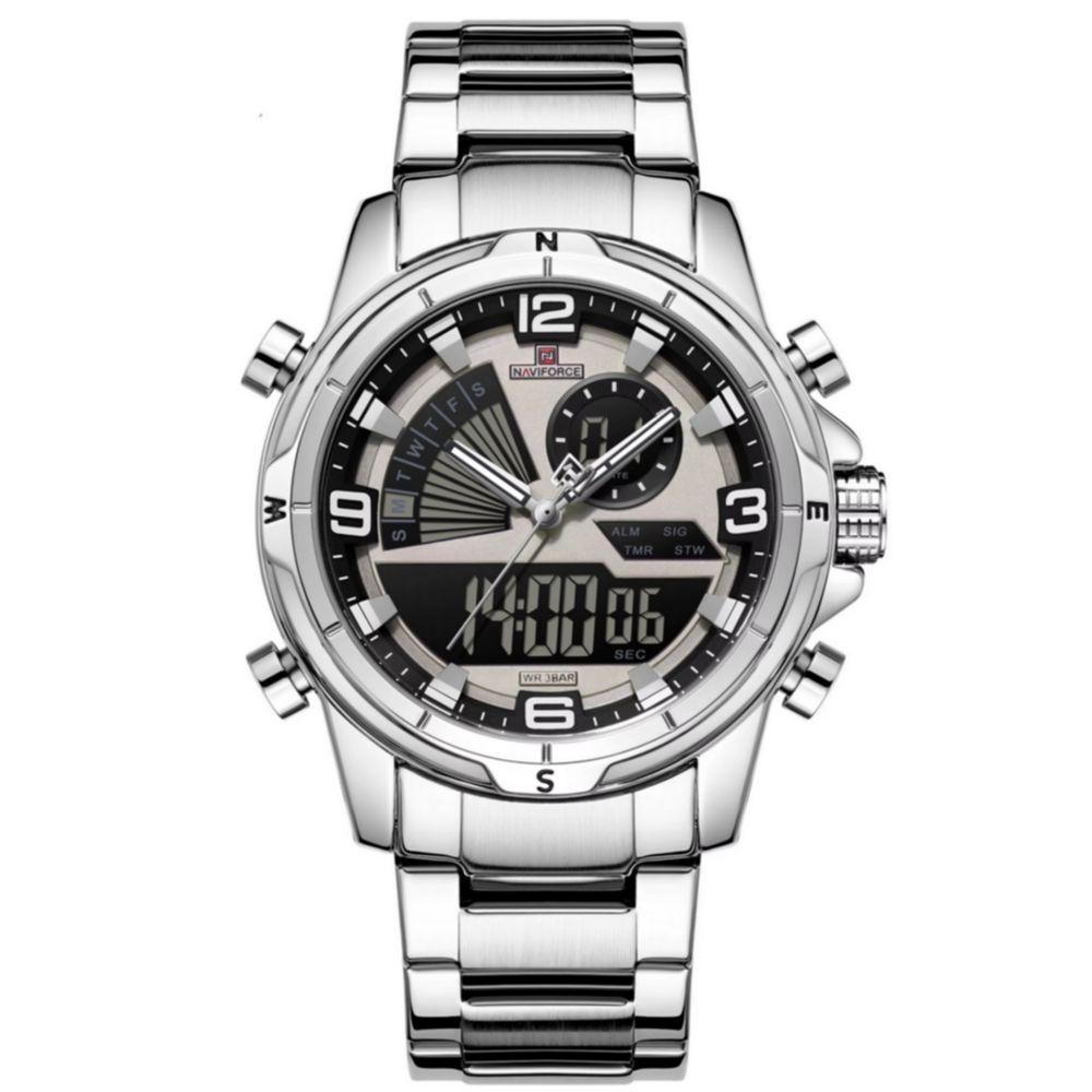 Relógio De Pulso Eletrônico Quartzo Design Luminoso à Prova D´agua Esportivo PrataExplore a fusão perfeita entre estilo e funcionalidade com este relógio de pulso masculino digital analógico. Ideal para o homem moderno que valoriza tanto a moda quanto o desempenho, este relógio multifuncional otimiza seu dia a dia com um toque de elegância. Seu design robusto e recursos de ponta fazem desta peça um acessório indispensável para atividades ao ar livre e ocasiões casuais.Com um mostrador iluminado por tecnologia avançada, você nunca ficará no escuro, enquanto sua resistência à água de até 3 Bar oferece a tranquilidade de enfrentar qualquer condição climática. A pulseira de aço inoxidável proporciona durabilidade incomparável, tornando este relógio não só um símbolo de estilo, mas também um aliado confiável em todas as suas aventuras diárias. [Tecnologia Dual] Combinando a precisão do movimento digital com a clássica leitura analógica, este relógio oferece o melhor de dois mundos, perfeito para quem busca eficiência e estilo em um só lugar. [Conforto e Durabilidade] A pulseira feita de aço inoxidável não só garante durabilidade excepcional, mas também proporciona um ajuste confortável ao longo do dia com seu sofisticado fecho de bracelete. [Versatilidade no Design] O design fashion e casual deste relógio permite uma transição suave entre o escritório e atividades ao ar livre, combinando com diversos estilos sem esforço. [Resistência à Água] Com uma profundidade de resistência à água de até 3 Bar, aventure-se por chuva e umidade sem preocupações, enquanto seu visor Hardlex oferece proteção contra impactos. [Estilo Moderno] Equipado com um diâmetro de visor de 44mm e um impressionante estojo de liga, este item de moda é a escolha ideal para quem busca afirmar sua personalidade com sofisticação.