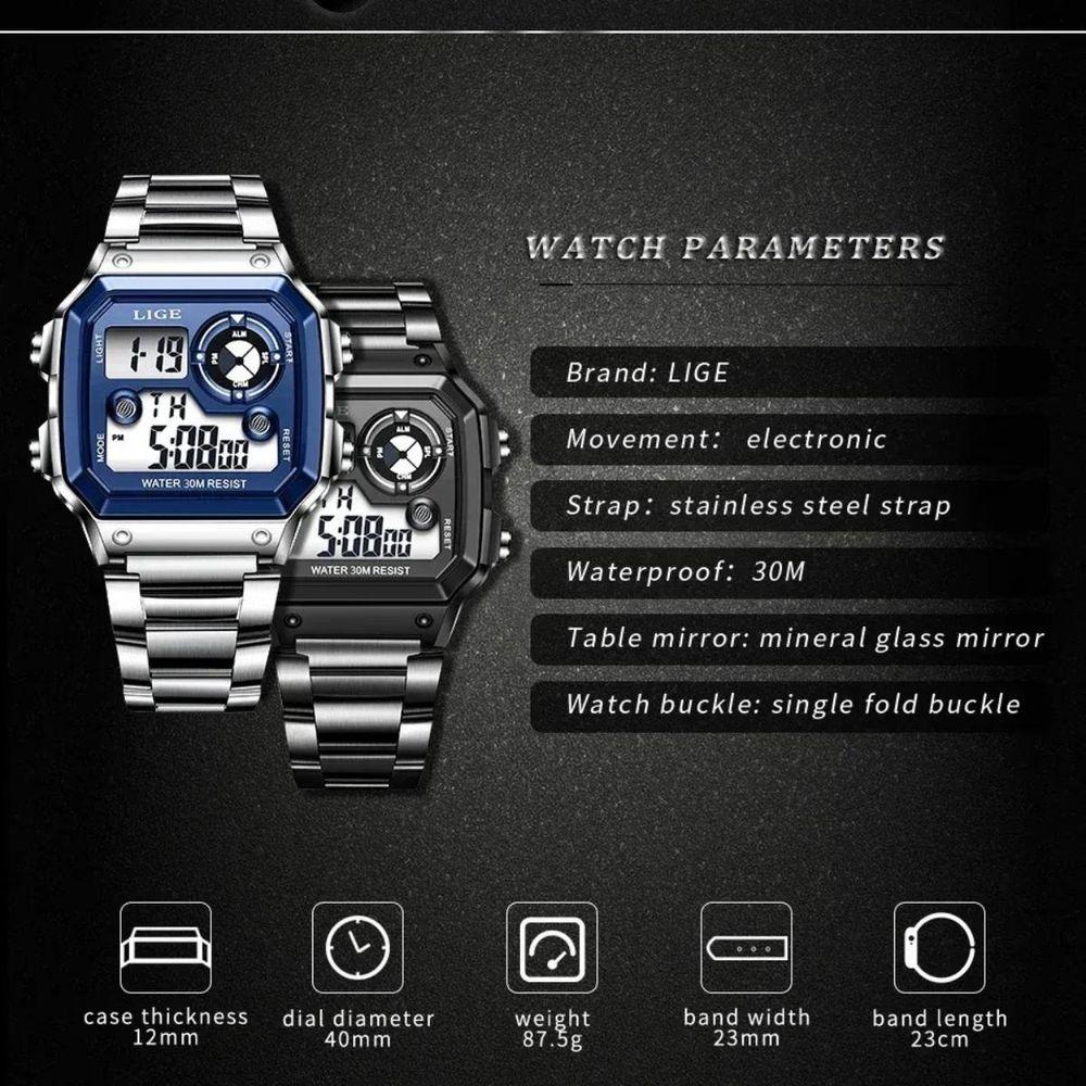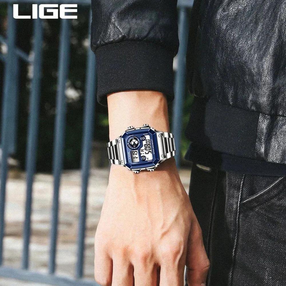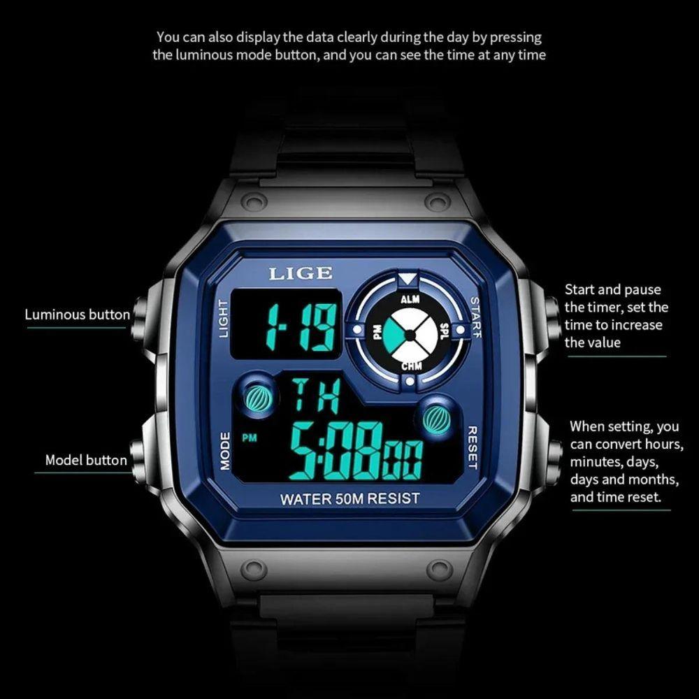 Relógio Moda Luxo Eletrônico Inoxidável Luminoso 8921 AzulDescubra o equilíbrio perfeito entre elegância e funcionalidade com este relógio masculino de aço inoxidável. Este acessório luminescente apela para os amantes de moda e tecnologia ao integrar uma estética sofisticada com funções digitais. Ideal para homens que buscam unir estilo casual e esporte, esse relógio oferece um design quadrado único que o diferencia na multidão. Seu mostrador analógico-digital é altamente legível, e os materiais premium garantem durabilidade.Com resistência à água de 3Bar, você pode usá-lo sem se preocupar com dias chuvosos ou durante atividades aquáticas leves. Além do visual impressionante e resistente, o relógio inclui cronógrafo, calendário completo e funções de alarme, proporcionando um controle total do seu dia a dia. Aproveite a conveniência do fecho com botão oculto e desfrute do conforto proporcionado pela pulseira de aço inoxidável. Especificações [Design sofisticado:] Com mostrador quadrado e vidro Hardlex, este relógio ocupa um lugar único entre os acessórios de moda, garantindo um visual contemporâneo e fora do comum. [Conforto premium:] Pulseira de aço inoxidável de 23mm de largura e 23cm de comprimento que assegura um ajuste confortável e durável ao usuário. [Funções úteis:] Oferece recursos como luminosidade, luz de fundo, resistência a choques, cronógrafo e calendário completo, atendendo as necessidades modernas de qualquer homem ativo. [Durabilidade robusta:] Equipado com um material resistente, é construído para suportar o uso diário sem perder sua elegância. [Performance confiável:] Bateria inclusa e movimento digital preciso garantem que você nunca perca uma batida.