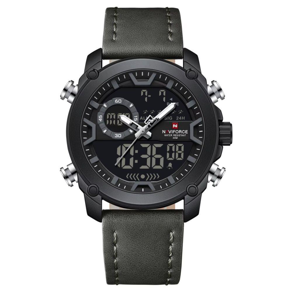 Relógio Esportivo Para Homens Dual Display à Prova D 'água Couro Genuíno PretoDescubra o relógio esportivo que é sinônimo de inovação e estilo contemporâneo. Com um design robusto, o [Relógio Esportivo Masculino] NAVIFORCE combina funcionalidade e elegância para homens que não abrem mão de um acessório versátil e moderno. O mostrador analógico-digital proporciona não apenas uma visualização clara do tempo, mas também um toque de sofisticação único para qualquer ocasião. Seja para práticas esportivas ou para uma reunião de negócios, este relógio traz a confiança e a precisão necessárias para o seu dia a dia.A pulseira de couro genuíno complementa o visual do relógio, oferecendo conforto e durabilidade ao longo do tempo. Além disso, suas características à prova d'água e resistência ao choque fazem dele um parceiro confiável, sejam quais forem os desafios que você enfrente. A tecnologia de ponta e o display dual garantem que a inovação nunca fique de lado, proporcionando funcionalidades avançadas como cronômetro, alarme e fuso horário múltiplo, perfeitos para quem vive em movimento. Especificações: [Mostrador analógico-digital]: O design sofisticado de mostrador dual permite uma leitura rápida e fácil do tempo, oferecendo uma experiência visual única com ponteiros luminosos e tela LED. [Pulseira de couro genuíno]: Fabricada em couro de alta qualidade, a pulseira oferece conforto excepcional e ajuste perfeito, com largura entre 20 e 24 mm. [Funções avançadas]: Equipado com cronômetro, calendário completo, luz de fundo e resistência ao choque, este relógio é um verdadeiro companheiro multifuncional. [Resistência à água]: Com uma profundidade de resistência à água de até 3Bar, o relógio garante proteção contra água em situações cotidianas, como chuvas e lavagem de mãos. [Design robusto]: O mostrador de 40 a 44 mm de diâmetro e a espessura do estojo de 15 mm transmitem um visual esportivo e imponente, ideal para homens que gostam de marcar presença.