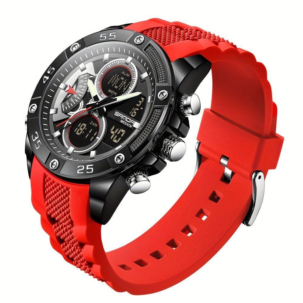 Relógios Em Design De Moda Casuais Da Marca Que São à Prova De água Preto VermelhoDescubra a perfeita fusão entre estilo e funcionalidade com nossos relógios desportivos para homem. Este relógio de design de moda não é apenas um acessório, mas uma extensão do seu estilo de vida ativo. Com um visual sofisticado que se adapta a qualquer ocasião, ele transforma a medição do tempo em uma experiência luxuosa e prática, combinando elementos de moda e utilidade.Perfeito para o profissional moderno, este relógio de negócios casual é à prova de água, oferecendo resistência nas mais diversas situações, enquanto seu movimento de quartzo digital de dupla exibição faz dele uma escolha confiável e duradoura. Usá-lo é explorar um mundo onde inovação e moda andam de mãos dadas, proporcionando um visual e sensação de confiança e inovação. Especificações: [Mestre da Resiliência] O relógio é resistente à água até 5 ATM, garantindo que você possa usá-lo sob chuva ou em atividades aquáticas com tranquilidade. [Mais do que Estilo] Equipado com funções como alarmes de contagem regressiva e cronómetros, este relógio atende a todas as suas necessidades diárias, gerenciando seu tempo com precisão. [Materiais de Primeira Linha] Fabricado com uma correia de gel de sílica e caixa de liga de zinco, sua durabilidade é um dos seus principais atributos. [Configuração Intuitiva] Simples e eletronicamente movido, oferece uma maneira fácil de acessar suas funções, complementando seu estilo de vida descomplicado. [Organização ao seu Alcance] Com um mostrador redondo e exibição de data, dias da semana e hora, ele organiza suas informações diárias de forma clara e acessível.