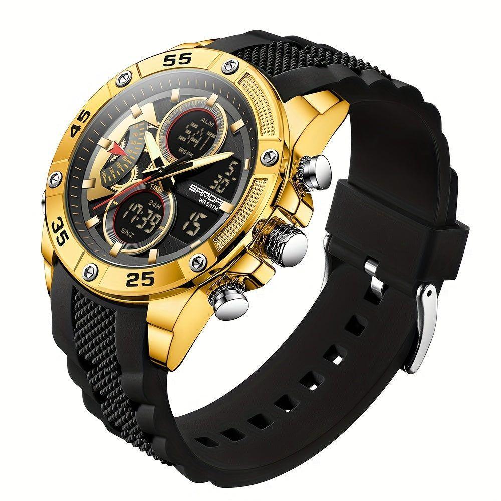 Relógios Em Design De Moda Casuais Da Marca Que São à Prova De água Preto DouradoDescubra a perfeita fusão entre estilo e funcionalidade com nossos relógios desportivos para homem. Este relógio de design de moda não é apenas um acessório, mas uma extensão do seu estilo de vida ativo. Com um visual sofisticado que se adapta a qualquer ocasião, ele transforma a medição do tempo em uma experiência luxuosa e prática, combinando elementos de moda e utilidade.Perfeito para o profissional moderno, este relógio de negócios casual é à prova de água, oferecendo resistência nas mais diversas situações, enquanto seu movimento de quartzo digital de dupla exibição faz dele uma escolha confiável e duradoura. Usá-lo é explorar um mundo onde inovação e moda andam de mãos dadas, proporcionando um visual e sensação de confiança e inovação. Especificações: [Mestre da Resiliência] O relógio é resistente à água até 5 ATM, garantindo que você possa usá-lo sob chuva ou em atividades aquáticas com tranquilidade. [Mais do que Estilo] Equipado com funções como alarmes de contagem regressiva e cronómetros, este relógio atende a todas as suas necessidades diárias, gerenciando seu tempo com precisão. [Materiais de Primeira Linha] Fabricado com uma correia de gel de sílica e caixa de liga de zinco, sua durabilidade é um dos seus principais atributos. [Configuração Intuitiva] Simples e eletronicamente movido, oferece uma maneira fácil de acessar suas funções, complementando seu estilo de vida descomplicado. [Organização ao seu Alcance] Com um mostrador redondo e exibição de data, dias da semana e hora, ele organiza suas informações diárias de forma clara e acessível.