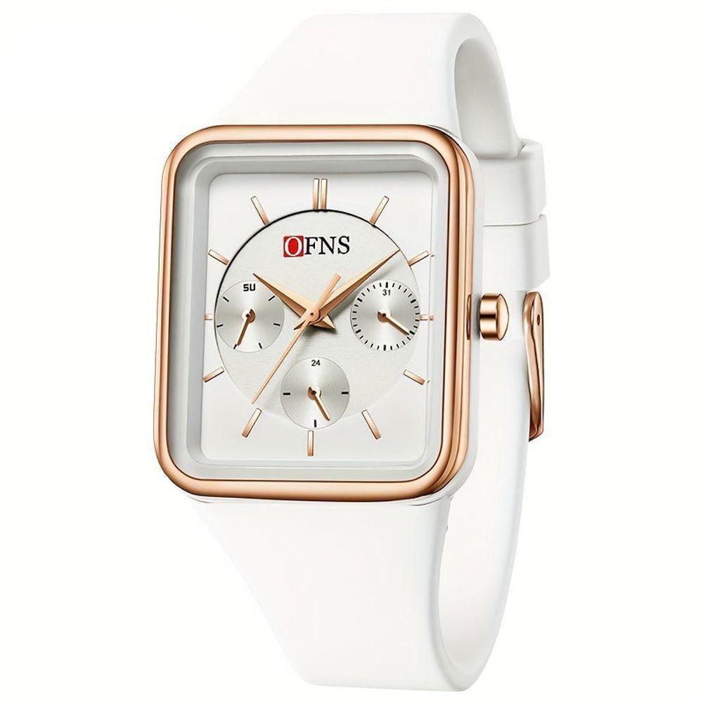 Relógio Quadrado De Quartzo Feminino Da Ofns, à Prova D'água Ouro Rosa BrancoDescubra o companheiro perfeito para o seu dia a dia com este relógio quadrado de quartzo, projetado para homens e mulheres que valorizam estilo e funcionalidade. Sua resistência à água de 50 metros garante tranquilidade em qualquer situação, enquanto o visor de 24 horas oferece uma visão completa do seu tempo. O design casual, aliado a uma pulseira de silicone confortável, o torna ideal para uso diário, complementando qualquer look com um toque moderno.Este relógio é mais do que um acessório, é uma declaração de praticidade e sofisticação. Seja para o trabalho, para um passeio ou para uma noite especial, este relógio de quartzo se adapta a todas as suas necessidades, combinando durabilidade e um visual contemporâneo. Explore a versatilidade e a elegância deste relógio que se tornará um item indispensável no seu pulso.Especificações:[Design Moderno] Um relógio quadrado com um design contemporâneo, este modelo em quartzo apresenta um display de 24 horas, perfeito para quem precisa de precisão e visibilidade total. Sua construção robusta em resina sintética e a pulseira em gel de sílica proporcionam conforto e durabilidade para o uso diário. A resistência à água de 50 metros garante que seu relógio esteja pronto para acompanhar suas aventuras sem preocupações.[Funcionalidade Essencial] Este relógio de quartzo casual é movido por um movimento eletrônico preciso, alimentado por bateria tipo botão não recarregável. A facilidade de uso é um dos seus pontos fortes, com um método de condução que simplifica a operação. Ideal para quem busca praticidade, este modelo oferece um cronômetro integrado para auxiliar em suas tarefas e atividades cotidianas.[Conforto e Durabilidade] A pulseira em gel de sílica é suave ao toque e resistente, garantindo conforto prolongado mesmo após horas de uso. O material da correia foi escolhido pensando na versatilidade, permitindo que este relógio de quartzo seja seu parceiro em qualquer ocasião. A forma quadrada do mostrador adiciona um toque de originalidade ao seu estilo.[Estilo Versátil] Com um estilo casual definido, este relógio de quartzo é a escolha perfeita para quem busca um acessório que transita com facilidade entre diferentes ambientes e looks. O material do estojo em resina sintética contribui para a leveza e resistência do relógio, tornando-o uma opção prática e elegante para homens e mulheres.