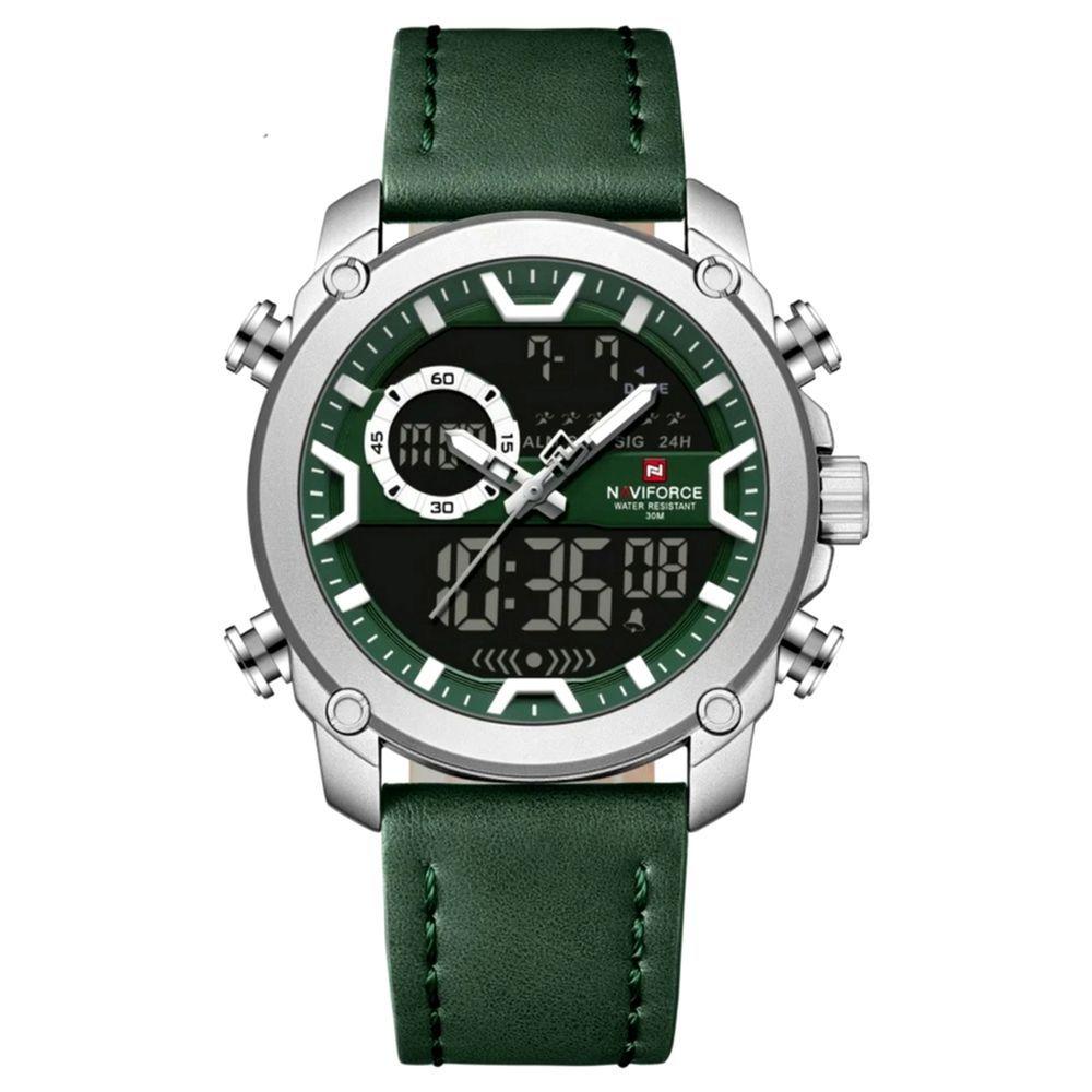 Relógio Masculino Negócios Casual Moda Dupla Exibição Esportivo VerdeDescubra a fusão perfeita entre estilo e funcionalidade com este relógio de pulso masculino. Projetado para o homem moderno, este acessório oferece uma dupla exibição, combinando a elegância de um mostrador analógico com a praticidade de um display digital. Perfeito para o dia a dia, para o trabalho ou para aventuras, ele eleva seu visual com um toque de sofisticação e versatilidade.Este relógio de quartzo é um companheiro confiável para todas as suas atividades. Com um design robusto e materiais de alta qualidade, ele é construído para durar e acompanhar seu ritmo. A pulseira de couro genuíno proporciona conforto e um toque clássico, enquanto as funcionalidades avançadas garantem que você esteja sempre um passo à frente. Uma escolha inteligente para quem busca um acessório que combine moda, desempenho e durabilidade.Especificações: [Dual Display] Experimente o melhor dos dois mundos com uma tela analógica elegante e um display digital de LED dinâmico, proporcionando visibilidade clara e acesso rápido a todas as informações que você precisa. [Resistente e Durável] Construído com uma caixa de liga robusta e um visor de cristal Hardlex, este relógio é projetado para resistir aos impactos do dia a dia, garantindo longevidade e desempenho confiável em todas as suas aventuras. [Conectado e Atualizado] Mantenha-se informado com recursos como data automática, calendário completo e exibição da semana, garantindo que você esteja sempre no controle do seu tempo e compromissos. [Funcionalidade Completa] Desfrute de recursos como cronômetro, alarme e múltiplos fusos horários, tornando este relógio o companheiro ideal para viagens, esportes e para gerenciar sua agenda global. [À Prova D'Água] Com uma profundidade de resistência à água de 3Bar, este relógio oferece tranquilidade para enfrentar os imprevistos do cotidiano, garantindo que ele permaneça funcional mesmo em contato com água.