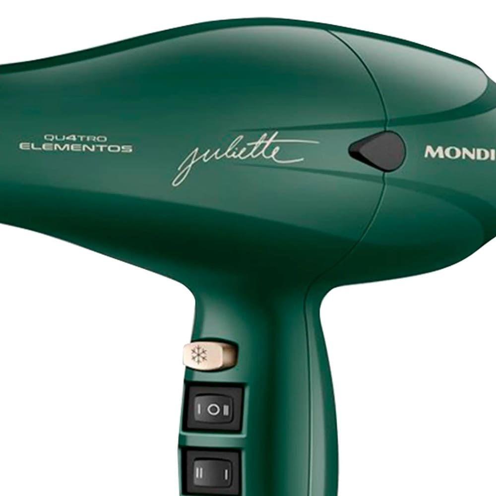 Secador Mondial By Juliette 2000W Profissional SCP-JU-02 Verde 110VSecador de Cabelo Mondial Quatro Elementos by Juliette 2000W SCP-JU-02O Secador de Cabelo Profissional Mondial Quatro Elementos by Juliette foi desenvolvido para quem busca desempenho, tecnologia e cuidado com os fios. Com design moderno e acabamento elegante, ele combina potência de 2000W com o exclusivo revestimento enriquecido com Cerâmica, Titânio, Tourmaline e Nano Silver, oferecendo uma secagem rápida, eficiente e com aparência saudável.Tecnologia dos 4 elementosCerâmica: distribui o calor de forma uniforme, evitando o ressecamento e garantindo uma secagem mais rápida.Titânio: reduz o tempo de secagem e elimina o frizz, mantendo os fios alinhados e macios.Tourmaline: emite íons negativos que neutralizam a eletricidade estática, proporcionando brilho intenso e suavidade.Nano Silver: partículas de prata que auxiliam na proteção antibacteriana dos fios e couro cabeludo.Desempenho profissionalEquipado com motor AC profissional, o SCP-JU-02 garante maior durabilidade, alta performance e uso contínuo sem superaquecimento. Sua potência de 2000W assegura resultados rápidos e eficientes, enquanto o jato de ar frio ajuda na fixação do penteado.Versatilidade e praticidadeCom 2 velocidades e 3 temperaturas, o secador permite ajustar o fluxo e o calor conforme o tipo de cabelo. O bocal direcionador facilita a modelagem e o difusor é ideal para realçar a definição dos cachos. O cabo de 2,5 metros garante liberdade de movimento durante o uso, e a argola para pendurar oferece praticidade no armazenamento.Design ergonômico e levePesando apenas 0,7 kg, o secador é confortável para manusear por longos períodos, ideal tanto para uso doméstico quanto profissional.Especificações principais:Potência: 2000WMotor: AC profissionalVelocidades: 2Temperaturas: 3Tecnologia: Cerâmica, Titânio, Tourmaline e Nano SilverJato de ar frio: SimBico direcionador: SimDifusor: SimCabo: 2,5 mPeso: 0,7 kgTensão: 110V ou 220V (não é bivolt)Conteúdo da embalagem:01 Secador de Cabelo Mondial Quatro Elementos SCP-JU-02, bico direcionador, difusor e manual de instruções.Garantia: 1 ano (3 meses de garantia legal e 9 meses de garantia especial concedida pelo fabricante).O Secador Mondial by Juliette Quatro Elementos 2000W une tecnologia, potência e cuidado, garantindo cabelos brilhantes, macios e livres de frizz, com resultados de salão no conforto da sua casa.