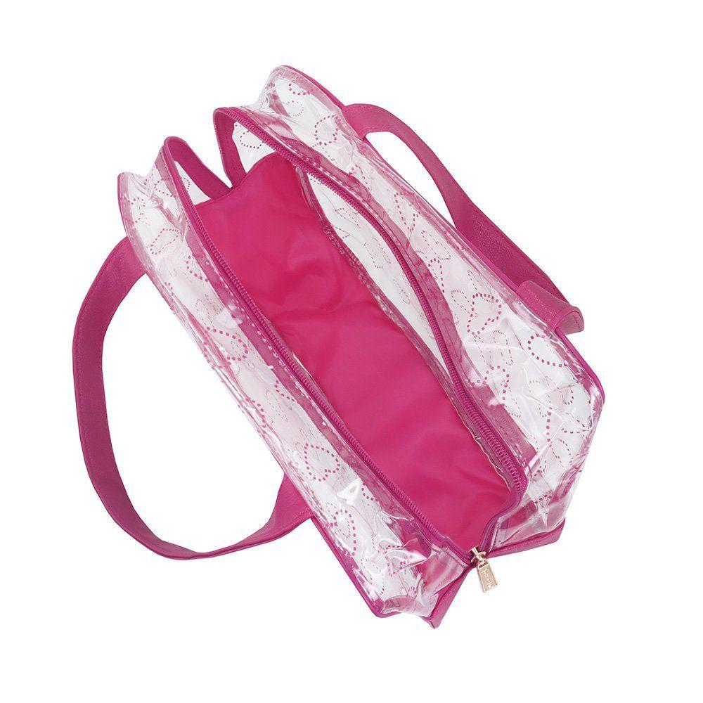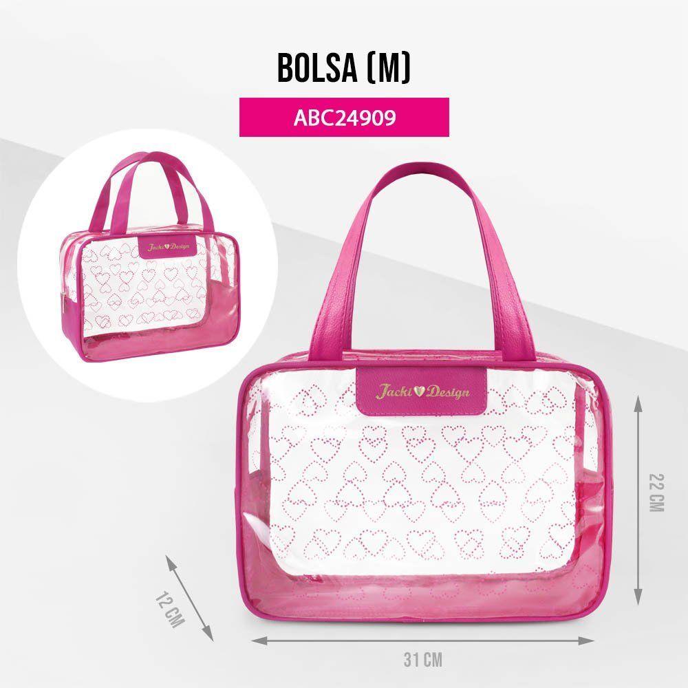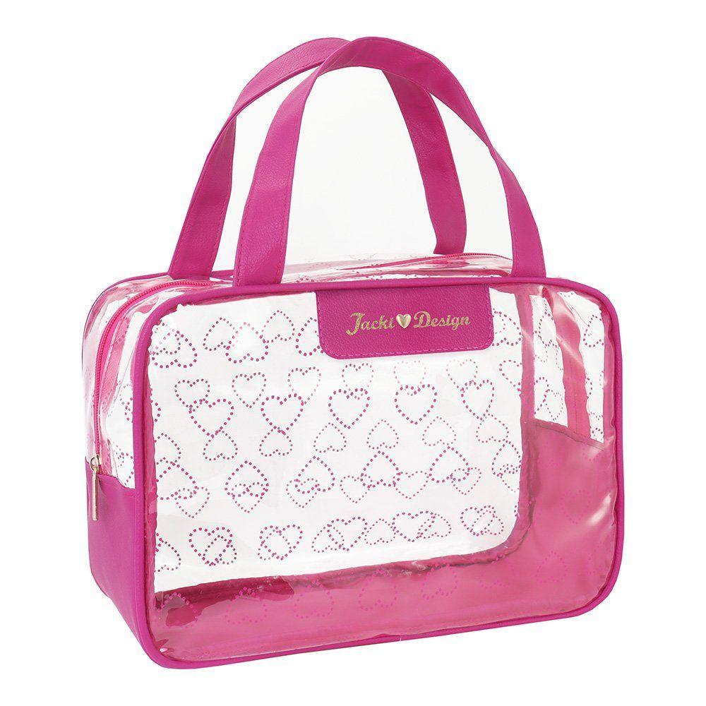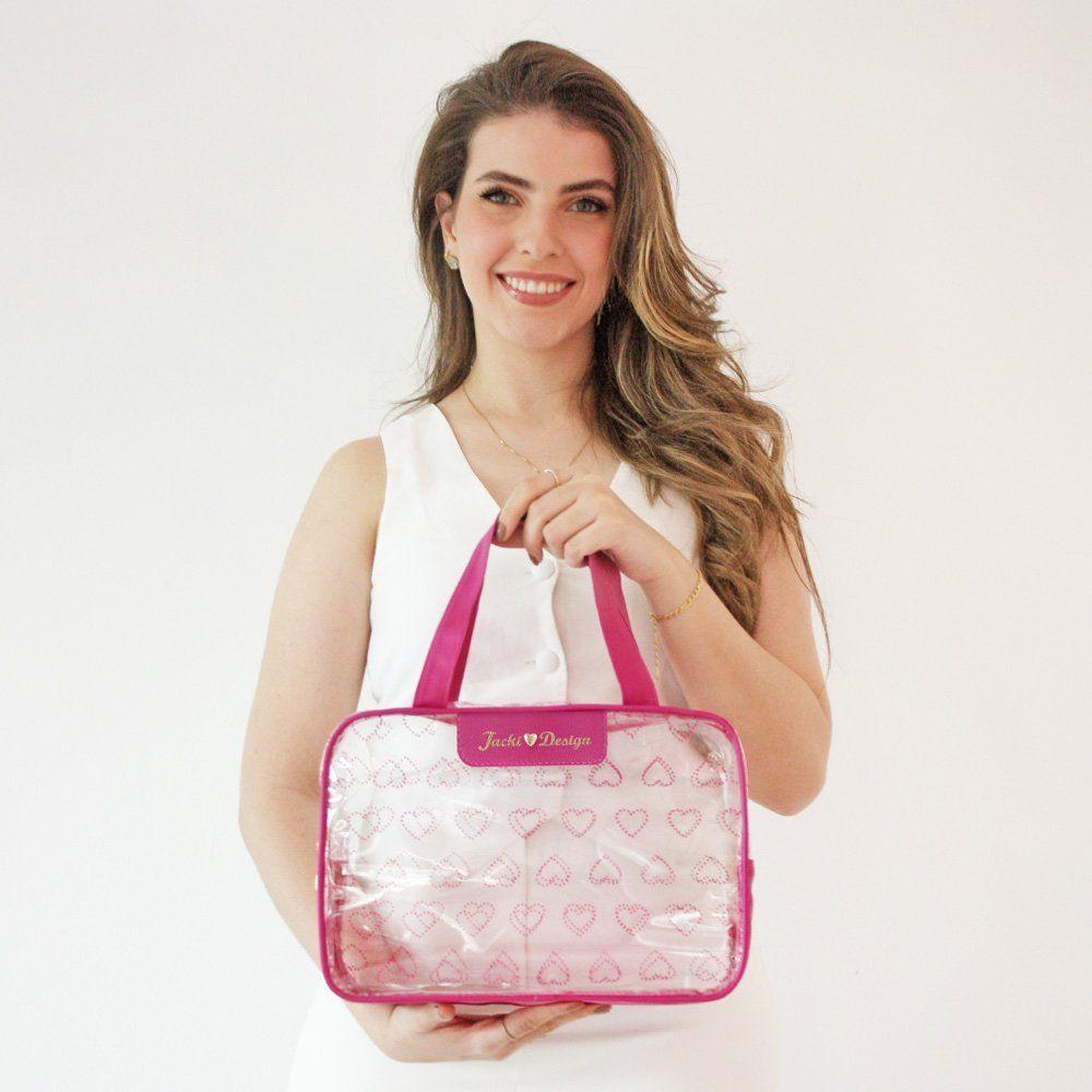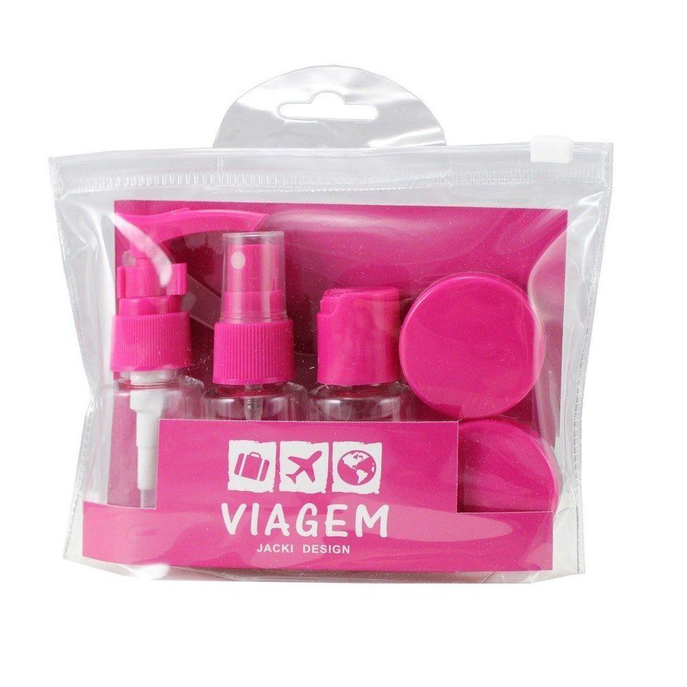 Kit De Bolsa Transparente E Frascos De Viagem De 7 Peças PinkKit de Bolsa Transparente e Frascos de Viagem de 7 Peças Pink -Kit Bolsa Transparente com Frascos de Viagem 7 Peças – Jacki Design Coleção LOVEPrático, elegante e funcional, o Kit Bolsa Transparente com Frascos da Jacki Design – Coleção LOVE – é a escolha ideal para quem busca estilo e organização em viagens e no dia a dia. Com um design moderno e detalhes delicados em formato de coração, este conjunto oferece tudo o que você precisa para transportar seus itens com segurança e charme.A bolsa transparente possui amplo espaço interno, fecho em zíper e acabamento refinado com o pin dourado exclusivo da marca. Além disso, o kit acompanha uma nécessaire compacta e seis frascos e potes que permitem carregar líquidos, cremes e cosméticos com total praticidade, sem riscos de vazamentos.Características da Bolsa:Design: Moderno, com detalhes de coração e acabamento sofisticadoMaterial: PVC transparente, impermeável e fácil de limparFecho: Zíper resistente que garante segurança no armazenamentoDetalhes: Tag da marca Jacki Design com pin dourado em forma de coraçãoUso: Ideal para o dia a dia, viagens, praia ou piscinaCuidados: Limpar com pano úmido. Não lavar na máquina, não deixar de molho, não usar produtos químicos agressivosMedidas da Bolsa:Comprimento: 31 cmLargura: 12 cmAltura: 22 cmComposição do Material da Bolsa:20% PU | 80% PVCComposição do Kit Viagem (7 Peças):01 Nécessaire Transparente01 Frasco com válvula pump (30 ml)01 Frasco spray (30 ml)01 Frasco com tampa disk top (30 ml)02 Potes (10 g cada)01 EspátulaMedidas da Nécessaire com Frascos:Comprimento: 14 cmLargura: 11 cmAltura: 4 cmMaterial dos Frascos e Nécessaire:Frascos: PSNécessaire: PVC