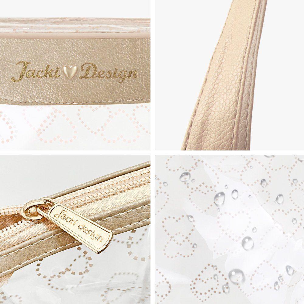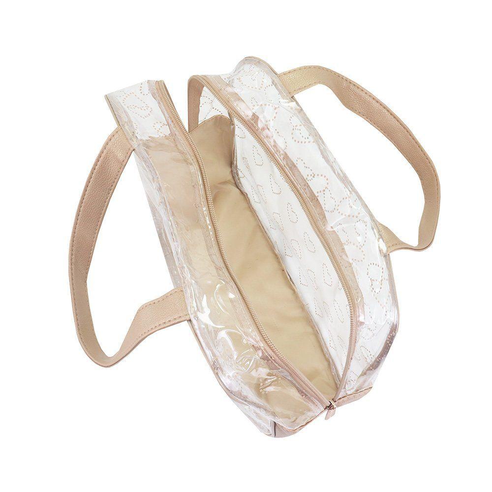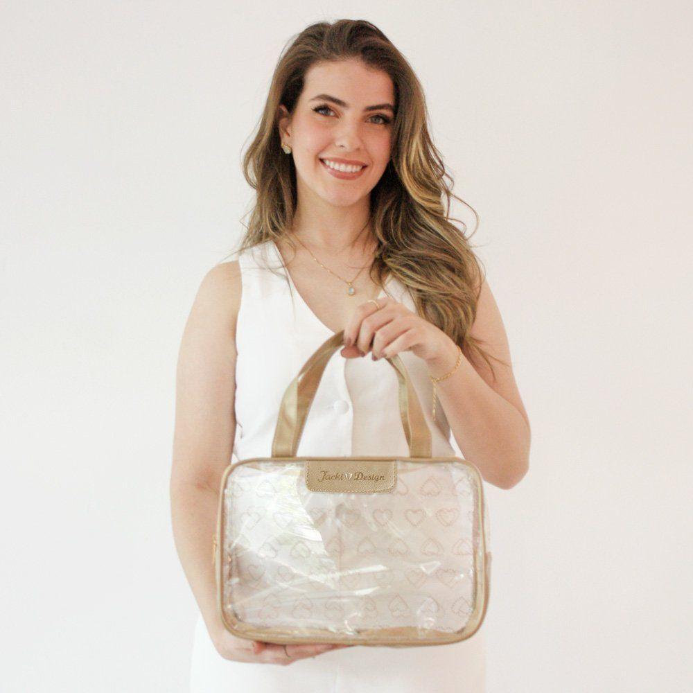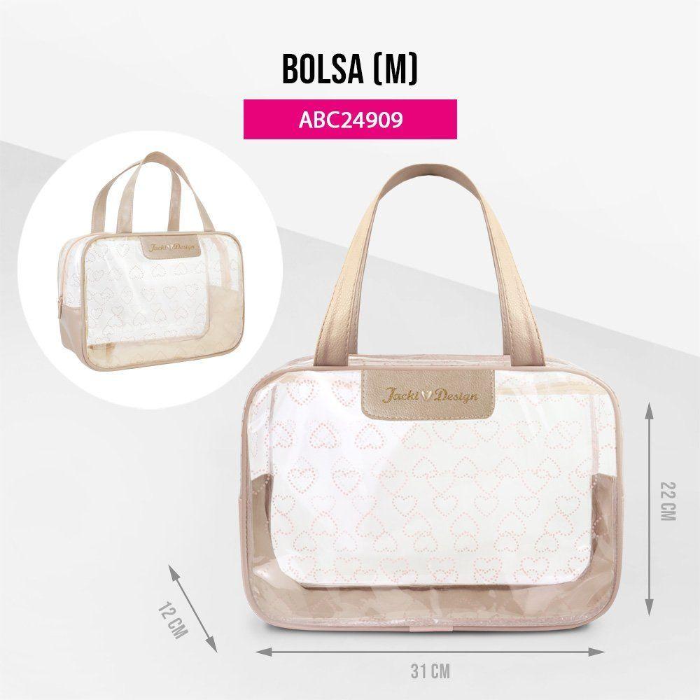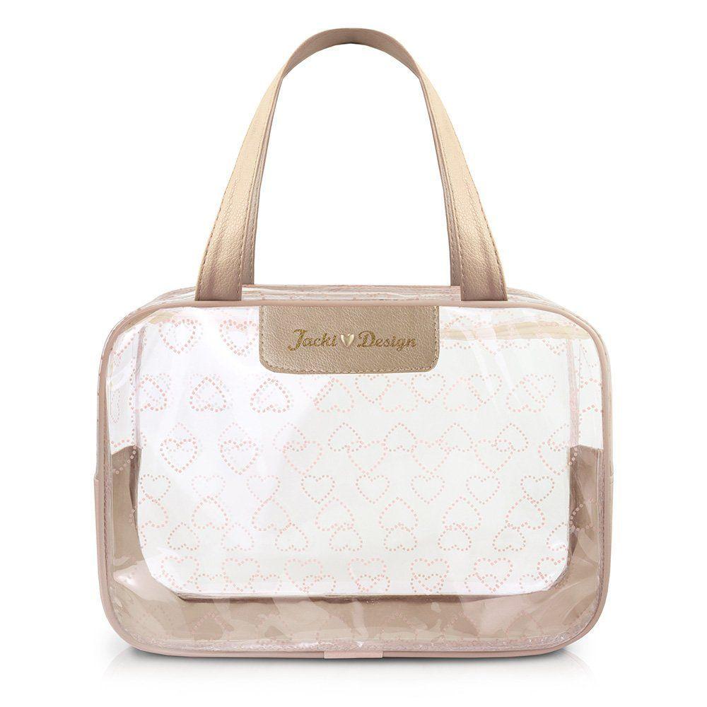Kit De Bolsa Transparente E Frascos De Viagem De 7 Peças BegeKit de Bolsa Transparente e Frascos de Viagem de 7 Peças Bege -Kit Bolsa Transparente com Frascos de Viagem 7 Peças – Jacki Design Coleção LOVEPrático, elegante e funcional, o Kit Bolsa Transparente com Frascos da Jacki Design – Coleção LOVE – é a escolha ideal para quem busca estilo e organização em viagens e no dia a dia. Com um design moderno e detalhes delicados em formato de coração, este conjunto oferece tudo o que você precisa para transportar seus itens com segurança e charme.A bolsa transparente possui amplo espaço interno, fecho em zíper e acabamento refinado com o pin dourado exclusivo da marca. Além disso, o kit acompanha uma nécessaire compacta e seis frascos e potes que permitem carregar líquidos, cremes e cosméticos com total praticidade, sem riscos de vazamentos.Características da Bolsa:Design: Moderno, com detalhes de coração e acabamento sofisticadoMaterial: PVC transparente, impermeável e fácil de limparFecho: Zíper resistente que garante segurança no armazenamentoDetalhes: Tag da marca Jacki Design com pin dourado em forma de coraçãoUso: Ideal para o dia a dia, viagens, praia ou piscinaCuidados: Limpar com pano úmido. Não lavar na máquina, não deixar de molho, não usar produtos químicos agressivosMedidas da Bolsa:Comprimento: 31 cmLargura: 12 cmAltura: 22 cmComposição do Material da Bolsa:20% PU | 80% PVCComposição do Kit Viagem (7 Peças):01 Nécessaire Transparente01 Frasco com válvula pump (30 ml)01 Frasco spray (30 ml)01 Frasco com tampa disk top (30 ml)02 Potes (10 g cada)01 EspátulaMedidas da Nécessaire com Frascos:Comprimento: 14 cmLargura: 11 cmAltura: 4 cmMaterial dos Frascos e Nécessaire:Frascos: PSNécessaire: PVC