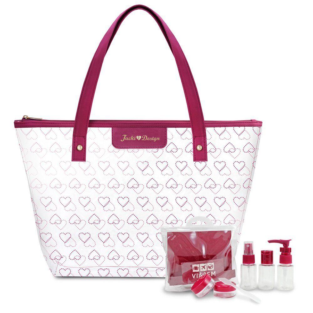 Kit De Bolsa Transparente E Frascos De Viagem De 7 Peças VinhoKit de Bolsa Transparente e Frascos de Viagem de 7 Peças Vinho -Kit Bolsa Shopper Transparente com Frascos de Viagem 7 Peças – Jacki Design | Coleção LOVEA Jacki Design apresenta o Kit Bolsa Shopper Transparente com Frascos de Viagem, ideal para quem busca estilo, praticidade e organização em todas as ocasiões. Com design elegante e acabamento de alta qualidade, este conjunto oferece soluções completas para o dia a dia e viagens.Bolsa Shopper Transparente – Coleção LOVEA bolsa shopper da coleção LOVE é feita em PVC transparente, resistente e fácil de limpar. Seu visual feminino e sofisticado é realçado por detalhes em formato de coração e pin dourado com a assinatura Jacki Design. Conta com amplo espaço interno, fecho em zíper e é perfeita para uso diário, praia ou piscina.Características:Design moderno com detalhes de coraçãoMaterial impermeável e de fácil manutençãoFecho com zíper para maior segurançaTag Jacki Design com pin dourado exclusivoIdeal para uso urbano e momentos de lazerCuidados:Limpar com pano úmido e sabão neutroSecar à sombraNão lavar na máquina ou deixar de molhoMedidas da Bolsa: 49 cm (C) x 18 cm (L) x 30 cm (A)Material: 80% PVC | 20% PUKit de Frascos para Viagem 7 Peças – Jacki DesignEste kit compacto foi desenvolvido para transportar seus cosméticos e itens de higiene de forma segura e organizada. Ideal para viagens, possui nécessaire impermeável que evita vazamentos e facilita a visualização dos produtos.Itens inclusos:01 Nécessaire transparente (PVC)01 Frasco com válvula pump (30 ml)01 Frasco spray (30 ml)01 Frasco com tampa disk top (30 ml)02 Potes para cremes ou sólidos (10 g cada)01 Espátula para manuseio de produtosMedidas da Nécessaire: 14 cm (C) x 11 cm (L) x 4 cm (A)Material dos frascos: PS | Nécessaire: PVC
