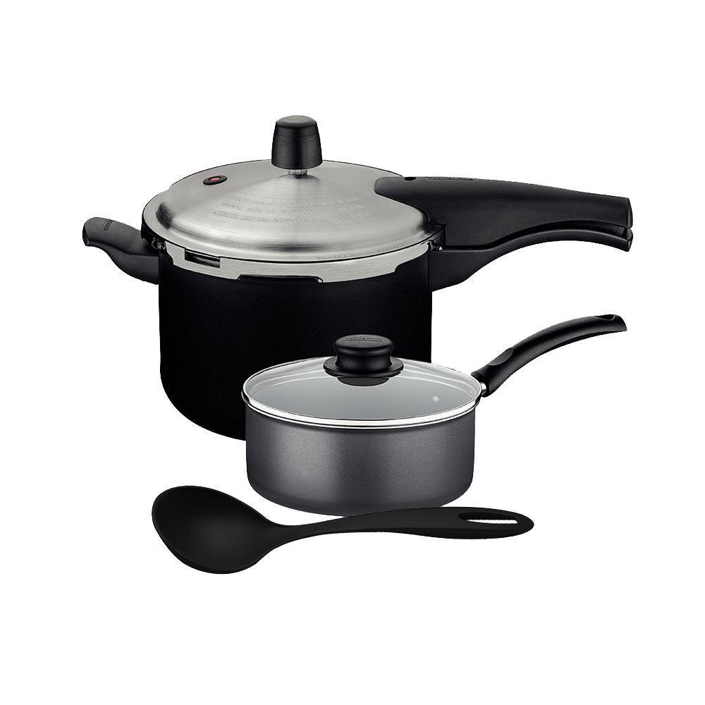 Panela De Pressão Effect 4,5l E Panela Turim Alumínio Antiaderente 1,4l Ptc + Concha - TramontinaMUITO IMPORTANTE:CONFERIR PRODUTOS NO ATO DO RECEBIMENTO. NÃO ACEITAR PRODUTOS COM EMBALAGEM VIOLADA (AMASSADO, RASGADO, ABERTO, QUEBRADO, ETC), A RECUSA DEVE SER FEITA NO ATO Componentes do Kit:1 - Panela Turim Alumínio Antiaderente Chumbo 16cm 1,4L PTC3 - Tramontina 1 - Panela de Pressão Effect Alumínio Revestimento Antiaderente 20 cm 4,5 l Preto1 - Concha 29cm Ability em Nylon Preto - Tramontina Panela de Pressão Effect 4,5L e Panela Turim Alumínio Antiaderente 1,4L PTC + Concha - Tramontina Aprimore sua performance na cozinha com o Kit de Panelas Tramontina, a dupla perfeita para quem busca agilidade no preparo e pratos com sabor profissional. Esse conjunto é ideal para cozinheiros domésticos, transformando a rotina de preparar refeições em uma tarefa prazerosa e simples. A Panela de Pressão Effect cozinha os alimentos de forma rápida e segura, enquanto a Panela Turim Antiaderente garante que nada grude, facilitando o manuseio dos ingredientes. A capacidade de 4,5L da panela de pressão é ideal para famílias, garantindo resultados deliciosos e em menos tempo. A Panela de Pressão Effect possui um sistema de segurança de cinco válvulas, que garante o cozimento sem riscos. Já a Panela Turim, com seu revestimento antiaderente Starflon T1, proporciona uma superfície de cozimento fácil de limpar e livre de resíduos. Ambas são construídas com alumínio de alta qualidade, oferecendo resistência e durabilidade para anos de uso. Com o fundo de 1,4mm de espessura, o calor é distribuído de forma uniforme, otimizando o tempo de cozimento e economizando energia. Não perca a oportunidade de ter mais eficiência e tranquilidade na sua cozinha. Adquira agora o Kit Tramontina e tenha o poder de criar pratos incríveis com muito mais facilidade! Especificações Panela:- Capacidade: 1,4L;- Alumínio com 1,2mm de espessura;- Revestimento anti-aderente;- Altura com tampa e cabo: 13,9cm;- Altura somente com tampa: 14,4cm;- Altura interna: 6,7cm;- Diâmetro: 16cm;- Comprimento total: 31,9cm;- Garantia de 90 dias para vícios ou defeitos de fabricação;- Não utilizar em temperaturas superiores à 260°C. Especificações Panela de Pressão:- Corpo de alumínio com espessura de 3,2 mm que proporciona cozimento rápido e uniforme.- Com revestimento interno e externo de antiaderente Starflon Max que não gruda, é fácil de limpar, mais durável e não é prejudicial à saúde.- Alça, cabos superior e inferior de baquelite antitérmico que oferecem segurança durante o manuseio.- Pode ser utilizada nos fogões: gás, elétrico e vitrocerâmico - resistência elétrica. Especificações Concha:- Concha de Nylon que permite uso em temperaturas de até 180 °C.- Cabo com furo passante possibilitando que sejam pendurado na sua cozinha.- Utensílio ideal para uso em panelas com revestimentos antiaderentes e cerâmicos, pois não danifica o produto.- Pode ir à máquina de lavar louças facilitando seu dia a dia Cor: Preto | É kit de fábrica: Não | Quantidade de Peças: 3 | Materiais: Alumínio | Adequado para fogão de indução: Não | Com revestimento antiaderente: Sim