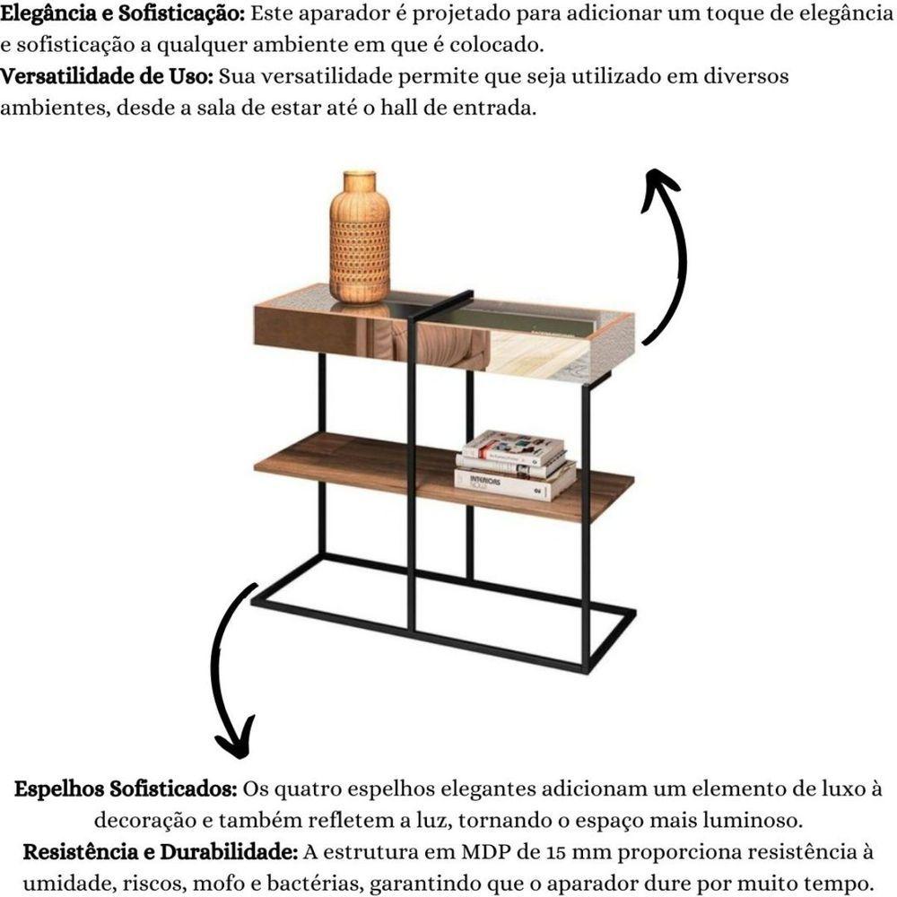 Kit Aparador Mesa Lateral Apoio E Centro Aurora DemoliçãoO Conjunto Aparador, Mesa Lateral, Mesa de Apoio e Centro Com Espelho Aurora é perfeito para você que deseja agregar mais requinte e elegância para o seu ambiente. Desenvolvido pra atender você que busca um conceito diferente no que se refere a design, sem abrir mão da qualidade. O Kit possui lindos espelhos, dois suportes aramados com espaço para seis garrafas e estrutura do produto em MDP de 15 mm que agrega mais resistência à umidade, riscos, mofo e bactéria, além de ser muito versátil pois pode ser utilizado em diversos ambientes. Os cinco produtos possuem também um acabamento visual que se assemelha aos desenhos de madeiras is, pés estruturais em metal antioxidantes com pintura eletroestática.Compre já o Jogo de Mesas e Aparador Estilo Industrial Aurora da Dream Home e ouse na sua utilização deixando a sua casa ainda mais linda!Dimensões do Aparador:Altura: 76 cm;Largura: 91 cm;Profundidade: 34 cm;Peso: 15 KG;Peso suportado: 5 kg por prateleira;Dimensões das Mesas (AxLxP):Apoio: 65x36x36 cmLateral: 59x30x24 cmCentro: 33x90x63 cmPeso: 3 Kg Lateral e apoioPeso: 10 Kg CentroPeso suportado: 7 kg CadaEspecificações do Produto:Estrutura: MDP/Metal;Acabamento: pintura eletroestática;Escala de brilho: Fosco;Quantidade de Prateleira: 1;Sistema de montagem: Parafusos;Manual de montagem: Sim;Montagem: Recomendamos que seja feita por um ;Garantia: 3 meses contra de fabricação;Instruções de Limpeza: Utilizar um pano limpo e levemente úmido;Você irá receber: 05 volumes;Observações Relevantes:- Ao receber a mercadoria, o cliente deve verificar as condições da embalagem, caso haja alguma não assine o e recuse no ato do ;- Produto para uso residencial em ambiente interno, não devendo ficar exposto diretamente ao sol, calor e umidades excessivas;- Pode haver alguma diferença de tonalidade entre a imagem e o produto real, por conta do tratamento de imagens e a calibração de cores do seu monitor;- As imagens são meramente ilustrativas, não acompanham objetos de decoração e eletros;- Confira as dimensões do produto no momento da compra e certifique-se de que passará normalmente por escadas, elevadores, portas e corredores;- Montagem, desmontagem e outras instalações serão de responsabilidade do cliente. Não nos responsabilizamos, no ato da , por subir escadas/elevadores ou pelo por guincho em apartamentos. Eventuais despesas são de responsabilidade do comprador;- A do produto é realizada em todo território , até onde as rodovias alcançam, s fluviais ou aéreas devem ser cotadas a parte;- Observando as orientações acima, evita-se futuros desagrados ou imprevistos com a do produto. Havendo despesas adicionais, serão de responsabilidade do cliente;MóveisDecoraçãoSala de estarDesign de interioresCasaEstilo industrialSofisticaçãoElegânciaDesign diferenciadoRequinteEspaço de convivênciaEstilo únicoGlamourFuncionalidadeDurabilidadeVersatilidadeAmbiente internoMadeira lMontagem Compatibilidade com escadas, elevadores e portas.