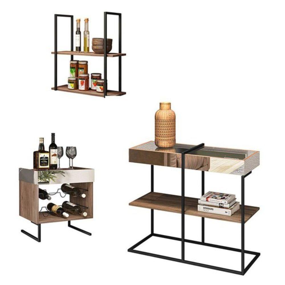 Kit Aparador Adega E Prateleira Aurora Demolição PretoAdicione Elegância à Sua Casa com o Conjunto Aparador, Adega e Prateleira Aurora!Se você procura um toque de requinte, elegância e uma visão única em design sem comprometer a qualidade, o Conjunto Aparador Adega e Prateleira Estilo Industrial Aurora é a escolha ideal. Criado para quem valoriza um design diferenciado, este conjunto é uma obra-prima.Características Principais:Adega Espelhada e Funcional: A adega possui lindos espelhos e suportes aramados com espaço para armazenar até seis garrafas de vinho. É uma combinação perfeita de praticidade e estilo.Aparador Versátil: O aparador é um móvel versátil que pode ser utilizado em diversos ambientes, adicionando um toque de elegância e funcionalidade ao seu espaço.Prateleira Espaçosa: A prateleira oferece espaço adicional de armazenamento ou exibição, tornando-a perfeita para mostrar objetos decorativos ou organizar seus pertences.Construção Robusta: A estrutura dos três produtos é feita em MDP de 15 mm, garantindo resistência contra umidade, riscos, mofo e bactérias.Estilo Industrial Sofisticado: O acabamento visual que se assemelha a desenhos de madeiras is e os pés e suportes de prateleira estruturais em metal antioxidante com pintura eletroestática unem o estilo industrial à sofisticação.Dimensões da Adega:Altura: 52 cmLargura: 49 cmProfundidade: 38 cmPeso: 10 KGPeso suportado: 5 kg por prateleiraDimensões do Aparador:Altura: 76 cmLargura: 91 cmProfundidade: 34 cmPeso: 15 KGPeso suportado: 5 kg por prateleiraDimensões da Prateleira:Altura: 63 cmLargura: 60 cmProfundidade: 23 cmPeso: 5 KGPeso suportado: 5 kg por prateleiraEspecificações do Produto:Estrutura: MDP/MetalAcabamento: Pintura EletroestáticaEscala de brilho: FoscoQuantidade de Prateleira: 3Sistema de montagem: ParafusosManual de montagem: Sim (recomendamos a montagem por um )Garantia: 3 meses contra defeito de fabricaçãoInstruções de Limpeza: Utilizar um pano limpo e levemente úmidoVocê irá receber: 5 volumesObservações Relevantes:Ao receber a mercadoria, verifique as condições da embalagem. Em caso de , não assine o comprovante e recuse no ato do recebimento.Este produto é ideal para uso residencial em ambientes internos, evitando exposição direta ao sol, calor e umidades excessivas.Pode haver variação de tonalidade entre a imagem e o produto real devido ao tratamento de imagens e calibração de cores do seu monitor.As imagens são meramente ilustrativas e não incluem objetos de decoração e eletrodomésticos.Certifique-se de que as dimensões do produto são adequadas ao seu espaço e que ele passará facilmente por escadas, elevadores, portas e corredores.A montagem, desmontagem e outras instalações ficam por conta do cliente. Não nos responsabilizamos pela subida de escadas/elevadores ou transporte por guincho em apartamentos no momento da . Quaisquer despesas adicionais são de responsabilidade do comprador.A do produto é realizada em todo território nacional, até onde as rodovias alcançam. s fluviais ou aéreas devem ser cotadas à parte.Seguindo estas orientações, evita-se futuros inconvenientes com a do produto. Quaisquer despesas adicionais ficarão sob responsabilidade do cliente.Eleve o nível da sua decoração e organização com o Conjunto Aparador Adega e Prateleira Aurora da Dream Home. Adquira agora e transforme sua casa em um espaço sofisticado!Organização de Garrafas de VinhoDecoração Industrial ChicMóveis MultifuncionaisDesign de Interiores EleganteMobiliário de Armazenamento de VinhoPrateleiras DecorativasAdega de Vinho em CasaEstilo Industrial para CasaPraticidade em CasaMobiliário de Sala de EstarDecoração de AmbienteMobiliário VersátilElegância ResidencialMóveis de QualidadeEspaço de Armazenamento de VinhoOrganização em Estilo Industrial