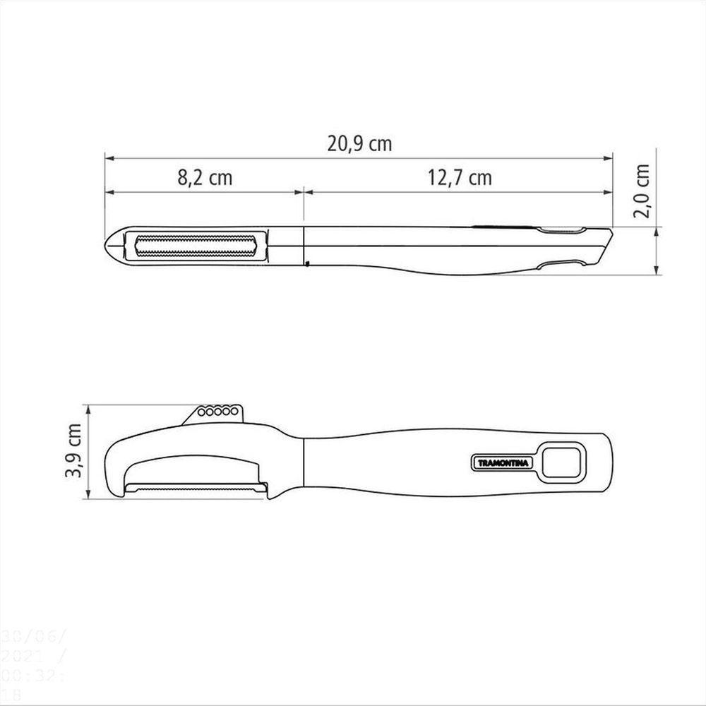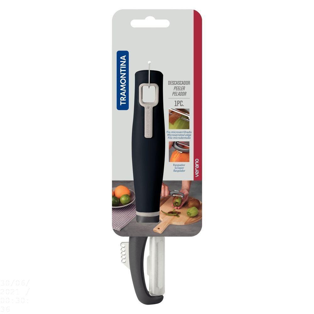 Descascador Tramontina Verano Com Lâmina Em Aço Inox Com Fio Microsserrilhado E Cabo De Polipropilen TramontinaDescascador Tramontina Verano com Lâmina em Aço Inox com Fio Microsserrilhado e Cabo de Polipropileno Ônix Tramontina -Quer garantir sabor e beleza aos seus pratos? Com o Descascador Tramontina Verano com Lâmina em Aço Inox com Fio Microsserrilhado e Cabo de Polipropileno Ônix você conta com um item robusto e resistente, que tem lâmina principal com fio microsserrilhado para alimentos macios e lâmina auxiliar que serve como raspador para retirar pequenas lascas de alimentos como chocolate e limão. Além disso, por ser resistente à máquina de lavar louças se torna um item muito prático para o seu dia a dia. Aproveite o cabo ergonômico, que torna tudo mais fácil de manusear. Você não vai se arrepender!OrientaçõesDescascador com lâmina de aço inox que proporcionam resistência durante o uso.Cabo de polipropileno com furo passante possibilitando que seja pendurado na sua cozinha.Estrutura de ABS.Pode ir à máquina de lavar louças facilitando seu dia a dia.Características GeraisEAN137891112263147DUN1417891112263144NCM8205.51.00Peso Líquido0,0650 kg.Peso Bruto0,0700 kg.Metragem0,000419 m³.Dimensões Embalagem (Compr. X Larg. X Alt.)80x 20x 262 mm.Dimensões Produto (Compr. X Larg. X Alt.)209x 39x 20 mm.Cor 1333F48 HexaCor 2707372 HexaObservaçõesAntes da primeira utilização, lave bem a peça e seque-a.Para maior durabilidade do produto recomenda-se secar bem antes de guardar, mesmo após lavagem em máquina.Para descarte do produto e embalagem siga as orientações de reciclagem vigentes.Características Gerais do Produto:Garantia: - 1 Ano