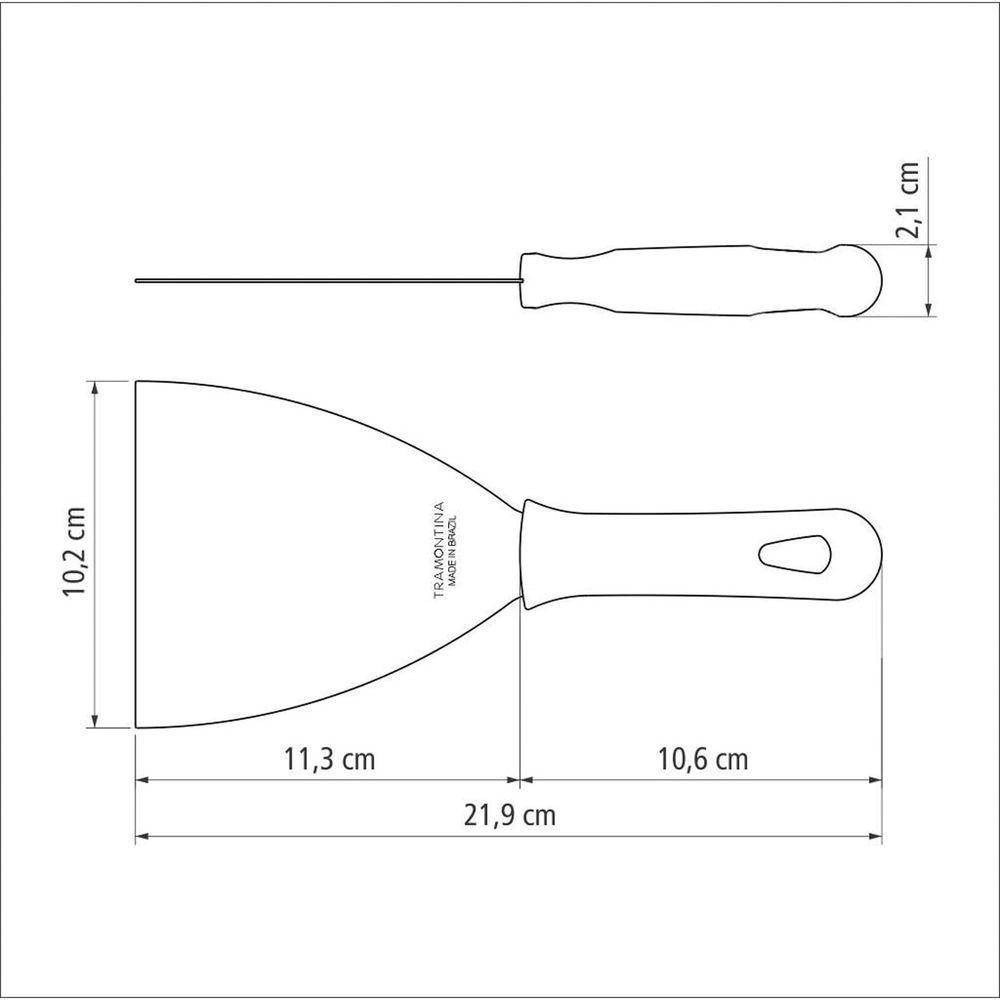 Espátula Tramontina Premium Com Lâmina Em Aço Inox E Cabo De Polipropileno Branco 4" TramontinaEspátula Tramontina Premium com Lâmina em Aço Inox e Cabo de Polipropileno Branco 4 Tramontina -A Espátula Tramontina Premium com Lâmina em Aço Inox e Cabo de Polipropileno Branco 4 polegadas vai ser o auxiliar perfeito em sua cozinha! Produzida com lâmina em aço inox, ela garante durabilidade e resistência em uma lâmina de 4 polegadas. Seu cabo de polipropileno na cor branca, tem design anatômico e texturizado, o que garante maior segurança e conforto no manuseio. É ainda muito fácil de limpar e pode ir à máquina de lavar louças. Um item que não pode faltar para preparar as melhores receitas!OrientaçõesA lâmina de aço inox tem maior durabilidade do fio devido ao tratamento térmico.O cabo de polipropileno possui maior resistência e durabilidade.Pode ir à máquina de lavar louças facilitando seu dia a dia.ObservaçõesAntes da primeira utilização, lave bem a peça e seque-a.Para maior durabilidade dos produtos recomenda-se secar bem antes de guardar, mesmo após lavagem em máquina.Para descarte dos produtos e embalagens siga as orientações de reciclagem vigentes.Características GeraisEAN137891112263925DUN1417891112263922NCM8215.99.10Peso Líquido0,0850 kg.Peso Bruto0,0900 kg.Metragem0,000529 m³.Dimensões Embalagem (Compr. X Larg. X Alt.)103x 20x 257 mm.Dimensões Produto (Compr. X Larg. X Alt.)219x 102x 21 mm.Cor 1FFFFFF HexaCaracterísticas Gerais do Produto: - Cor: Branco Garantia: - 1 Ano