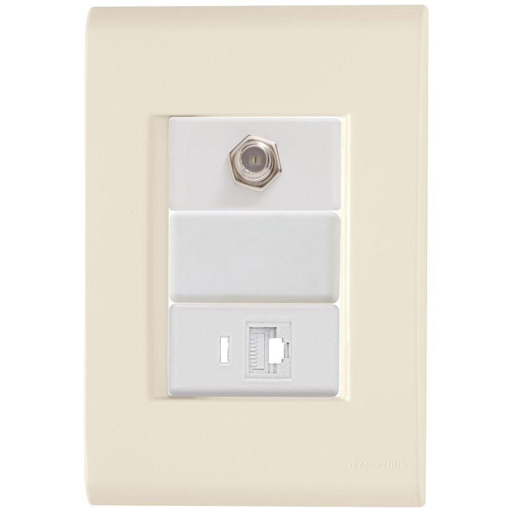 Cj Tomadas RJ45 Ethernet + TV Coaxial Liz Bege Tramontina completo pronto Tramontina -Placa 4x2 - 3 postos - Liz BegePara projetos mais bonitos e práticos, a Placa 3 Postos 4x2 Tramontina Liz Bege é a escolha certa. Produzida em termoplástico na cor branca, possui acabamento em brilho que não retém poeira, tornando o visual mais limpo e de qualidade. Apresenta modelo 4x2 e 3 postos horizontais para utilizar os módulos da Linha Liz. Pode ainda ser trocada por outras cores da linha, garantindo versatilidade e muito mais estilo. A placa ainda possui sistema modular em duas peças: placa e suporte, que proporciona um acabamento impecável da placa com a parede devido ao ajuste entre ambos, livre de frestas. Possui furo oblongo para facilitar a fixação e a regulagem da placa à parede, além de possuir furos que podem ser fixados em paredes de madeira. Para um visual diferenciado, a fixação não é aparente, tornando a aparência da peça mais bonita. Acompanha suporte e parafs para a instalação.Módulo Tomada de Transmissão de Dados Tramontina RJ 45 Cat 6 BrancoO Módulo para Tomada de Transmissão de Dados Tramontina RJ 45 Cat 6 Branco é produzido em termoplástico antichama e possui acabamento brilho que não retém poeira. Na cor branca, ele pode ser substituído pelo modelo na cor grafite, além de ser usada com diferentes placas da Tramontina. Uma peça que alia praticidade e qualidade, perfeita para transmissão de dados em sistema de cabeamento estruturado, como a instalação em rede de impressoras, modems e dispositivos multimídiaMódulo para Tomada TV SAT Coaxial Direta Tramontina BrancoA Módulo para Tomada TV SAT Coaxial Direta Tramontina Branco é a escolha perfeita para sua casa. Produzido em termoplástico com acabamento brilho, ele não retém poeira. É um módulo largo na cor branca que pode ser substituído pelo modelo em grafite, além de ser em diferentes placas das linhas Tramontina. É uma peça versátil e prática, que ainda garante qualidade e um bom funcionamento do que se propõe.Características Gerais do Produto:Acompanha o produto: - 1x 57106057 + 1x 57115042 + 1x 57115056 + 1x 57115090
