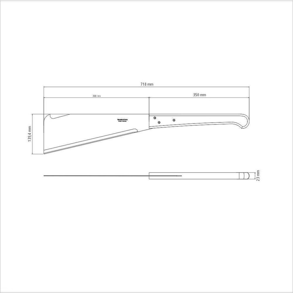 Facão Tramontina Para Cana Com Lâmina Em Aço Carbono E Cabo Em Madeira 15" TramontinaFacão Tramontina para Cana com Lâmina em Aço Carbono e Cabo em Madeira 15 Tramontina -Para deixar seu trabalho muito mais eficiente e prático, tenha em suas mãos o facão Tramontina para cana com lâmina em aço carbono e cabo em madeira 15 polegadas. Desenvolvido para levar o melhor para sua rotina, ele tem lâmina em aço carbono com tratamento térmico e camada de verniz protetiva, o que proporciona maior resistência e alto poder de corte. O cabo é em madeira com rebites de alumínio e devido ao material e design ergonômico, oferece um manuseio muito mais confortável e seguro. Escolha Tramontina e tenha qualidade literalmente, na palma da sua mão!OrientaçõesLâmina de aço carbono com tratamento térmico especial que proporciona maior dureza, resistência do fio e maior poder de corte.Lamina com aplicação de uma camada de verniz como revestimento protetivo, a qual possui a função de proteção durante as etapas de transporte, armazenamento e primeiros usos.Cabo de madeira rebitado que garante maior segurança, ergonomia perfeita e conforto no manuseio.Rebites de alumínio.Características GeraisEAN137891112082311DUN1417891112082318NCM8201.40.00Peso Líquido0,5500 kg.Peso Bruto0,5500 kg.Metragem0,002318 m³.Dimensões Embalagem (Compr. X Larg. X Alt.)720x 140x 23 mm.Dimensões Produto (Compr. X Larg. X Alt.)718x 139x 23 mm.ObservaçõesTenha cuidado ao manusear produtos cortantes e perfurantes e mantenha-os fora do alcance de crianças.Para garantir a durabilidade do produto, recomenda-se lavar, secar bem e aplicar uma fina camada de óleo alimentício após cada uso.Não utilize solventes e materiais abrasivos para a limpeza.Armazene em local seco.Para descarte do produto e embalagem siga as orientações de reciclagem vigentes.Características Gerais do Produto:Garantia: - 1 Ano