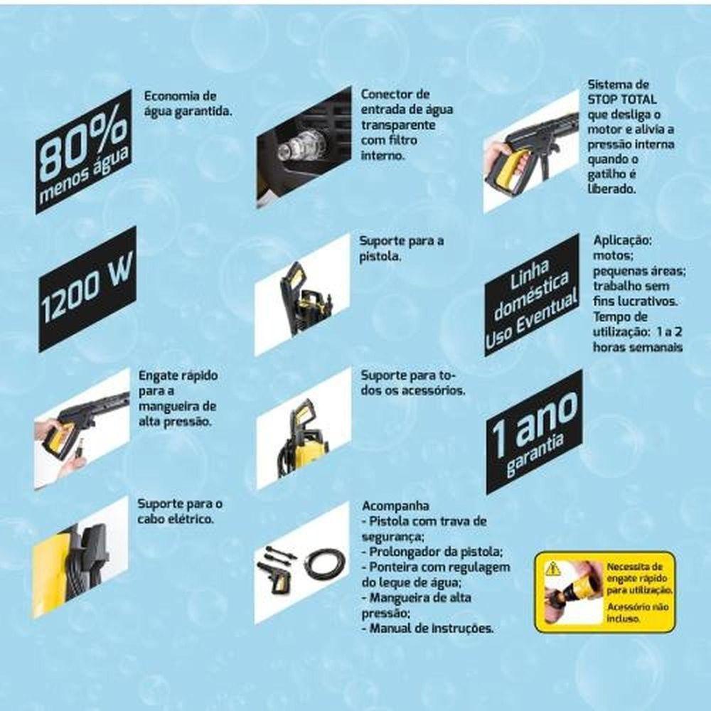 Lavadora De Alta Pressão 1200 Watts Tramontina 1500PSI 110VLavadora de Alta Pressão 1200 Watts 127 Volts - Tramontina - 1500 Psi - 5,5-6,5 l/min -LAVADORA DE ALTA PRESSÃO 1200 WATTS 127 VOLTS - TRAMONTINACom a Lavadora de Alta Pressão 1200 Watts 127 Volts da Tramontina, você terá a solução perfeita para limpar sua casa, quintal, carro e muito mais com praticidade e eficiência. Seja para remover sujeiras leves ou pesadas, essa lavadora é a escolha ideal para facilitar o seu dia a dia.- Mangueira de alta pressão de 3 metros.- Pressão máxima: 1500 Psi.- Pressão de trabalho: 1000 Psi.- Vazão: 5,5 - 6,5 l/min.- Potência: 1200 W.- Tensão: 127 V.- Motor equipado com sistema de stop total.- Acompanha: pistola de alta pressão, prolongador da pistola, ponteira para regular o jato de saída de água, mangueira de alta pressão e manual de instruções.Com a Lavadora de Alta Pressão 1200 Watts 127 Volts da Tramontina, você terá em mãos uma ferramenta poderosa para deixar tudo limpo e brilhante. Seja para uso doméstico ou profissional, essa lavadora oferece qualidade, durabilidade e performance excepcionais. Não perca mais tempo e garanta já a sua!ESPECIFICAÇÕES TÉCNICAS:- Marca: Tramontina Universo do Lar- Modelo: Lavadora de Alta Pressão- Potência: 1200 Watts- Tensão: 127 Volts- Pressão máxima: 1500 Psi- Pressão de trabalho: 1000 Psi- Vazão: 5,5 - 6,5 l/min- Comprimento da mangueira: 3 metros- Acompanha pistola de alta pressão, prolongador da pistola, ponteira para regular o jato de saída de água, mangueira de alta pressão e manual de instruçõesGARANTIA: Conte com a qualidade e a garantia de satisfação da Tramontina Universo do Lar. Garanta já a sua lavadora e tenha resultados impecáveis em suas limpezas!--------Descrição Original enviada pelo Fornecedor:LAVADORA DE ALTA PRESSÃO 1200 WATTS 127 VOLTS - TRAMONTINAMangueira de alta pressão de 3 metros.Pressão máxima: 1500 Psi.Pressão de trabalho: 1000 Psi.Vazão: 5,5 - 6,5 l/min.Potência: 1200 W.Tensão: 127 V.Motor equipado com sistema de stop total.Acompanha: pistola de alta pressão, prolongador da pistola, ponteira para regular o jato de saída de água, mangueira de alta pressão e manual de instruções.Características Gerais do Produto:Garantia:- 3 Meses