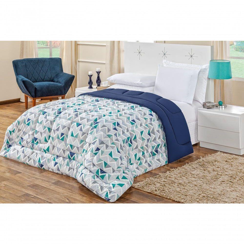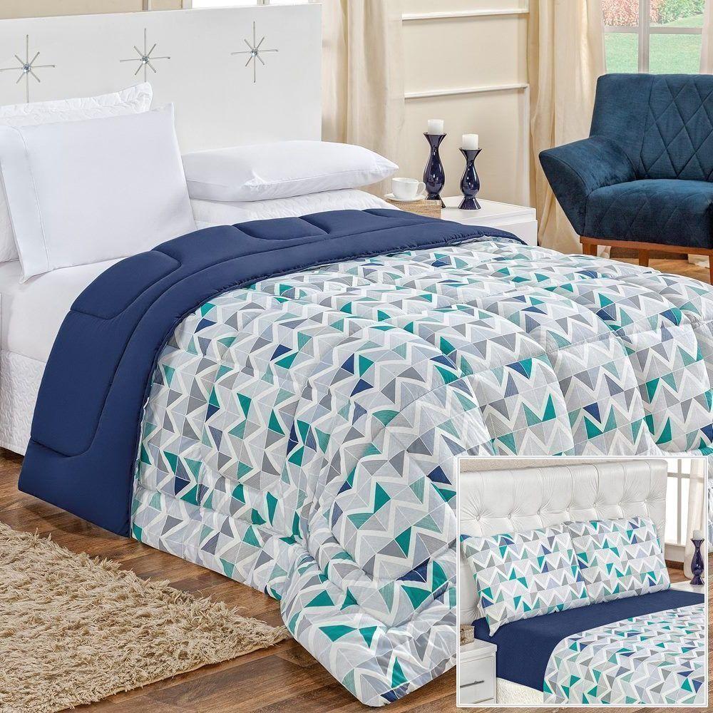 Edredom 2,40 X 2,20m + Jogo De Cama Malha Quality Queen 05 Peças 100% Algodão - Geométrico Azul