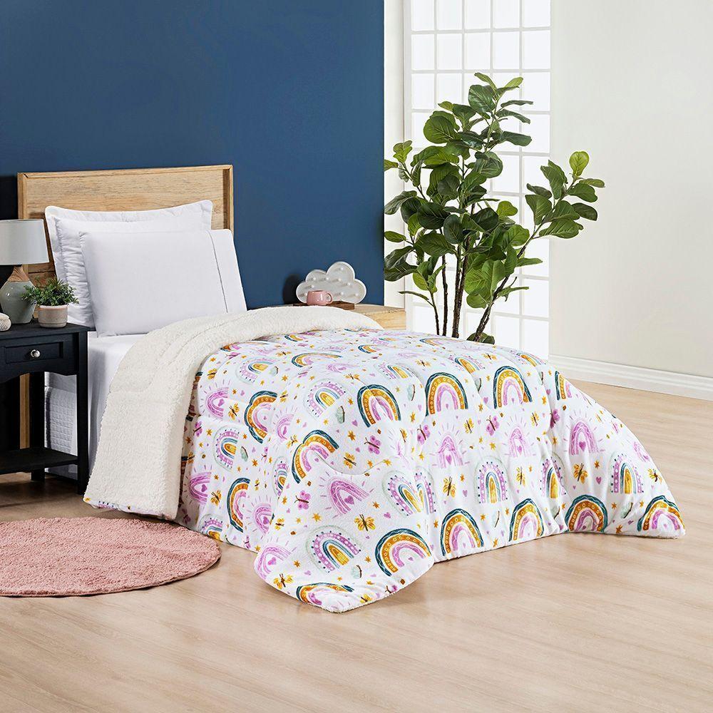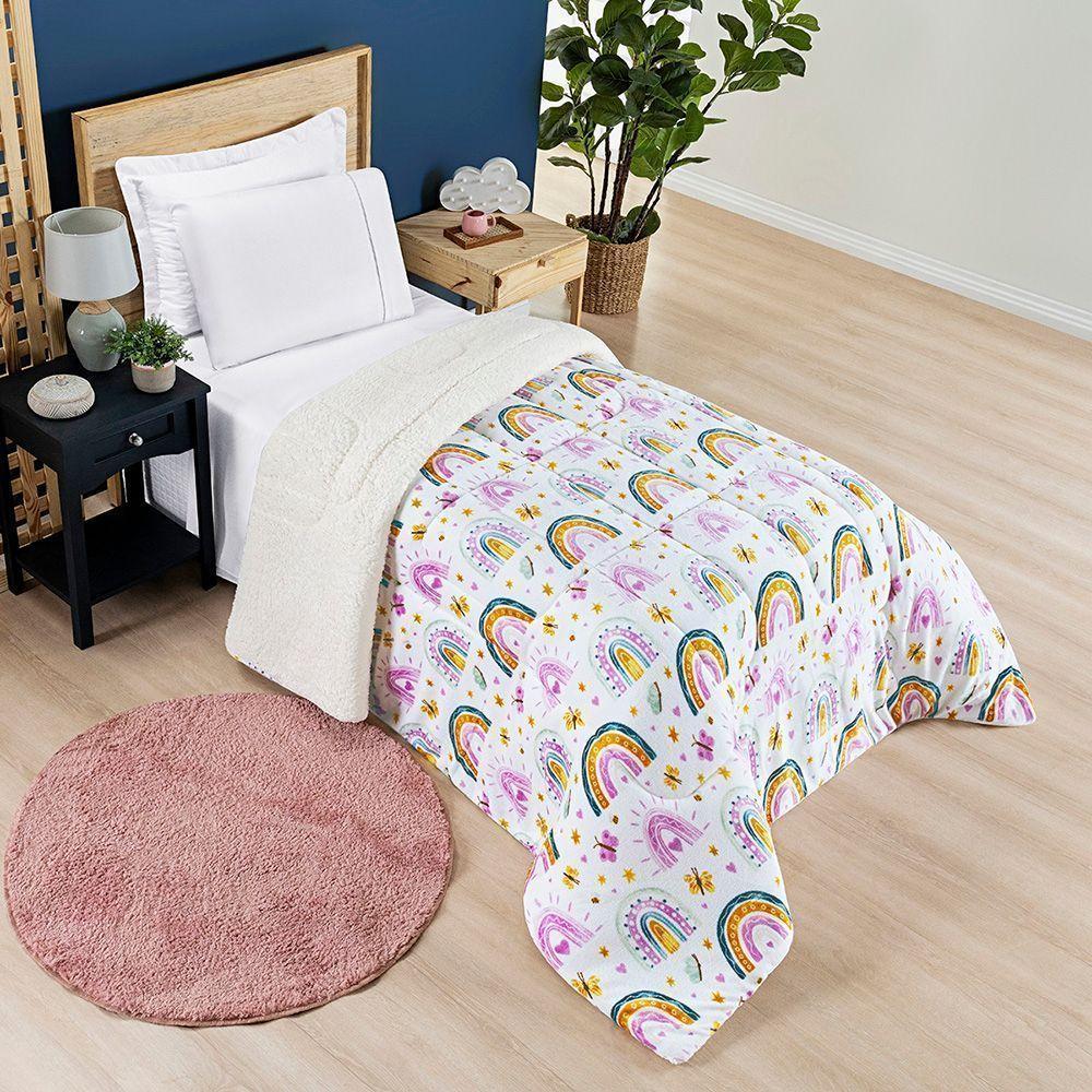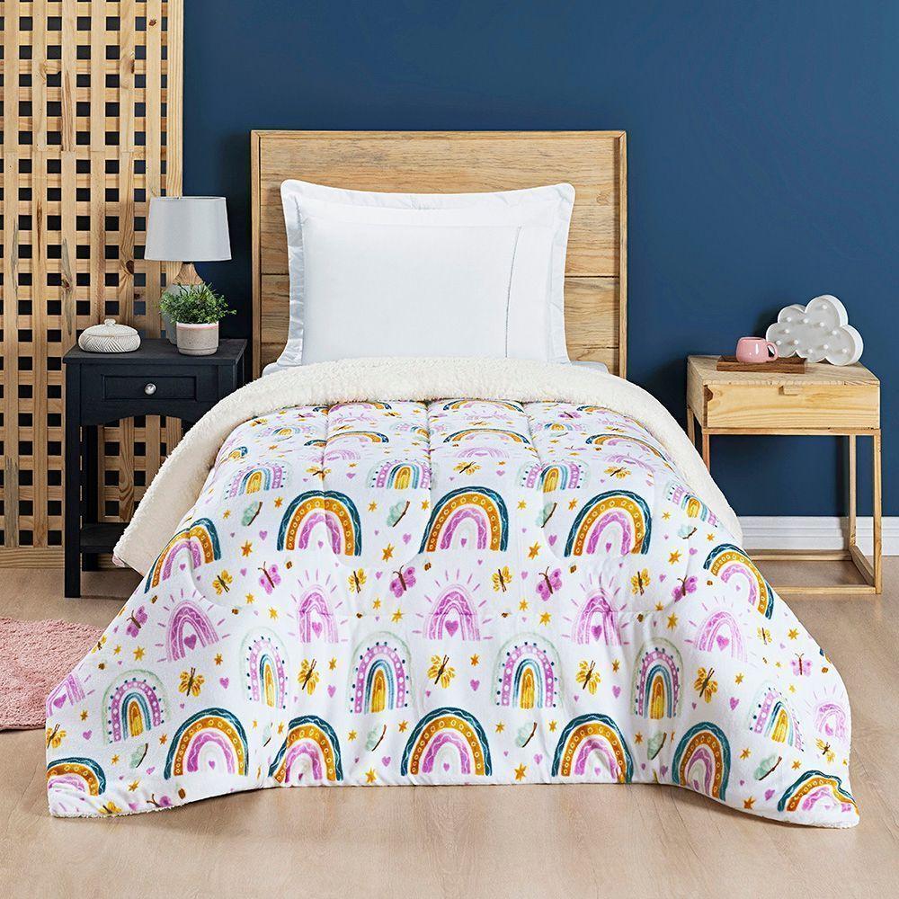 Coberdrom Solteiro Tutti Kids Manta Alta 150 G/m² Dupla Face Flannel E Sherpa 01 Peça 100% Poliéster - RainbowCoberdrom Solteiro Tutti Kids: Maciez que abraça, magia que aquece.Transforme o quarto das crianças em um espaço cheio de cor, imaginação e aconchego. O Coberdrom Tutti Kids foi criado para trazer alegria ao ambiente, com estampas exclusivas que encantam e dão vida ao quarto infantil. São quatro opções cheias de personalidade: Dino World, Manny, Rainbow e Foxy, cada uma pensada para acompanhar o universo lúdico das crianças e deixar as noites ainda mais especiais.O Coberdrom Tutti Kids é dupla face e oferece dois tipos de aconchego em uma única peça. De um lado, a manta flannel proporciona toque macio e quentinho. Do outro, a sherpa fofinha envolve como um abraço, perfeita para os dias mais frios. Juntas, essas texturas criam uma combinação irresistível de conforto, leveza e bem-estar.Cada detalhe foi pensado para unir praticidade e beleza no dia a dia. O Coberdrom Tutti Kids tem acabamento caprichado, caimento confortável e gramatura ideal para manter o calor sem perder suavidade, tornando as noites mais aconchegantes e acolhedoras.Solteiro (01 Peça): 01 Coberdrom Solteiro: 2,40m x 1,50mComposição:Manta Microfibra Flannel: 100% PoliésterTecido Sherpa: 100% PoliésterEnchimento: 100% PoliésterGramatura da Manta (Enchimento): 150 g/m²Características do Produto:- Dupla face com flannel macia e sherpa fofinha.- Estampas exclusivas: Dino World, Manny, Rainbow e Foxy.- Toque ultramacio e sensação aconchegante.- Acabamento reforçado e caimento confortável.Benefícios:- Deixa o quarto infantil mais colorido, divertido e acolhedor.- Garante conforto e aquecimento em noites mais frias.- Permite variar o visual da cama com facilidade.- Perfeito para acompanhar o ritmo e a imaginação das crianças.