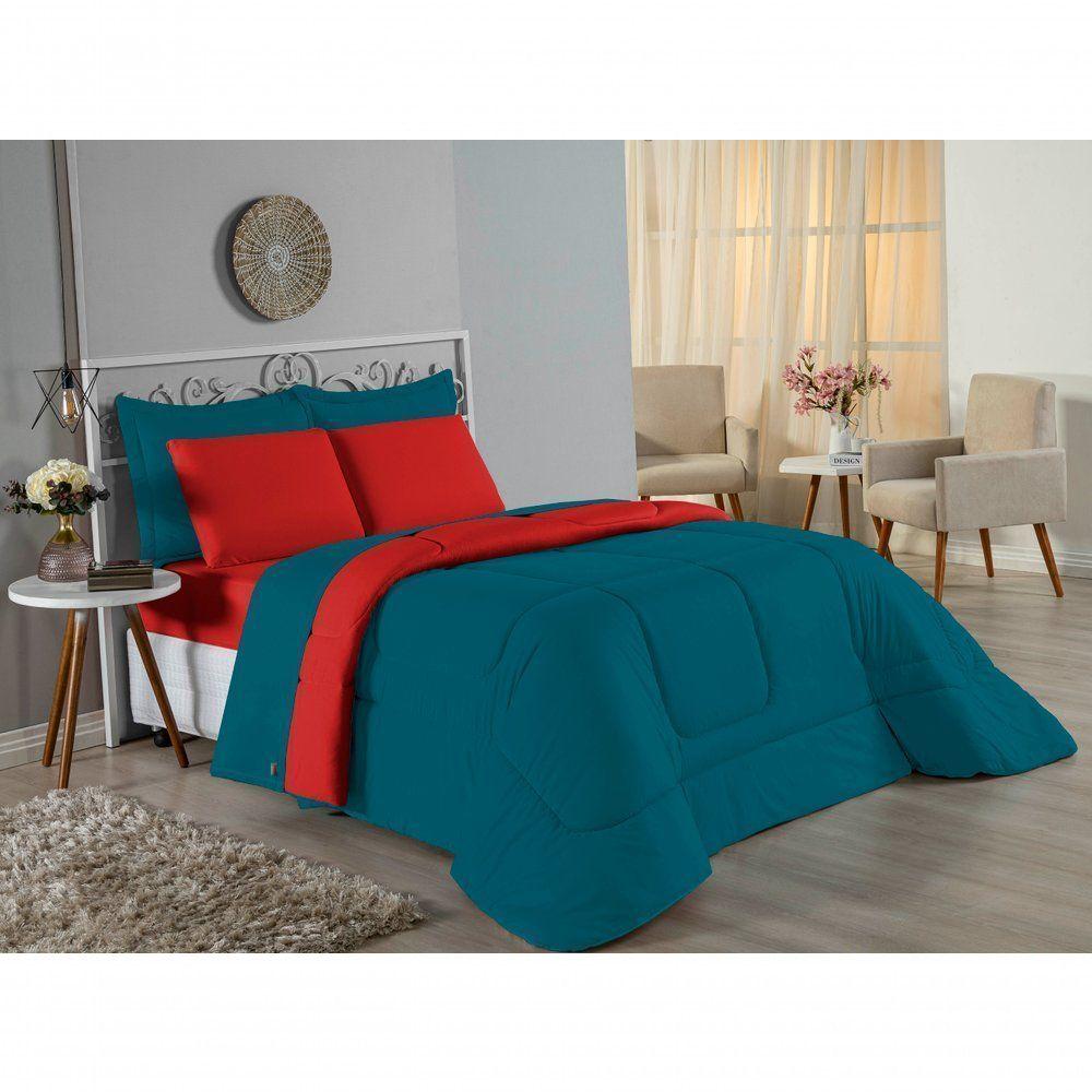 Edredom Casal Nobre 1 Peça Dupla Face 2,00m X 2,20m Malha 100% Algodão - Petróleo / Vermelho