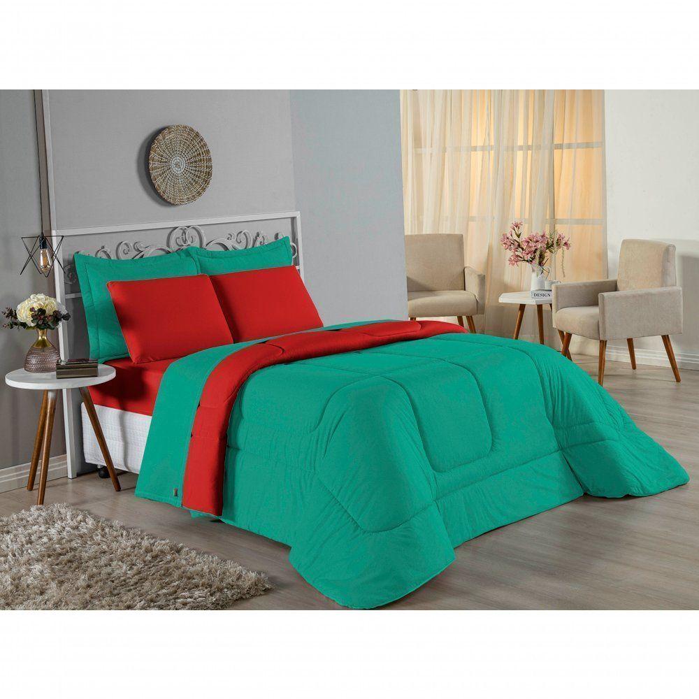 Kit Edredom Dupla Face + Jogo De Lençol Casal Nobre 7 Peças Malha 100% Algodão - Jade / Vermelho