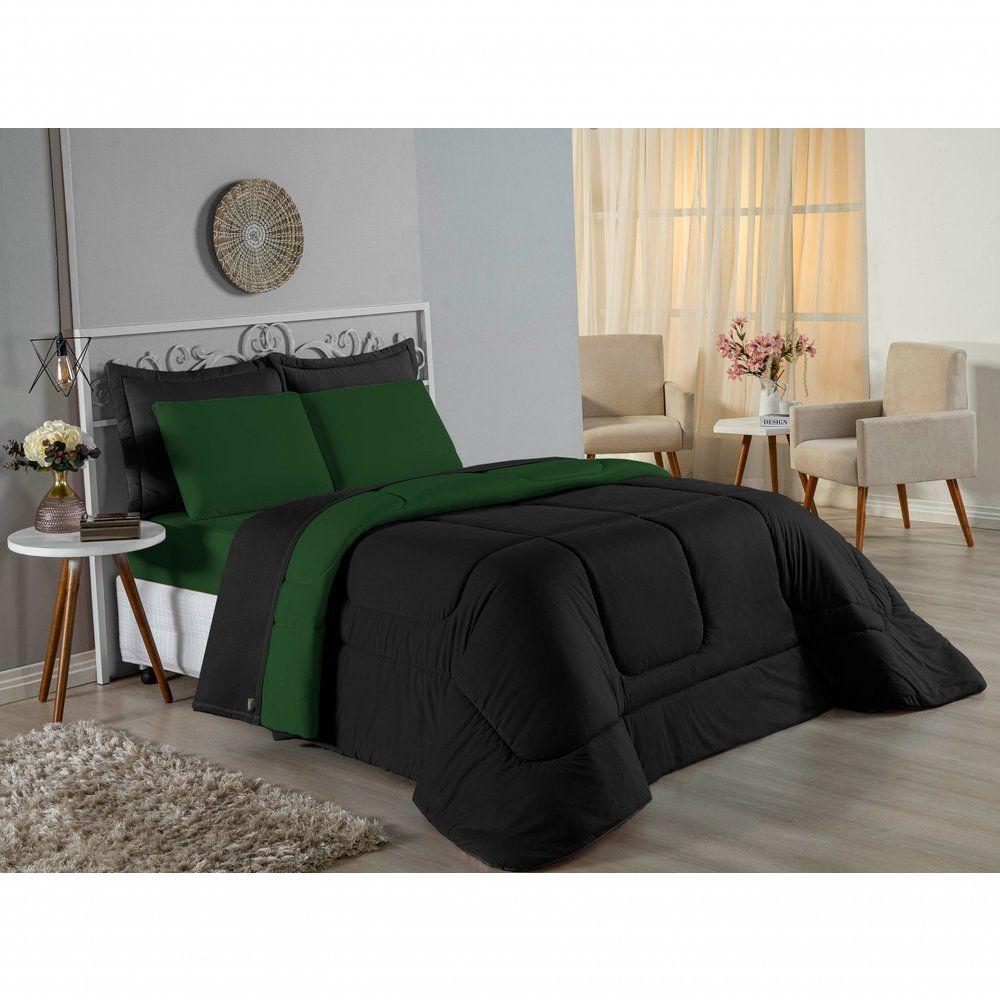 Edredom Queen Nobre 1 Peça Dupla Face 2,20m X 2,40m Malha 100% Algodão - Preto / Verde-bandeira