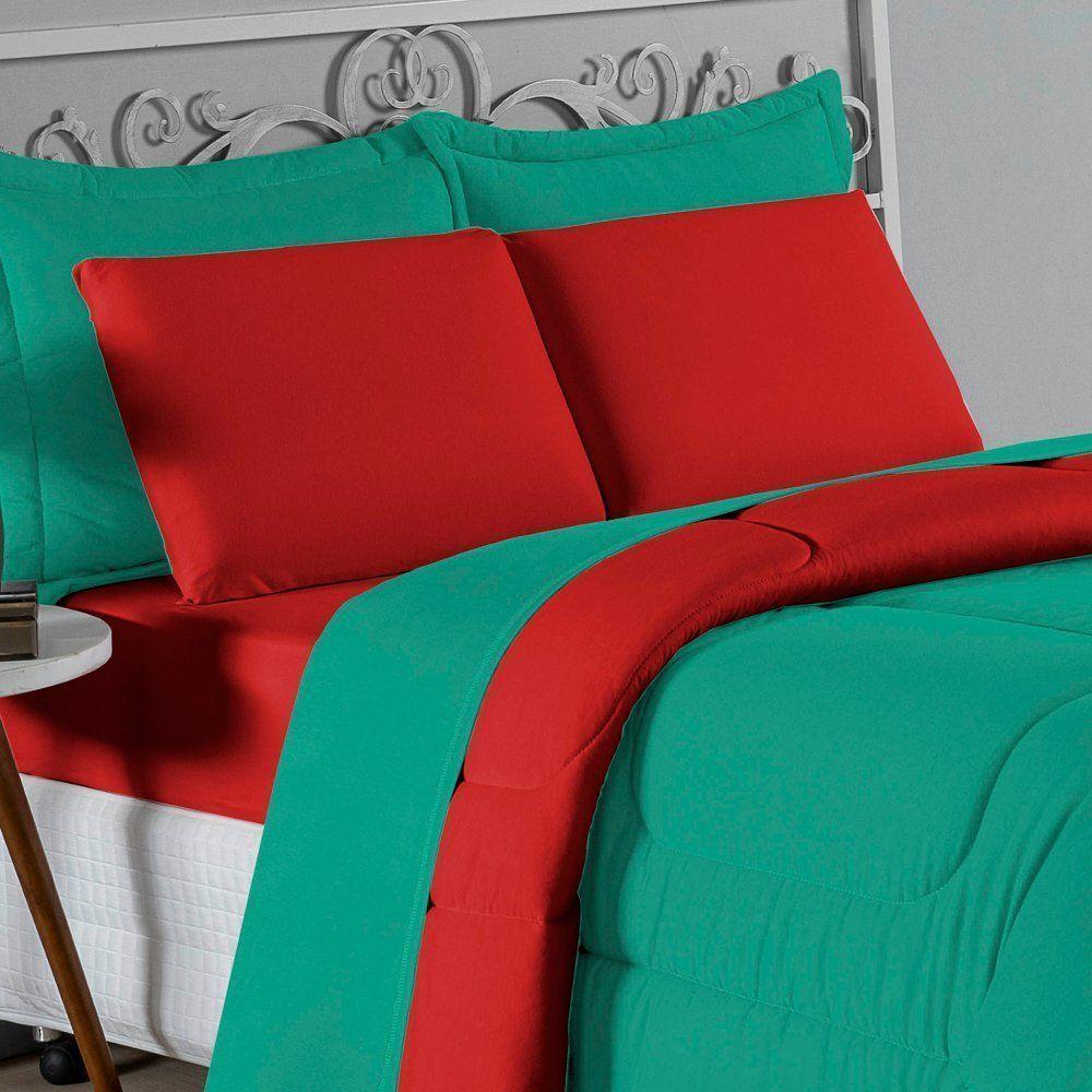 Edredom Queen Nobre 1 Peça Dupla Face 2,40m X 2,60m Malha 100% Algodão - Jade / Vermelho