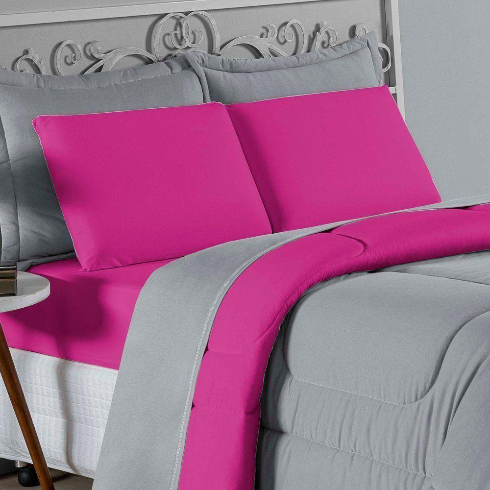Kit Edredom Dupla Face + Jogo De Lençol Casal Viúva Nobre 6 Peças Malha 100% Algodão - Cinza / Pink