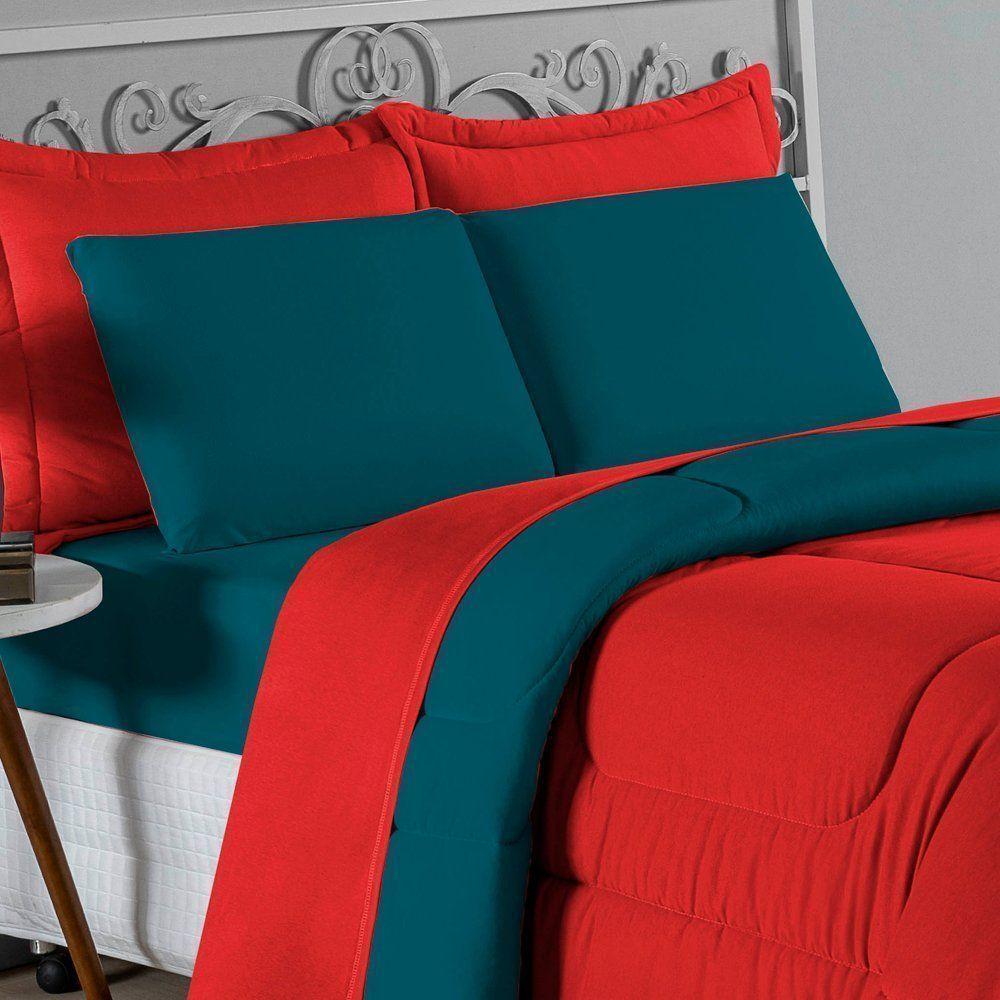Kit Edredom Dupla Face + Jogo De Lençol Casal Viúva Nobre 6 Peças Malha 100% Algodão - Vermelho / Petróleo