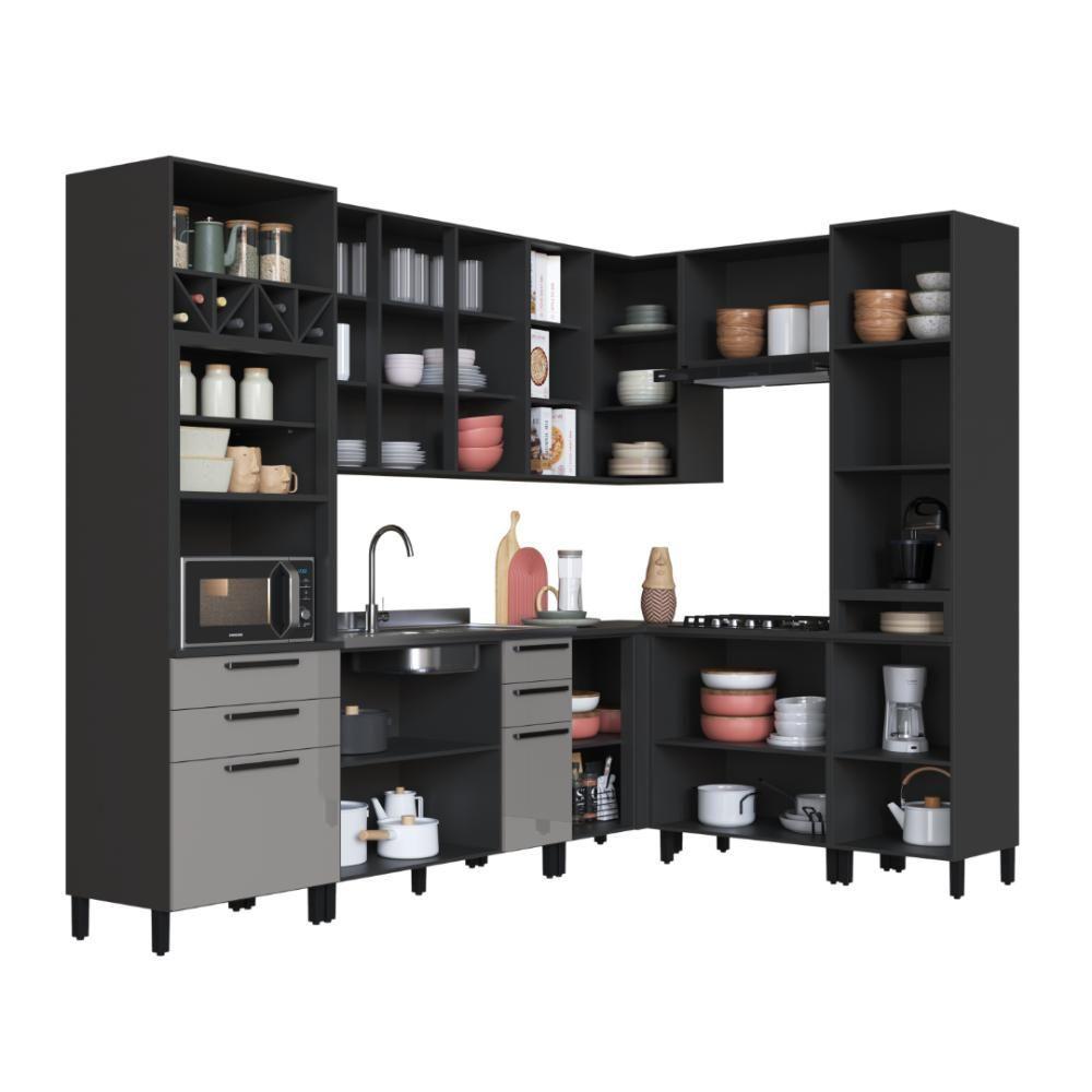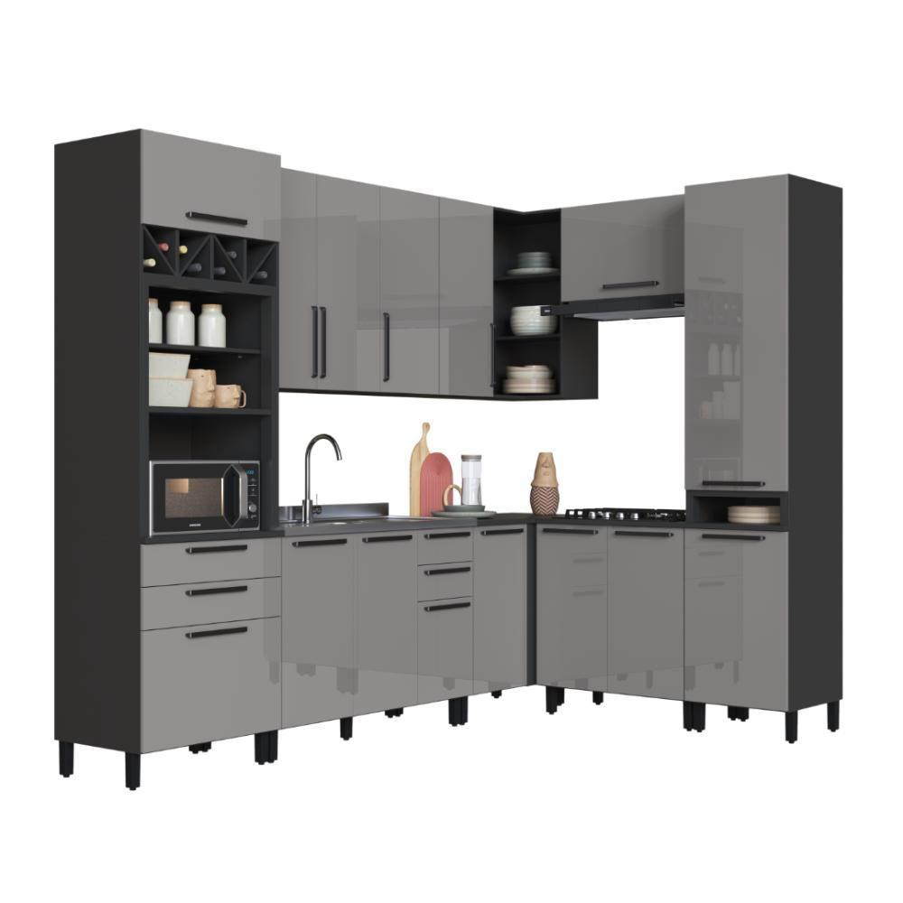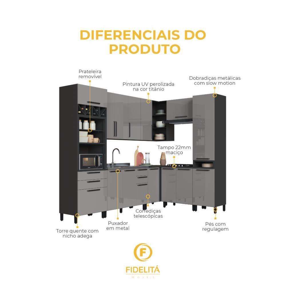 Cozinha Modulada Completa Fidelitá Mônaco 8 Peças 469cm 15 Portas 4 Gavetas Sem Tampo Chumbo/titânio