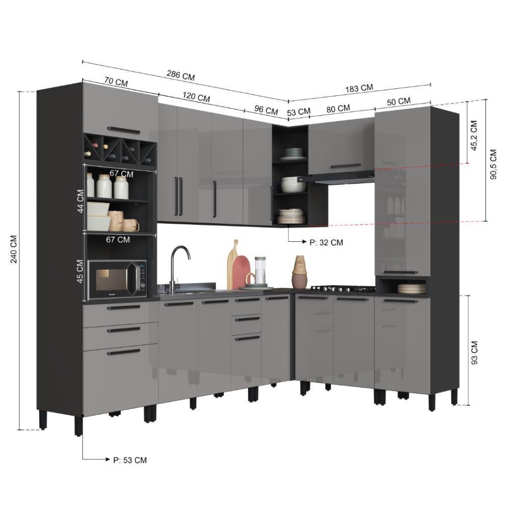Cozinha Modulada Completa Fidelitá Mônaco 8 Peças 469cm 15 Portas 4 Gavetas Sem Tampo Chumbo/titânioA Cozinha Mônaco da Fidelitá em sua versão de 8 peças é ideal para quem busca um ambiente amplo, funcional e com acabamento moderno. Com 469cm de largura, ela oferece módulos variados — incluindo torre quente com adega, paneleiro, balcão de canto e aéreos com nichos — garantindo excelente organização e um visual sofisticado para a sua cozinha.Fabricada em MDP de alta qualidade, essa versão conta com acabamento UV perolizado na cor Titânio, dobradiças metálicas slow motion, corrediças telescópicas, puxadores em metal, prateleiras removíveis, tampo maciço de 22mm (em módulos específicos) e pés com regulagem de altura (+3cm).Medidas Totais: - Altura: 240 cm - Largura: 469 cm - Profundidade: 53 cm (balcões, torre e paneleiro) | 32 cm (aéreos)Itens Inclusos: - Torre Quente 70cm – 3 portas com 4 nichos (1 adega + 1 para forno/micro-ondas) - Aéreo 120cm – 3 portas - Aéreo de Canto 149cm – 1 porta + 3 nichos abertos + 3 prateleiras internas - Aéreo 80cm – 1 porta - Paneleiro Simples 50cm – 2 portas + 1 nicho aberto - Balcão 120cm – 3 portas e 2 gavetas (sem tampo) - Balcão de Canto 77cm – 1 porta - Balcão 80cm – 2 portas (com tampo incluso)Informações Técnicas Importantes: - O balcão de 120cm é ideal para instalação de pia com até 120cm de largura por 53cm de profundidade. Esta versão não acompanha tampo.- O balcão de 80cm é compatível com cooktops de 4 ou 5 bocas, com até 62cm de largura e 32cm de profundidade. Ele não vai recortado e acompanha gabarito para instalação.- A torre quente (70cm) possui: Nicho para forno/micro-ondas com 67cm (largura) x 45cm (altura) x 53cm (profundidade) Nicho decorativo tipo adega Fundo fechado para maior segurança- Destaques do Produto: - Estrutura em MDP reforçado - Pintura UV perolizada na cor Titânio - Torre quente com nicho adega - Aéreo de canto funcional com porta, nichos e prateleiras - Balcão de canto 77cm, ideal para aproveitamento de espaço - Dobradiças metálicas com slow motion - Corrediças telescópicas - Puxadores em metal - Prateleiras removíveis - Pés com regulagem de altura (+3cm) - Tampo incluso somente no balcão de 80cmInformações Importantes: - Montagem: Produto enviado desmontado com manual e ferragens inclusas. A Fidelitá Móveis não realiza montagem. - Garantia: 6 meses contra defeitos de fabricação. - Imagem meramente ilustrativa.Perguntas Frequentes:P: O balcão de 120cm acompanha tampo? Não. Ele é indicado para instalação de pia e não acompanha tampo.P: O balcão de 80cm acompanha tampo? Sim, o tampo de 22mm está incluso no balcão de 80cm.P: O balcão de 80cm já vem recortado para cooktop? Não. Ele acompanha gabarito para recorte, facilitando a instalação de cooktops de até 62cm de largura.P: Qual o tamanho do nicho da torre quente para forno ou micro-ondas? As medidas são: 67cm (largura) x 45cm (altura) x 53cm (profundidade).P: O aéreo de canto possui funcionalidade ou é só decorativo? Funcional. Ele possui 1 porta com prateleiras internas e 3 nichos abertos externos.P: Os módulos são independentes? Sim, os módulos são separados e podem ser organizados conforme o espaço disponível na sua cozinha.P: O produto vai montado? Não. A cozinha é enviada desmontada com manual de montagem e ferragens inclusas. A montagem é de responsabilidade do comprador. MATERIAL: MDP | Tipo de móveis de cozinha: Cozinha Completa | TAMPO DO BALCÃO INCLUSO: NÂO | QUANTIDADE DE GAVETAS: 4 | QUANTIDADE DE PORTAS: 15 | PROFUNDIDADE (CM): 53 | ALTURA (CM): 240 | QUANTIDADE DE PEÇAS: 8 | LARGURA (CM): 469 | Inclui tampo: Não | Materiais do corpo: MDP | Inclui manual de montagem: Sim | Cor: Chumbo/Titânio