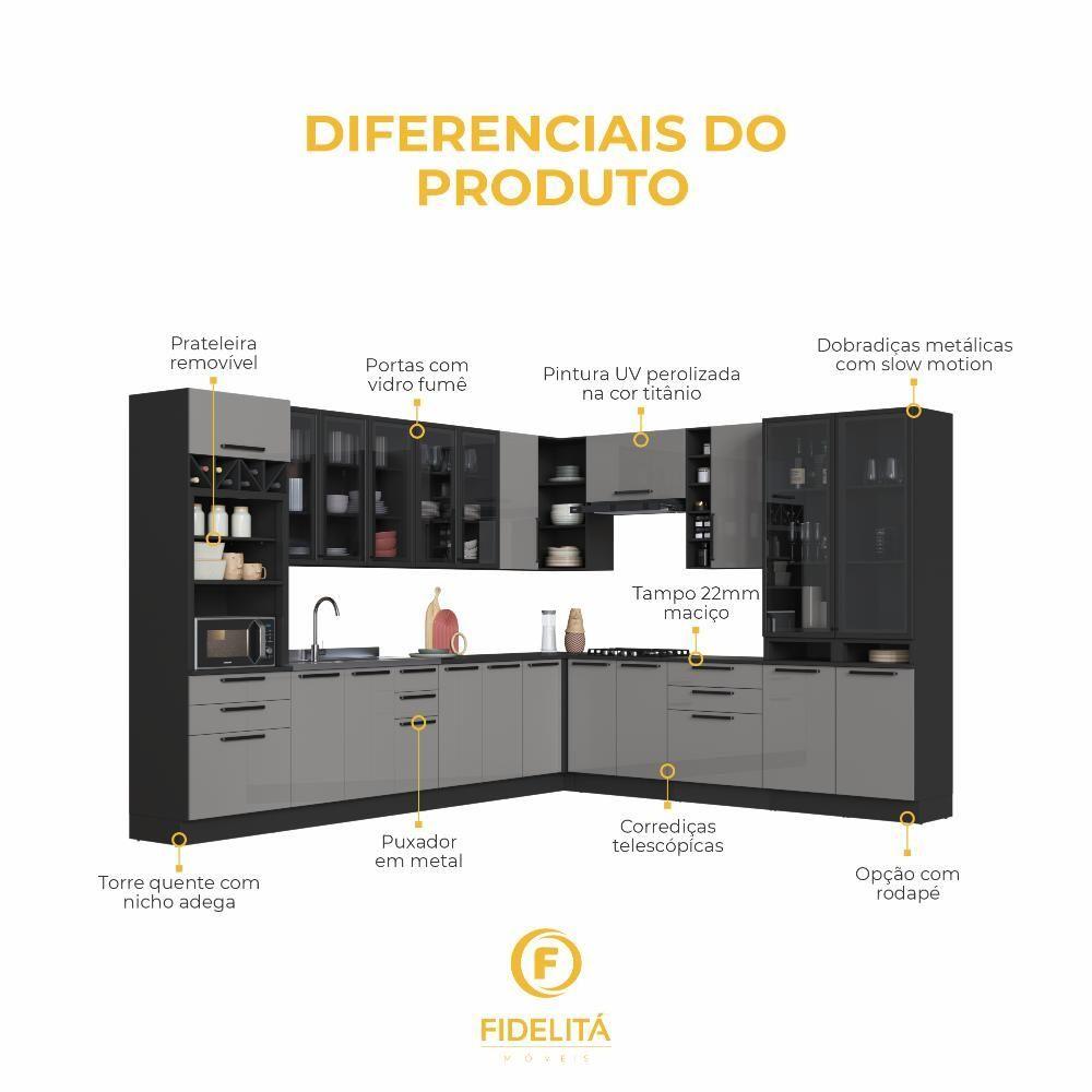Cozinha Modulada Completa Fidelitá Mônaco 14 Peças Com Rodapé 659cm 23 Portas 6 Gavetas Sem Tampo Chumbo/titânio