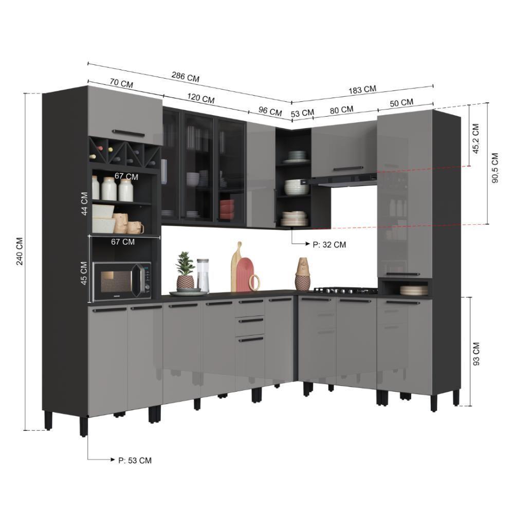 Cozinha Modulada Completa Fidelitá Mônaco 8 Peças 469cm 16 Portas 2 Gavetas Com Tampo Chumbo/titânioA Cozinha Mônaco da Fidelitá é ideal para quem busca um ambiente moderno, amplo e com acabamento sofisticado. São 8 módulos que unem beleza e funcionalidade, com estrutura robusta, puxadores em metal e espaço inteligente para forno, micro-ondas, adega e cooktop.Produzida em MDP de alta qualidade, esta versão conta com pintura UV perolizada na cor Titânio, portas com vidro fumê, tampo maciço incluso, pés com regulagem de altura (+3cm), corrediças telescópicas e dobradiças metálicas com slow motion.Medidas Totais: - Altura: 240 cm - Largura: 469 cm - Profundidade: 53 cm (balcões e torre) | 32 cm (aéreos)Itens Inclusos: - Torre Quente 70cm – 3 portas com 4 nichos (1 adega e 1 para forno/micro-ondas) - Aéreo 120cm – 3 portas com vidro - Aéreo de Canto 149cm – 1 porta com 3 prateleiras internas e 3 nichos abertos - Aéreo 80cm – 1 porta - Paneleiro Simples 50cm – 2 portas + 1 nicho aberto - Balcão 120cm – 3 portas e 2 gavetas (com tampo) - Balcão de Canto 77cm – 1 porta (com tampo) - Balcão 80cm – 2 portas (com tampo)Informações Técnicas Importantes: - O balcão de 120cm é ideal para colocação de pia com até 120cm de largura e 53cm de profundidade. O tampo incluso pode ser retirado para instalação, sem necessidade de recorte.- O balcão de 80cm é compatível com cooktops de 4 ou 5 bocas com até 62cm de largura e 32cm de profundidade. Acompanha gabarito de instalação, mas não vai recortado.- A torre quente possui fundo fechado e 4 nichos, sendo 1 adega e 1 com as seguintes medidas para forno ou micro-ondas: 67cm (largura) x 45cm (altura) x 53cm (profundidade)- Destaques do Produto: - Estrutura em MDP reforçado - Pintura UV perolizada na cor Titânio - Portas com vidro fumê - Dobradiças metálicas com slow motion - Corrediças telescópicas nas gavetas - Puxadores em metal - Torre quente com nicho adega - Prateleiras removíveis - Tampo 22mm maciço incluso - Pés com regulagem de altura (+3cm)Informações Importantes: - Montagem: Produto enviado desmontado com manual e ferragens inclusas. A Fidelitá Móveis não realiza montagem. - Garantia: 6 meses contra defeitos de fabricação. - Imagem meramente ilustrativa.Perguntas Frequentes:P: O balcão de 120cm acompanha tampo? Sim. O tampo está incluso e pode ser removido para instalação de pia.P: O balcão de 80cm acompanha tampo? Sim. O tampo está incluso e pronto para uso.P: Preciso recortar o tampo para instalar cooktop? Não. O balcão de 80cm não é recortado, mas acompanha gabarito de instalação.P: O nicho da torre quente serve para qualquer forno? Recomendamos conferir as medidas internas do nicho: 67cm (L) x 45cm (A) x 53cm (P).P: Os módulos são independentes? Sim. Todos os módulos são separados e podem ser organizados conforme o espaço disponível.P: A cozinha é enviada montada? Não. O produto é enviado desmontado com manual e ferragens. A montagem fica por conta do comprador. MATERIAL: MDP | Tipo de móveis de cozinha: Cozinha Completa | TAMPO DO BALCÃO INCLUSO: SIM | QUANTIDADE DE GAVETAS: 2 | QUANTIDADE DE PORTAS: 16 | PROFUNDIDADE (CM): 53 | ALTURA (CM): 240 | QUANTIDADE DE PEÇAS: 8 | LARGURA (CM): 469 | Inclui tampo: Sim | Materiais do corpo: MDP | Inclui manual de montagem: Sim | Cor: Chumbo/Titânio