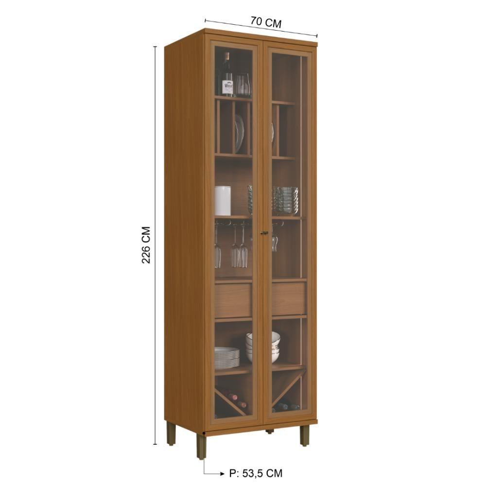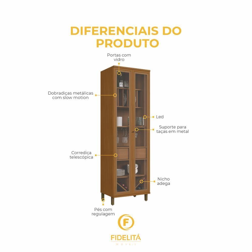 Cristaleira Fidelitá Barcelona Com Led 2 Portas Com Vidro 1 Gaveta 70cm FreijóA Cristaleira Barcelona da Fidelitá Móveis é a peça ideal para quem busca sofisticação sem abrir mão da praticidade. Com duas portas de vidro incolor e iluminação LED embutida, ela valoriza sua coleção de cristais, taças, vinhos e utensílios decorativos. Seu acabamento amadeirado em Freijó traz um toque de aconchego ao ambiente, combinando perfeitamente com salas de jantar, livings e áreas gourmet.No interior, a cristaleira conta com compartimentos pensados nos mínimos detalhes: - Nichos verticais para pratos ou bandejas - Adega inferior para garrafas - Gaveta funcional centralizada para utensílios - Prateleiras abertas para louças e objetos decorativos - Suporte metálico para taças suspensas, facilitando o manuseio e adicionando charme ao conjuntoTudo isso em uma estrutura compacta de apenas 70cm de largura, ideal para quem quer otimizar espaço com elegância.Dimensões do Produto: - Altura: 226 cm - Largura: 70 cm - Profundidade: 53,5 cm - Peso: 87,8 kgItens Inclusos: - (1x) Cristaleira Fidelitá Barcelona Com Led Integrado - (1x)Manual de Montagem - (1x) Kit FerragensInformações Importantes: - Montagem: Produto enviado desmontado. Acompanha manual de instalação e ferragens. A Fidelitá Móveis não realiza montagem. - Garantia: 6 meses contra defeitos de fabricação. - Imagem meramente ilustrativa. Itens decorativos não acompanham o produto.Perguntas Frequentes:P: A cristaleira possui iluminação LED? Sim, a peça vem com iluminação LED integrada, valorizando os itens expostos.P: O móvel possui espaço para garrafas de vinho? Sim! A parte inferior conta com nichos tipo adega, para o armazenamento de garrafas.P: É possível pendurar taças? Sim. O móvel inclui suporte metálico para taças suspensas, otimizando o espaço e trazendo sofisticação.P: O vidro das portas é transparente? Sim, o vidro é incolor, garantindo total visibilidade dos objetos.P: A Fidelitá faz a montagem? Não. A montagem é por conta do cliente. O móvel acompanha manual e kit de ferragens. Cor: FREIJO