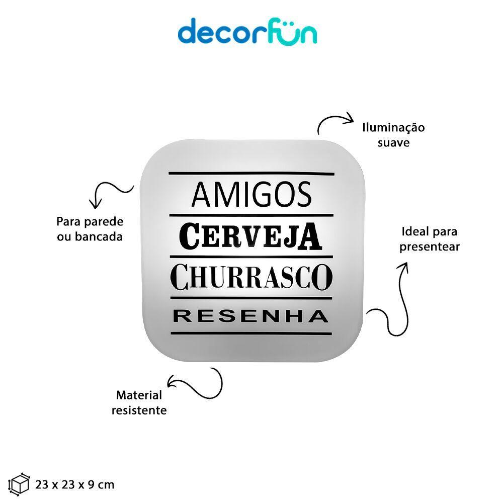 Luminária Box Resenha Entre AmigosCom a Lumiária Box Resenha Entre Amigos os encontros ficarão ;muito mais divertidos!A luminária fala exatamente tudo o que amamos fazer entre amigos. Garanta diversão para todos os eventos da turma!Especificações do produto:Tamanho: ;23 x 23 x 9cmMaterial: PolietilenoTensão: 110V/220VAlimentação: Cabo de força ;com interruptor medindo 1,8m de comprimentoCuidados: Limpar com pano úmido e macio. Teme químicos e abrasivos. Não utilizar lâmpadas incandescentes de qualquer tipoCom a Lumiária Box Resenha Entre Amigos os encontros ficarão ;muito mais divertidos!A luminária fala exatamente tudo o que amamos fazer entre amigos. Garanta diversão para todos os eventos da turma!Especificações do produto:Tamanho: ;23 x 23 x 9cmMaterial: PolietilenoTensão: 110V/220VAlimentação: Cabo de força ;com interruptor medindo 1,8m de comprimentoCuidados: Limpar com pano úmido e macio. Teme químicos e abrasivos. Não utilizar lâmpadas incandescentes de qualquer tipo