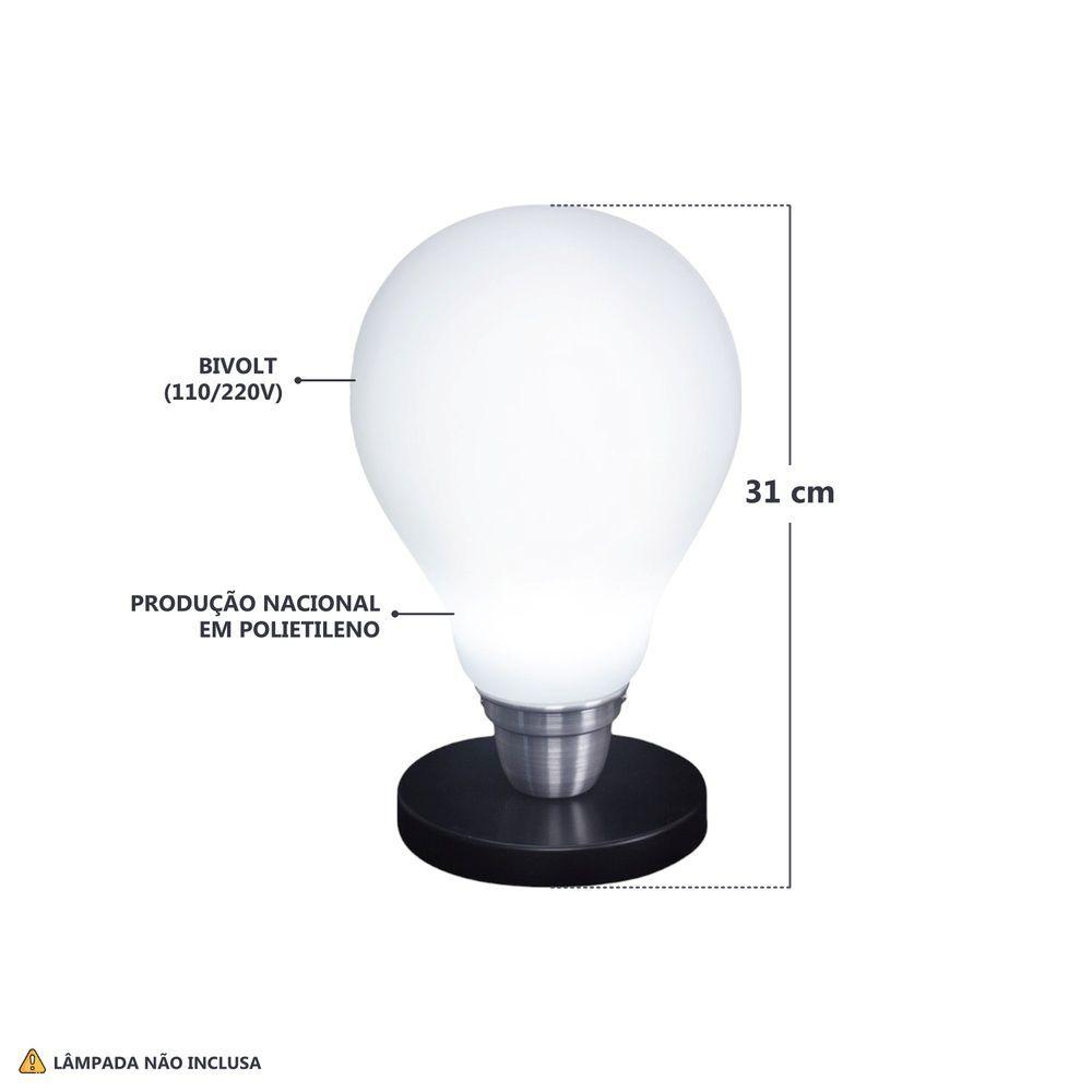 Luminária Lâmpada 3d De Mesa Branca Com Base BivoltTeve uma ideia? Precisa de uma ideia ou de uma luz para finalizar suas tarefas? A Luminária Lâmpada vai ser a sua luz!Perfeita para sua decoração, a Luminária Lâmpada , vai encantar seu quarto, seu cantinho especial e seu escritório,além de enfeitar pode agregar no espaço de leitura por ser uma luz difusa, o que não agride a visão, além de deixar o local com uma iluminação mais baixa. Sendo Bivolt com a Luminária Lâmpada , você não precisa se preocupar com nada, basta ligar na tomada e aproveitar.Especificações do produto:Material: Plástico polietileno, componentes eletrônicosDimensões: 21,5 X 30 X 31 cmDimensões do cabo: 1,8mTensão: Bivolt (110/220V)Informações de conservação: Limpar com pano úmidoInformações adicionais:Utiliza lâmpada LED até 15W ou fluorescente compacta (lâmpada NÃO inclusa). Para troca de lâmpada você precisará de uma chave philips pequena.Teve uma ideia? Precisa de uma ideia ou de uma luz para finalizar suas tarefas? A Luminária Lâmpada vai ser a sua luz!Perfeita para sua decoração, a Luminária Lâmpada , vai encantar seu quarto, seu cantinho especial e seu escritório,além de enfeitar pode agregar no espaço de leitura por ser uma luz difusa, o que não agride a visão, além de deixar o local com uma iluminação mais baixa. Sendo Bivolt com a Luminária Lâmpada , você não precisa se preocupar com nada, basta ligar na tomada e aproveitar.Especificações do produto:Material: Plástico polietileno, componentes eletrônicosDimensões: 21,5 X 30 X 31 cmDimensões do cabo: 1,8mTensão: Bivolt (110/220V)Informações de conservação: Limpar com pano úmidoInformações adicionais:Utiliza lâmpada LED até 15W ou fluorescente compacta (lâmpada NÃO inclusa). Para troca de lâmpada você precisará de uma chave philips pequena.
