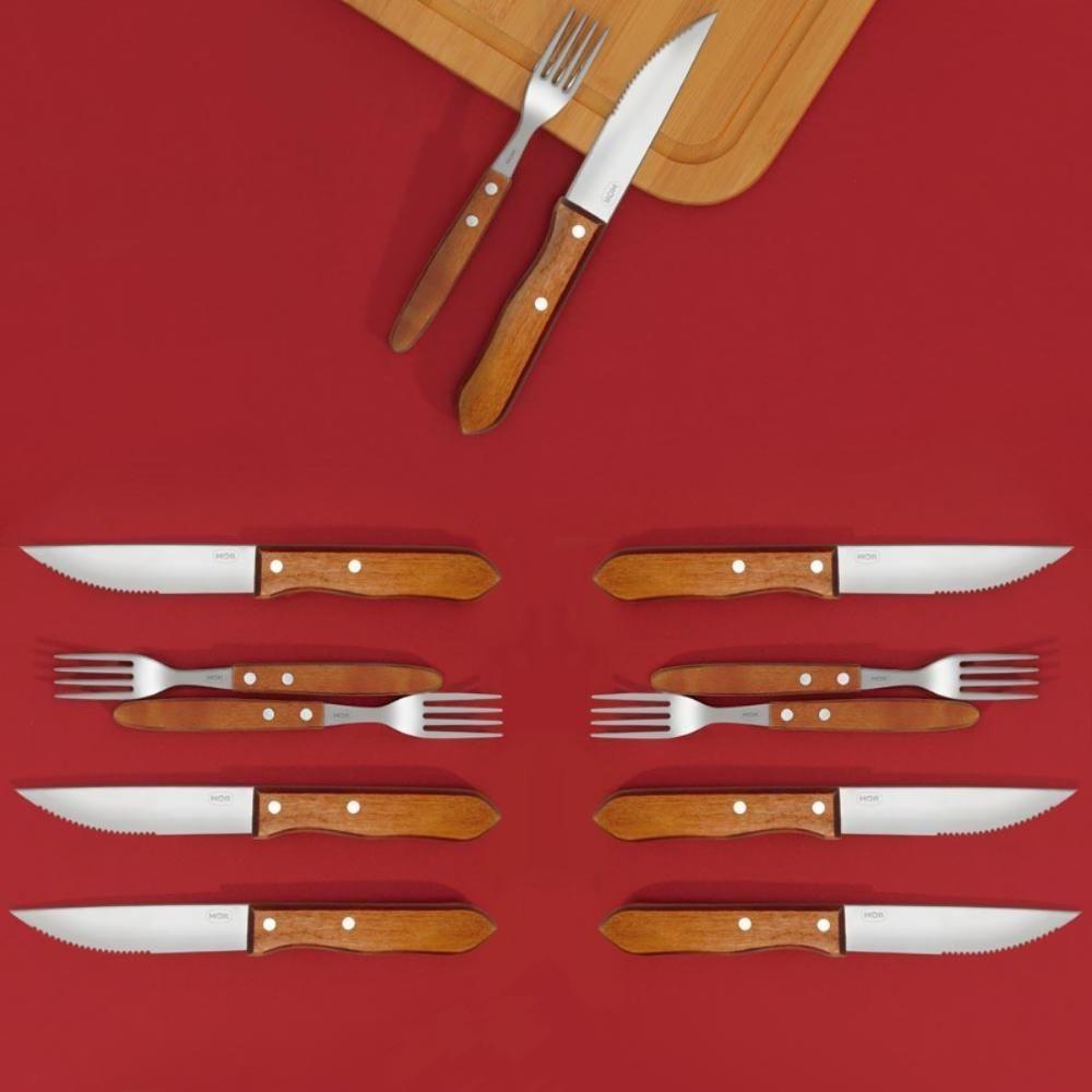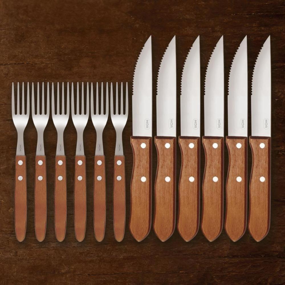 Jogo De Talheres Faqueiro Churrasco Jumbo 24 Peças MorJogo De Talheres Faqueiro Churrasco Jumbo 24 Peças MorO Conjunto para Churrasco Garfo e Faca 24 Peças Mor é excelente para fazer parte do seu almoço de domingo reunindo a família e os amigos. Unindo estilo e design, são produzidos em aço inox com cabo em madeira. Extremamente duráveis, podem ir à lava-louças e permanecem bonitos por muito mais tempo. Diferenciada, a faca de serra possui lâmina mais larga e cabo mais robusto que as facas de modelo tradicional, garantindo o manuseio firme e corte preciso até mesmo nos maiores pedaços de carne.Descrição do produto:Marca: MorMaterial: Madeira tratada e aço inoxPode ir à lava-louçasConteúdo:12 Facas 4,5 - 25cm x 2,7cm x 1,7cm12 Garfos - 20cm x 2,3cm x 2cmImagens meramente ilustrativas, todos os itens que ambientam o produto não estão inclusos. Marca: Mor | Fabricante: Mor | Origem: Nacional | Condição do Item: Novo | Modelo: Churrasco | É Kit: Sim | É apto para lava-louças: Sim | Material do cabo: Madeira tratada | Material da lâmina: Aço inox | Linha: Churrasco Jumbo | Regulamentação Produto Perigoso: Não aplicável | Unidades por kit: 24 peças | Jogo De Talheres Churrasco Jumbo: 12 Facas 4,5 e 12 Garfos | É descartável: Não | Quantidade de peças: 24 | Cor do cabo: Marrom