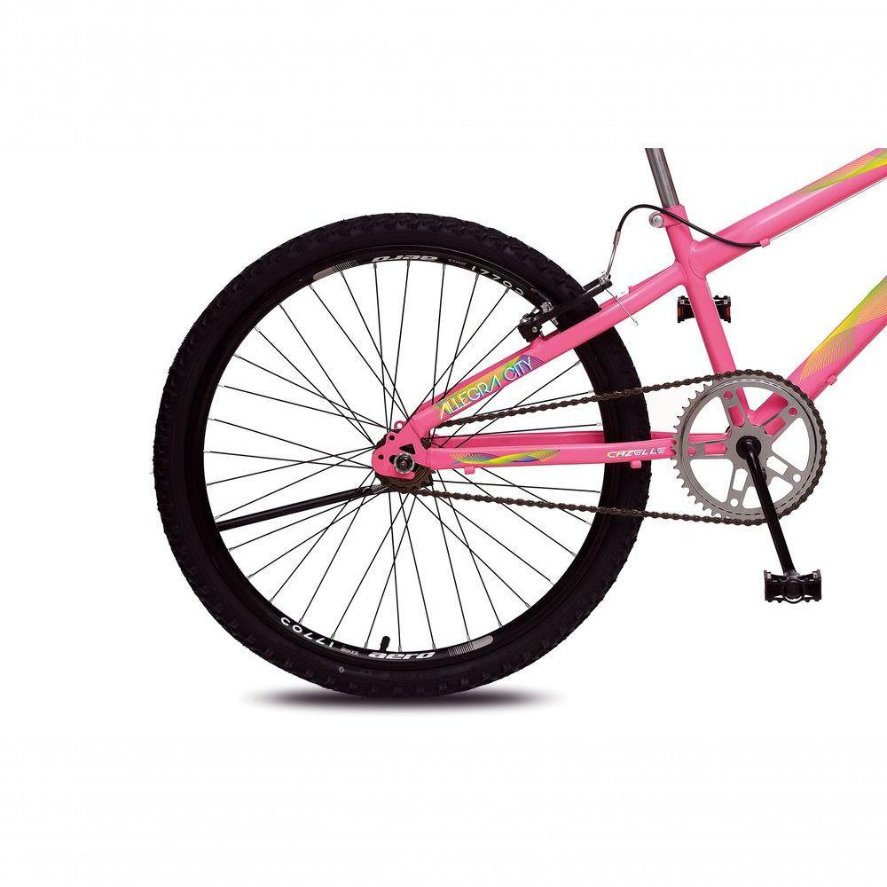Bicicleta Allegra City Aro 24 Sem Marchas Freios V-brake E Cestão Colli Rosa NeonCaracterísticas:Marca: ColliModelo: Allegra CityIdade recomendada: a partir de 12 anos.Quadro: 13Aro 24Câmara de Ar Aro 24Coroa 46DCesto: Oval medida aço com hastes.Freio: V-brake nylonGarfo 24 Colli pintadoManopla diplomataMovimento direção comum com colarPedivela monobloco 165x15mmSelim PVCCanote reto colli zincadoCorrente grossa 1/2x1/8Descanso lateral aro 24Guidao downhill aço expandido 580mm com sup. soldadoMacaneta de nylon 26Movimento central 45mm com colarPedal 1/2Pneu 24x1.75Roda livre 1v 18dConteúdo da Embalagem:Quadro e garfo com roda traseira, roda dianteira e guidão.Kit de acessórios: kit selim, canote, pedais e manual proprietário.Dimensões:Altura: 85 cmLargura: 69 cmComprimento: 150 cmPeso: 14,5 kgObservações:- Todos os produtos têm três (03) meses de garantia fornecida pelo fornecedor- As imagens são meramente ilustrativas, os objetos que ambientam as fotos não acompanham o produto.- Pode haver alguma diferença de tonalidade entre a foto e o produto, devido ao tratamento de imagens e a calibração do monitor- A entrega é realizada por transportadora, não nos responsabilizamos, no ato da entrega por desmontagens, subir escadas/elevadores ou transporte por guincho para apartamentos- Eventuais despesas são de responsabilidade do cliente- Confira as dimensões dos volumes e certifique-se de que passará normalmente por supostos elevadores, portas, escadas ou corredores- Ao receber a mercadoria, verifique as condições da embalagem, caso haja alguma avaria, entre em contato com nosso SAC- Nossa empresa não se responsabiliza pela montagem dos produtos, mas todos os produtos possuem manual de montagem. Recomendamos que a montagem seja feita por profissional de sua confiança.