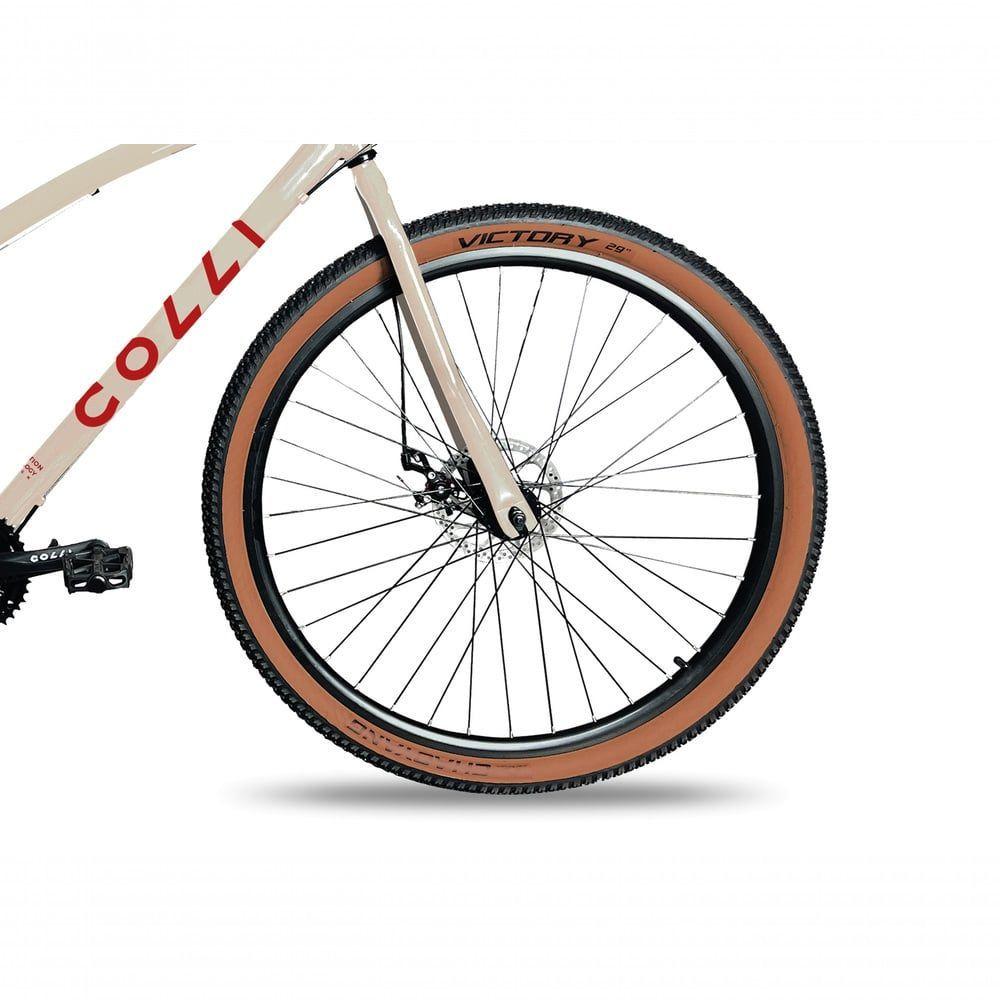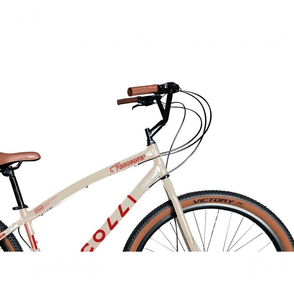Bicicleta Aro 29 Colli Vancouver Confort 21 Marchas Freio A Disco Bege RetrôSe você é apaixonado pelo ciclismo ou quer apenas uma bicicleta prática e funcional para o dia a dia, a Bicicleta Colli Vancouver Confort é perfeita para isso. Com componentes de alta qualidade, esta bicicleta é ideal tanto para passeios urbanos quanto para trilhas moderadas. Confira mais detalhes:Componentes de Alta QualidadeA Bicicleta Colli Vancouver Confort é projetada para proporcionar conforto e desempenho superior. Com uma combinação de componentes de alta qualidade. Com aro 29 aero com 36 furos, ela conta com freio a disco e um câmbio dianteiro 31.8mm com puxada por cima para coroas de até 42 dentes. O pedal Stone 9/16, e o pedivela é triplo de aço, com tamanhos 24/34/42 garantem a máxima qualidade nos seus passeios. O selim é o Molise marrom Selle Royal, garantindo conforto durante o uso. Recomendado para pessoas a partir de 14 anos e suporta até 120 kg.Sobre a marca: qualidade Colli!A Colli atua na produção e comercialização de Bicicletas do uso adulto e infantil. Atualmente ela está localizada em Sarandi-PR e está no mercado desde 1986. Durante sua trajetória assumiu grandes parcerias, uma delas foi com a Renault Brasil. A partir disso, a Colli veio crescendo e sendo reconhecida cada vez mais, conquistando o mercado Nacional e Internacional. Seus produtos são reconhecidos pelo design sofisticado e pelo preço competitivo. A empresa tem a missão de incentivar adultos e crianças a buscar qualidade de vida e bem estar, através de atividades físicas.Características do Produto:Marca: ColliModelo: Vancouver confortAro: 29Marchas: SimQuantidades de marchas: 21 marchasFreio: A discoPedivela: Triplo aço 24/34/42Guidão: Aço beach 25.4x560Corrente: Corrente fina 1/2x3/32Pneus: 29 x 2.20Cesta: NãoParalamas: NãoSuporte para garrafa: NãoConteúdo da Embalagem:01 bicicletaAcessóriosManual de instruçõesDimensões do Produto:Altura: 118 cmLargura: 67 cmProfundidade: 192 cmPeso: 14,37 kgObservações:- Todos os produtos têm três (03) meses de garantia fornecida pelo fornecedor- As imagens são meramente ilustrativas, os objetos que ambientam as fotos não acompanham o produto.- Pode haver alguma diferença de tonalidade entre a foto e o produto, devido ao tratamento de imagens e a calibração do monitor- A entrega é realizada por transportadora, não nos responsabilizamos, no ato da entrega por desmontagens, subir escadas/elevadores ou transporte por guincho para apartamentos- Eventuais despesas são de responsabilidade do cliente- Confira as dimensões dos volumes e certifique-se de que passará normalmente por supostos elevadores, portas, escadas ou corredores- Ao receber a mercadoria, verifique as condições da embalagem, caso haja alguma avaria, entre em contato com nosso SAC- Nossa empresa não se responsabiliza pela montagem dos produtos, mas todos os produtos possuem manual de montagem. Recomendamos que a montagem seja feita por profissional de sua confiança.
