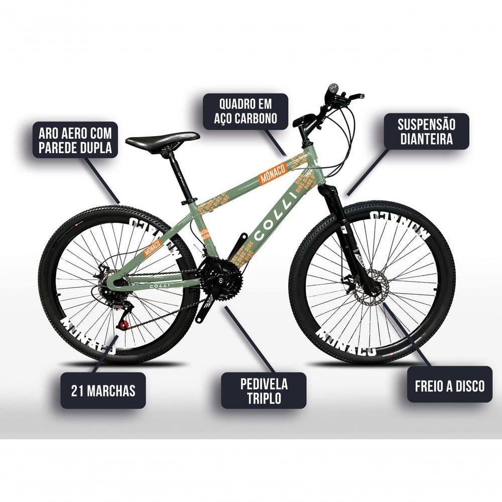Bicicleta Colli Mônaco Aro 26 Disco 21 V Rapid Fire Cor Vermelho Tamanho Do Quadro 13,5 Verde MilitarCom design robusto e moderno, a Bicicleta Colli Mônaco Aro 26 é perfeita para jovens e adultos que buscam desempenho e conforto. Seu quadro de 13,5? fabricado em aço carbono oferece resistência e durabilidade, enquanto a suspensão dianteira proporciona maior absorção de impactos em terrenos variados. Equipada com 21 marchas e câmbios Rapid Fire 3/7v, permite trocas rápidas e precisas, ideal para aventuras em trilhas ou deslocamentos urbanos.Com freios a disco mecânicos para maior segurança, aros aero de parede dupla e pneus 26x1.95, esta bike garante estabilidade e tração em qualquer percurso. Pesando 16,5 kg, é recomendada para usuários a partir de 12 anos, com altura entre 1,50 m e 1,75 m. Descubra o prazer de pedalar com a Colli Mônaco, uma bicicleta que une qualidade, estilo e eficiência para acompanhar o seu ritmo!CARACTERÍSTICAS GERAISMarca: ColliLinha: Colli MônacoModelo: MonacoIdade: CriançasAno: 2024Gênero: MasculinoCor: VermelhoMedidas:Altura: 85cmLargura: 69cmProfundidade: 150cmFREIOSTipo de freio dianteiro: A Disco MecânicoCÂMBIOSQuantidade de velocidades: 21Câmbios dianteiros: Shimano Tourney TZ510Câmbios traseiros: 7vAlavanca de câmbio: Rapid Fire 3/7vACESSÓRIOSCom pé de apoio: NãoInclui campainha: NãoCom para-lamas: NãoCom bagageiro: NãoCom protetor de corrente: NãoQUADROTamanho do quadro: 13.5Material do quadro: Aço carbonoESPECIFICAÇÕESAro: 26Peso: 16,5 kgPeso máximo suportado: 100 kgAltura mínima recomendada: 1,5 mAltura máxima recomendada: 1,75 mTipo de bicicleta: UrbanaMaterial dos pedais: AçoTipo de suspensão: DianteiraIdade mínima recomendada: 12 anosTipo de aro: Parede duplaMaterial do aro: AçoESTRUTURAÉ dobrável: NãoOUTROSModelo detalhado: MônacoCom impacto positivo: SimObservações:- Todos os produtos têm três (03) meses de garantia fornecida pelo fornecedor- As imagens são meramente ilustrativas, os objetos que ambientam as fotos não acompanham o produto.- Pode haver alguma diferença de tonalidade entre a foto e o produto, devido ao tratamento de imagens e a calibração do monitor- A entrega é realizada por transportadora, não nos responsabilizamos, no ato da entrega por desmontagens, subir escadas/elevadores ou transporte por guincho para apartamentos- Eventuais despesas são de responsabilidade do cliente- Confira as dimensões dos volumes e certifique-se de que passará normalmente por supostos elevadores, portas, escadas ou corredores- Ao receber a mercadoria, verifique as condições da embalagem, caso haja alguma avaria, entre em contato com nosso SAC- Nossa empresa não se responsabiliza pela montagem dos produtos, mas todos os produtos possuem manual de montagem. Recomendamos que a montagem seja feita por profissional de sua confiança.