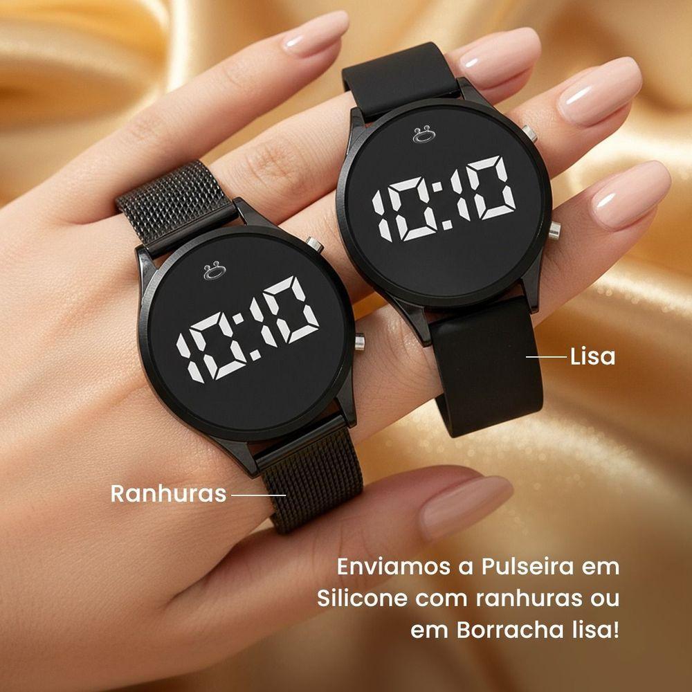 Relogio Digital Feminino Aço + Colar + Caixa + Brincos Presente Redondo Casual Preto Social Silicone