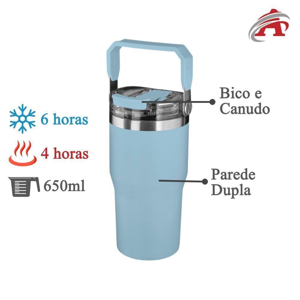 Garrafa Térmica De Aço Inox Azul Com Dupla Parede 650ml - Ideal Para Trabalho E AcademiaSeja no trabalho, na academia ou durante passeios, mantenha sua bebida sempre na temperatura ideal com esta garrafa térmica em aço inox de 650ml. Projetada para oferecer praticidade e durabilidade, ela combina um design moderno com funcionalidades que facilitam a sua rotina.- Conservação eficiente: A parede dupla de aço inox mantém a temperatura de sua bebida por mais tempo, seja quente ou fria.- Vedação perfeita: O anel de silicone garante que não haja vazamentos, oferecendo total segurança ao transportar a garrafa em bolsas ou mochilas.- Versatilidade ao beber: Com tampa rosqueável e opções de hidratação por canudo ou bico, ela se adapta ao seu momento.- Design prático: A alça em plástico torna o transporte simples e confortável, ideal para quem está sempre em movimento.Especificações do produto:Material: Aço InoxCapacidade: 650mlDimensões: 19,5 x 8,7 x 8,7cmContém: 1 Garrafa de 650ml