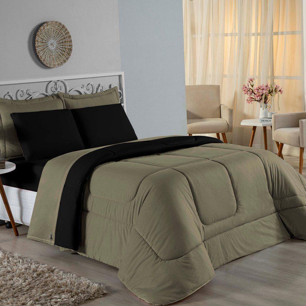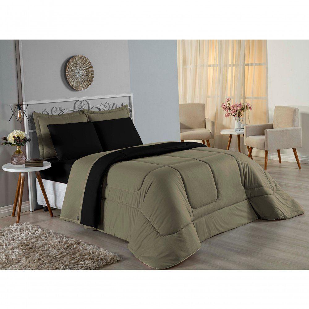 Kit Edredom Dupla Face + Jogo De Lençol Casal Nobre 6 Peças Malha 100% Algodão - Avelã / PretoTransforme seu quarto em um ambiente de descanso luxuoso com o Kit Cama Completa Casal Nobre 6 Peças. A união perfeita entre a praticidade do dia a dia e o conforto superior da malha 100% algodão fio penteado.Por que este Kit é uma ótima escolha?- Toque Extremamente Macio: A confecção em Malha 100% Algodão Fio 30/1 Penteado proporciona uma sensação suave e natural, ideal para quem valoriza o conforto da pele.- Visual Sofisticado: O edredom dupla face e os dois porta travesseiros matelados conferem volume e elegância à cama, dispensando composições difíceis.- Durabilidade Superior: O fio penteado garante um tecido resistente, que mantém a aparência de novo e não forma bolinhas (anti-pilling).- Ajuste Perfeito: O lençol de baixo com elástico abraça colchões de até 30cm de altura, mantendo a cama sempre organizada.Produto composto por (Total 06 Peças):Do Kit Edredom (03 Peças):01 Edredom Casal Dupla Face: 2,00m x 2,20m02 Porta Travesseiros Matelados: 50cm x 70cmDo Jogo de Lençol (03 Peças):01 Lençol de Baixo com Elástico: 1,38m x 1,98m x 30cm02 Fronhas: 70cm x 50cmAtenção: Este kit é composto pelo jogo de cama essencial (lençol com elástico e fronhas) e não inclui o lençol de cima (sobre lençol).Composição:Tecido (Todas as peças): Malha 100% Algodão - Fio 30/1 PenteadoEnchimento (Edredom e Porta Travesseiros): 100% Poliéster (Edredom com fibra siliconada)Forro (Apenas Porta Travesseiros): 100% Polipropileno