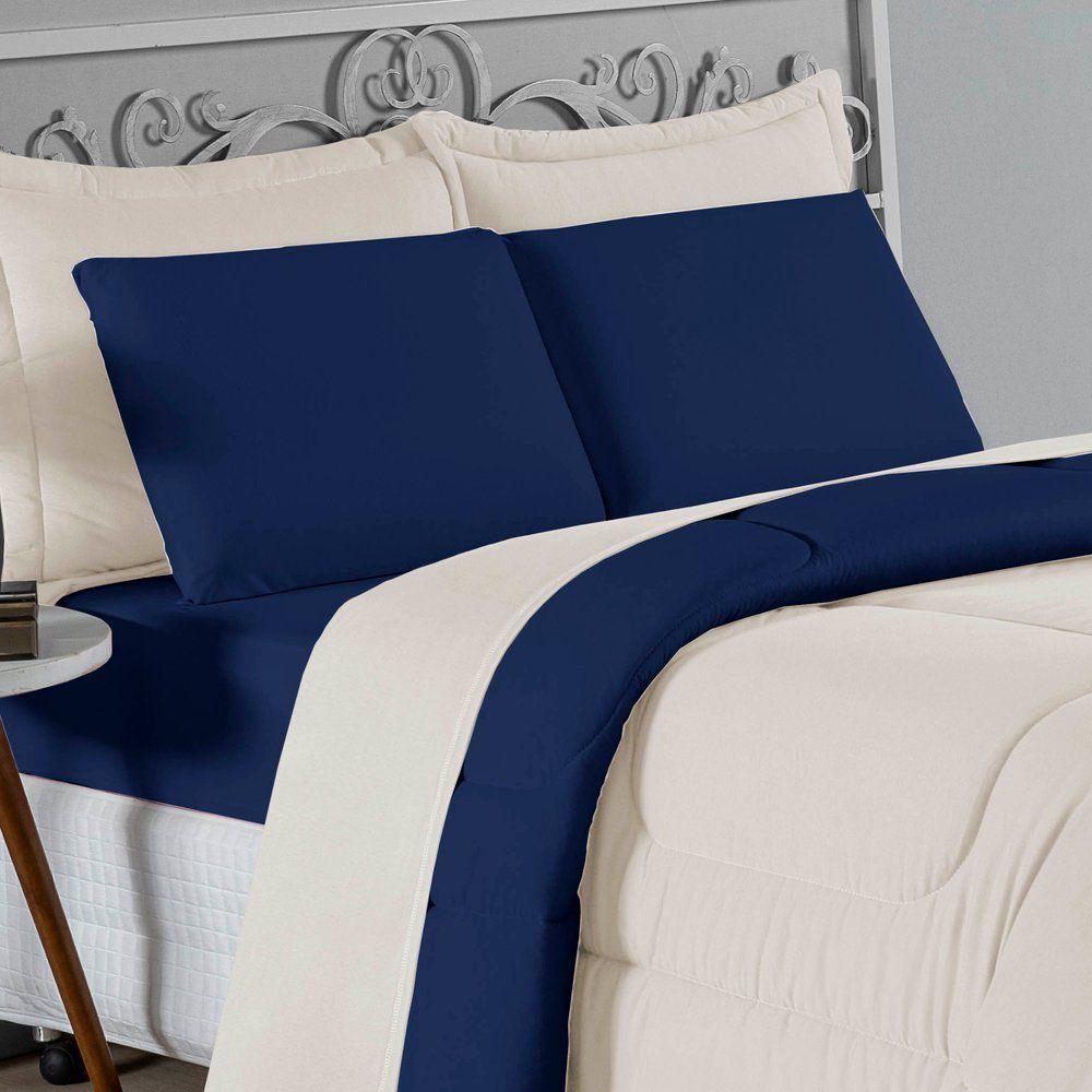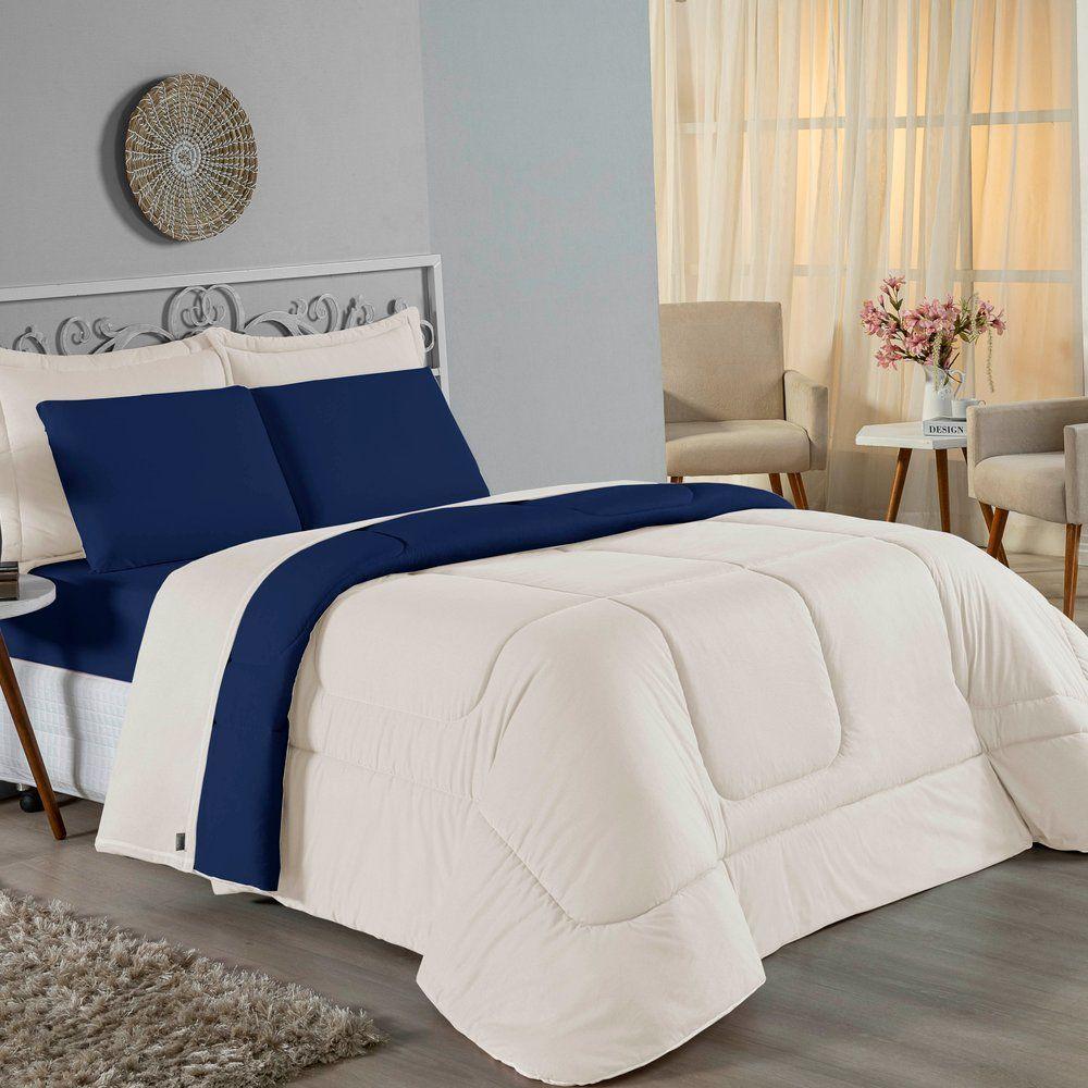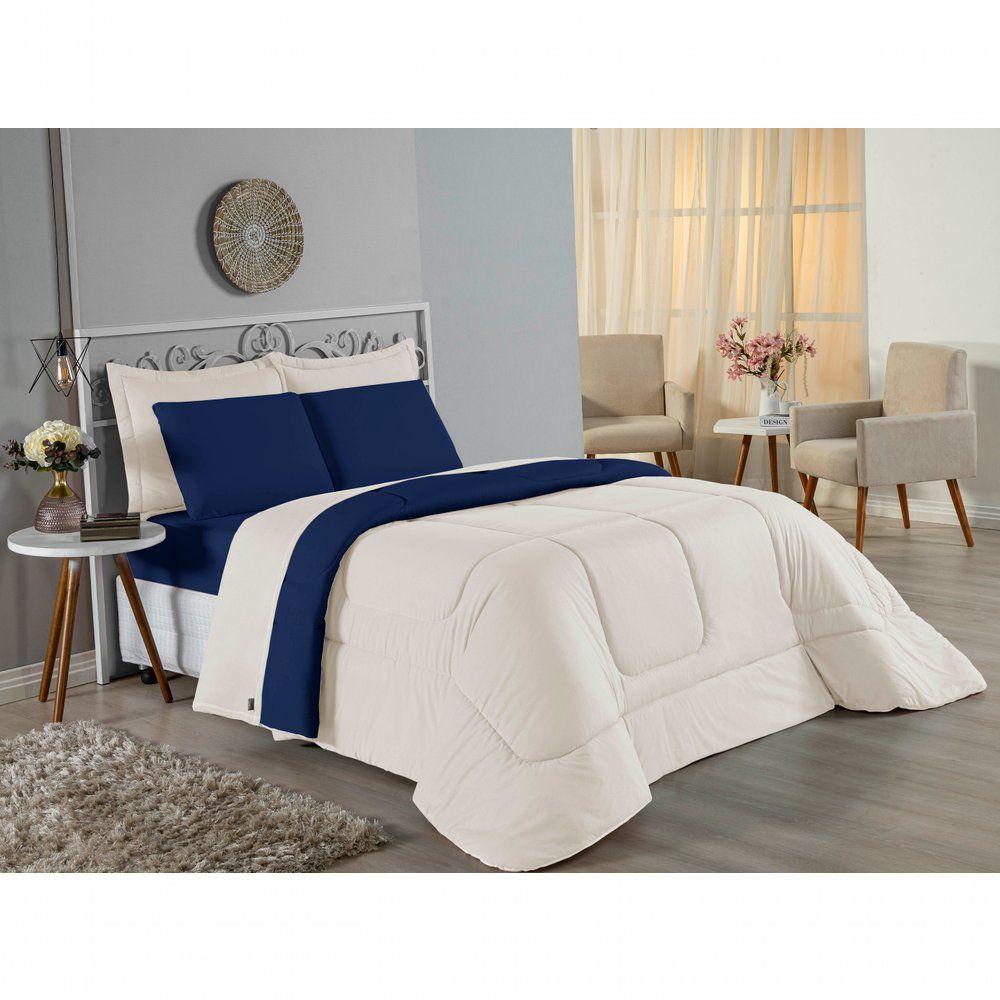 Kit Edredom Dupla Face + Jogo De Lençol Casal Nobre 6 Peças Malha 100% Algodão - Palha / Azul-marinhoTransforme seu quarto em um ambiente de descanso luxuoso com o Kit Cama Completa Casal Nobre 6 Peças. A união perfeita entre a praticidade do dia a dia e o conforto superior da malha 100% algodão fio penteado.Por que este Kit é uma ótima escolha?- Toque Extremamente Macio: A confecção em Malha 100% Algodão Fio 30/1 Penteado proporciona uma sensação suave e natural, ideal para quem valoriza o conforto da pele.- Visual Sofisticado: O edredom dupla face e os dois porta travesseiros matelados conferem volume e elegância à cama, dispensando composições difíceis.- Durabilidade Superior: O fio penteado garante um tecido resistente, que mantém a aparência de novo e não forma bolinhas (anti-pilling).- Ajuste Perfeito: O lençol de baixo com elástico abraça colchões de até 30cm de altura, mantendo a cama sempre organizada.Produto composto por (Total 06 Peças):Do Kit Edredom (03 Peças):01 Edredom Casal Dupla Face: 2,00m x 2,20m02 Porta Travesseiros Matelados: 50cm x 70cmDo Jogo de Lençol (03 Peças):01 Lençol de Baixo com Elástico: 1,38m x 1,98m x 30cm02 Fronhas: 70cm x 50cmAtenção: Este kit é composto pelo jogo de cama essencial (lençol com elástico e fronhas) e não inclui o lençol de cima (sobre lençol).Composição:Tecido (Todas as peças): Malha 100% Algodão - Fio 30/1 PenteadoEnchimento (Edredom e Porta Travesseiros): 100% Poliéster (Edredom com fibra siliconada)Forro (Apenas Porta Travesseiros): 100% Polipropileno