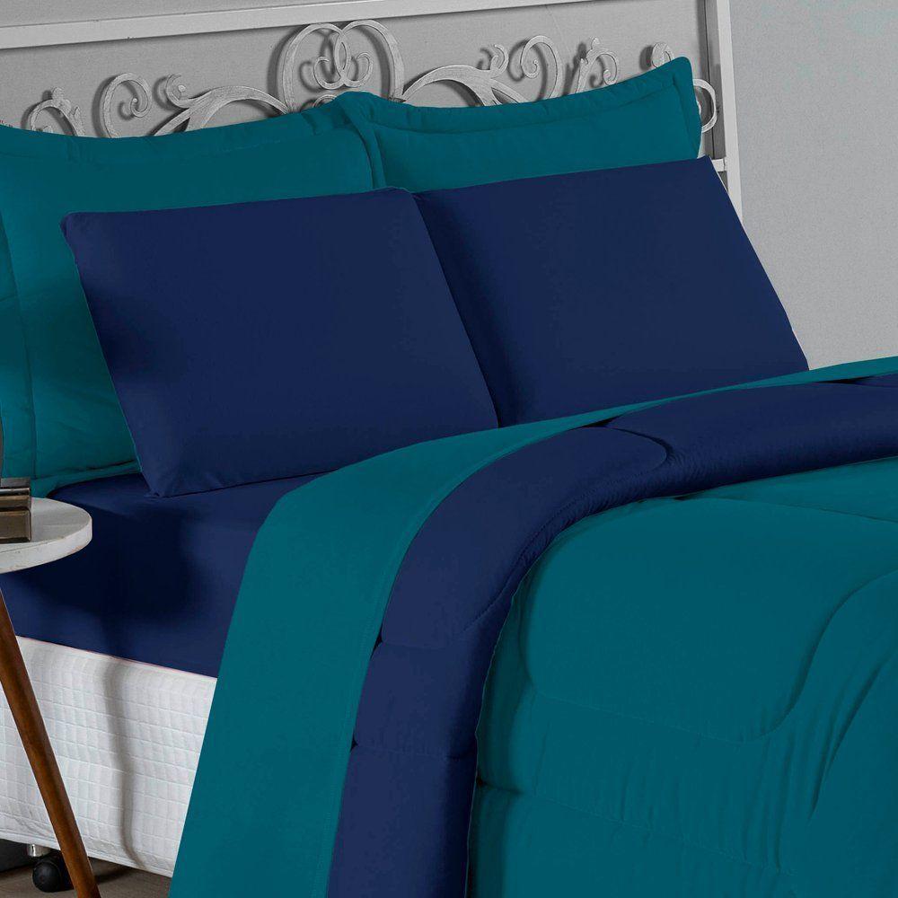 Kit Edredom Dupla Face + Jogo De Lençol Casal Nobre 6 Peças Malha 100% Algodão - Petróleo / Azul-marinhoTransforme seu quarto em um ambiente de descanso luxuoso com o Kit Cama Completa Casal Nobre 6 Peças. A união perfeita entre a praticidade do dia a dia e o conforto superior da malha 100% algodão fio penteado.Por que este Kit é uma ótima escolha?- Toque Extremamente Macio: A confecção em Malha 100% Algodão Fio 30/1 Penteado proporciona uma sensação suave e natural, ideal para quem valoriza o conforto da pele.- Visual Sofisticado: O edredom dupla face e os dois porta travesseiros matelados conferem volume e elegância à cama, dispensando composições difíceis.- Durabilidade Superior: O fio penteado garante um tecido resistente, que mantém a aparência de novo e não forma bolinhas (anti-pilling).- Ajuste Perfeito: O lençol de baixo com elástico abraça colchões de até 30cm de altura, mantendo a cama sempre organizada.Produto composto por (Total 06 Peças):Do Kit Edredom (03 Peças):01 Edredom Casal Dupla Face: 2,00m x 2,20m02 Porta Travesseiros Matelados: 50cm x 70cmDo Jogo de Lençol (03 Peças):01 Lençol de Baixo com Elástico: 1,38m x 1,98m x 30cm02 Fronhas: 70cm x 50cmAtenção: Este kit é composto pelo jogo de cama essencial (lençol com elástico e fronhas) e não inclui o lençol de cima (sobre lençol).Composição:Tecido (Todas as peças): Malha 100% Algodão - Fio 30/1 PenteadoEnchimento (Edredom e Porta Travesseiros): 100% Poliéster (Edredom com fibra siliconada)Forro (Apenas Porta Travesseiros): 100% Polipropileno