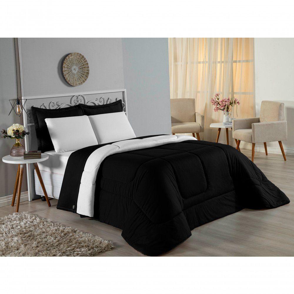 Kit Edredom Dupla Face + Jogo De Lençol Casal Nobre 6 Peças Malha 100% Algodão - Preto / Branco