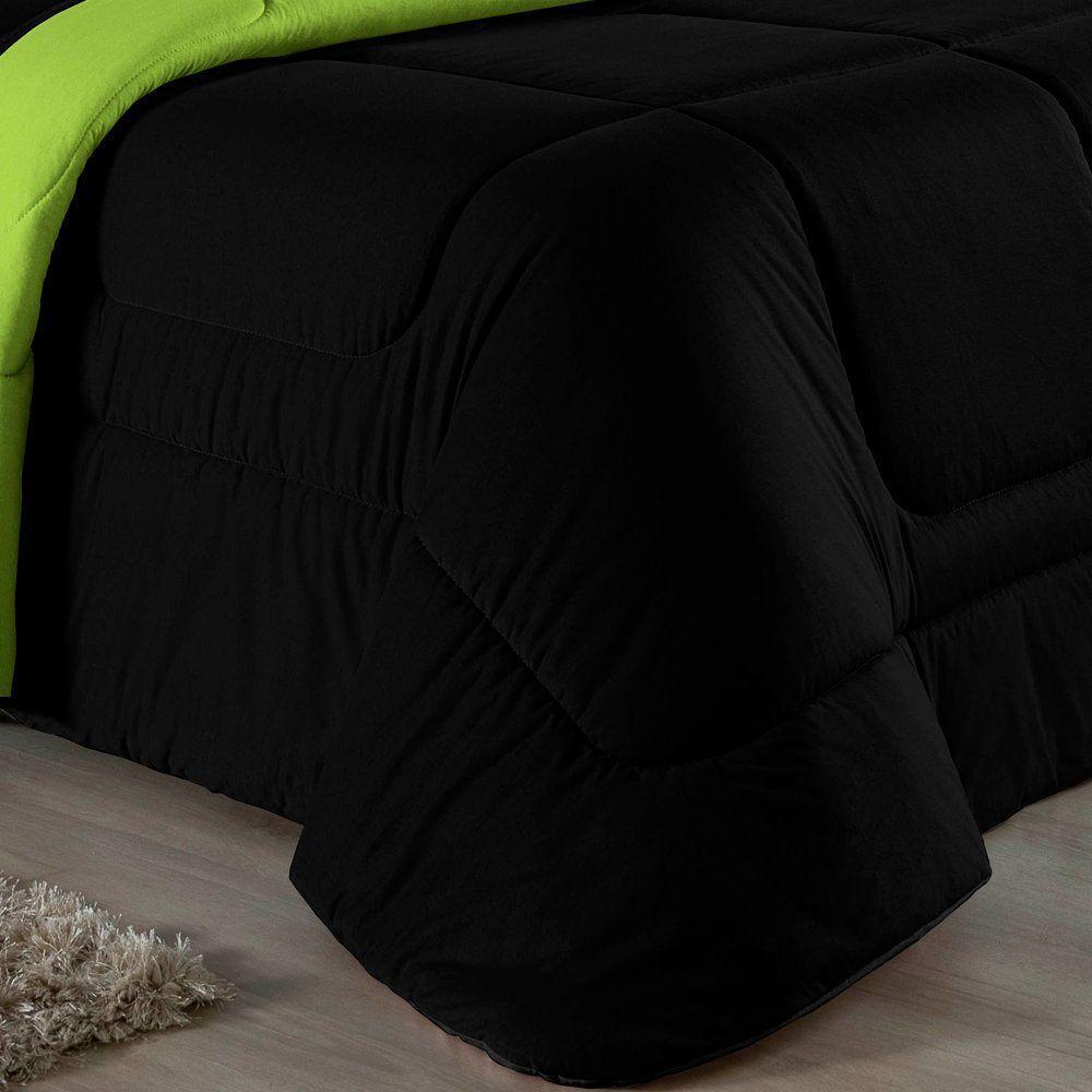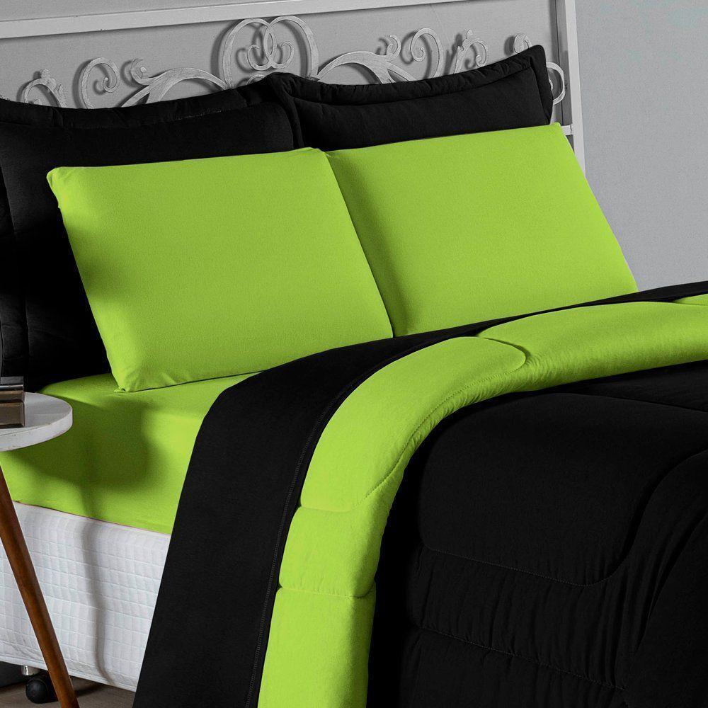 Kit Edredom Dupla Face + Jogo De Lençol Casal Nobre 6 Peças Malha 100% Algodão - Preto / Pistache