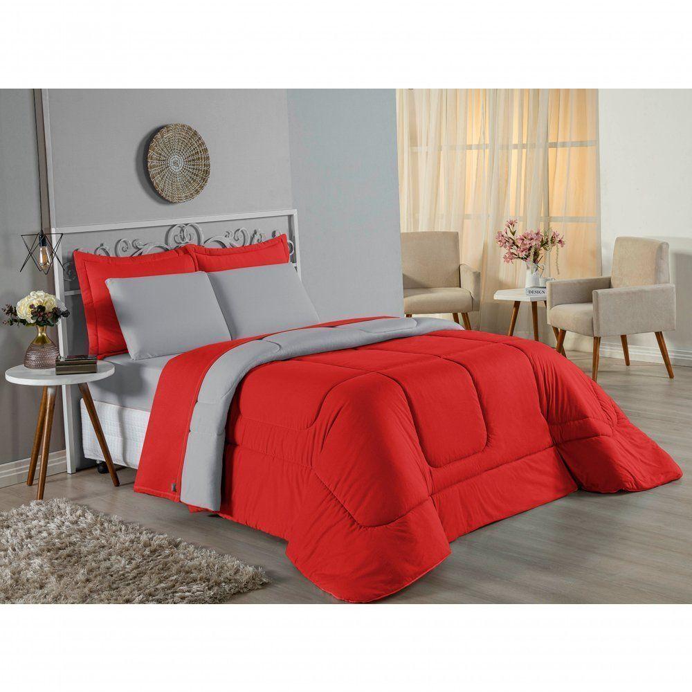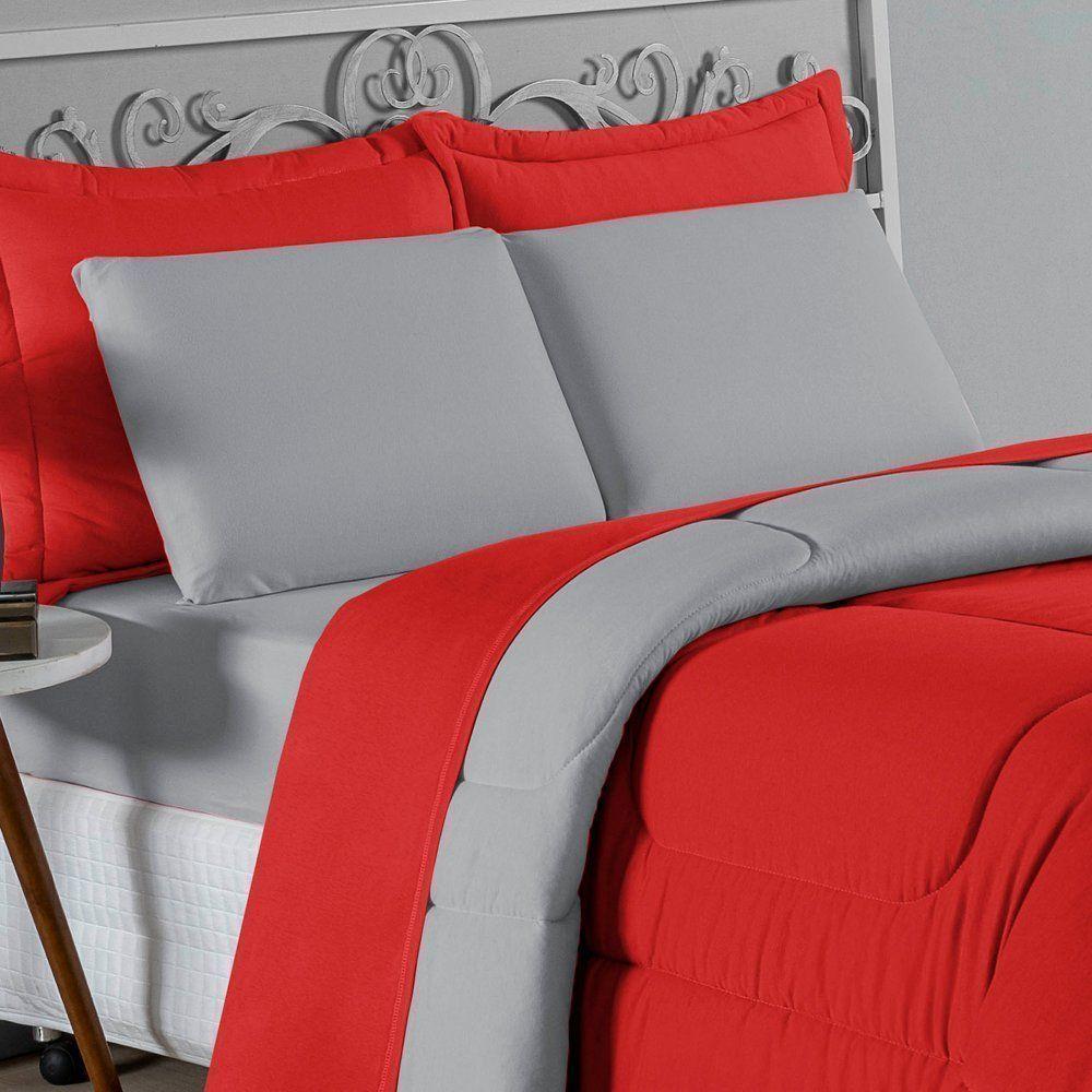 Kit Edredom Dupla Face + Jogo De Lençol Casal Nobre 6 Peças Malha 100% Algodão - Vermelho / CinzaTransforme seu quarto em um ambiente de descanso luxuoso com o Kit Cama Completa Casal Nobre 6 Peças. A união perfeita entre a praticidade do dia a dia e o conforto superior da malha 100% algodão fio penteado.Por que este Kit é uma ótima escolha?- Toque Extremamente Macio: A confecção em Malha 100% Algodão Fio 30/1 Penteado proporciona uma sensação suave e natural, ideal para quem valoriza o conforto da pele.- Visual Sofisticado: O edredom dupla face e os dois porta travesseiros matelados conferem volume e elegância à cama, dispensando composições difíceis.- Durabilidade Superior: O fio penteado garante um tecido resistente, que mantém a aparência de novo e não forma bolinhas (anti-pilling).- Ajuste Perfeito: O lençol de baixo com elástico abraça colchões de até 30cm de altura, mantendo a cama sempre organizada.Produto composto por (Total 06 Peças):Do Kit Edredom (03 Peças):01 Edredom Casal Dupla Face: 2,00m x 2,20m02 Porta Travesseiros Matelados: 50cm x 70cmDo Jogo de Lençol (03 Peças):01 Lençol de Baixo com Elástico: 1,38m x 1,98m x 30cm02 Fronhas: 70cm x 50cmAtenção: Este kit é composto pelo jogo de cama essencial (lençol com elástico e fronhas) e não inclui o lençol de cima (sobre lençol).Composição:Tecido (Todas as peças): Malha 100% Algodão - Fio 30/1 PenteadoEnchimento (Edredom e Porta Travesseiros): 100% Poliéster (Edredom com fibra siliconada)Forro (Apenas Porta Travesseiros): 100% Polipropileno